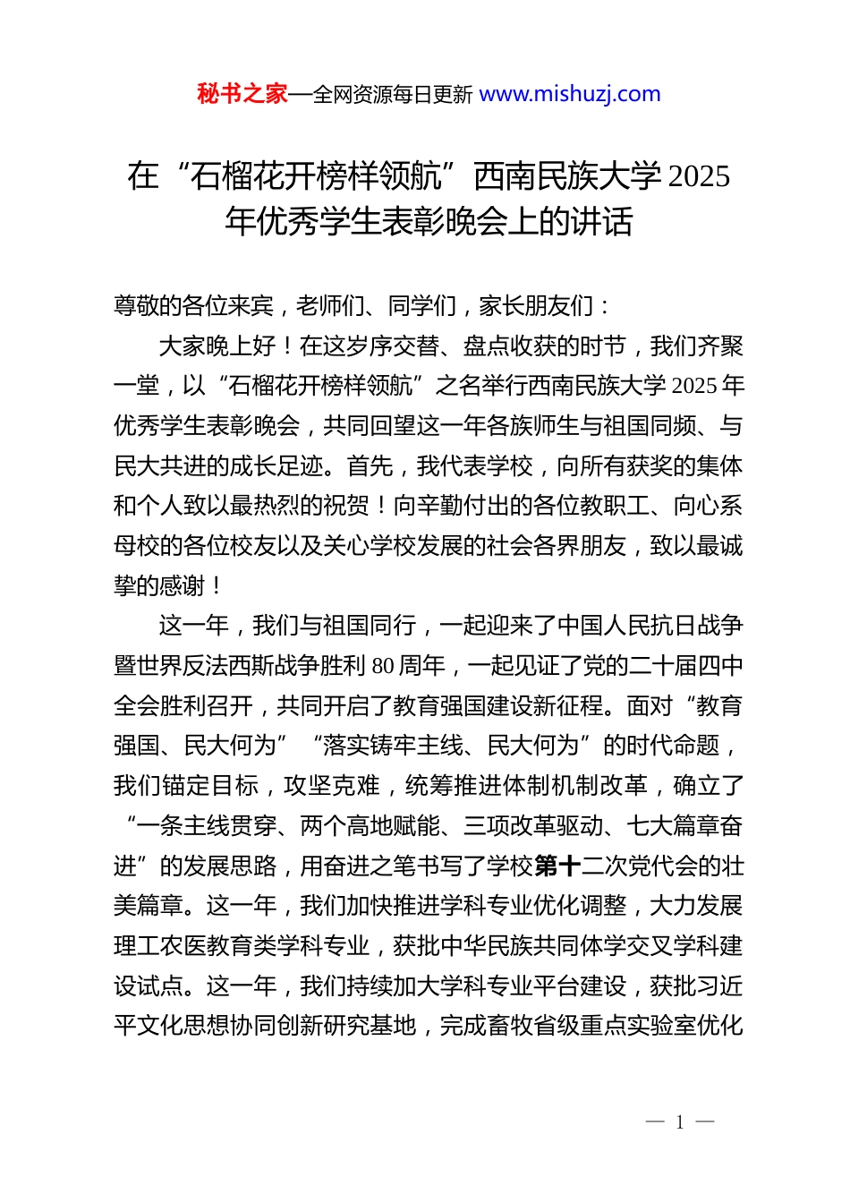 秘书之家—全网资源每日更新 www.mishuzj.com在“石榴花开榜样领航”西南民族大学 2025年优秀学生表彰晚会上的讲话尊敬的各位来宾,老师们、同学们,家长朋友们:大家晚上好!在这岁序交替、盘点收获的时节,我们齐聚一堂,以“石榴花开榜样领航”之名举行西南民族大学 2025 年优秀学生表彰晚会,共同回望这一年各族师生与祖国同频、与民大共进的成长足迹。首先,我代表学校,向所有获奖的集体和个人致以最热烈的祝贺!向辛勤付出的各位教职工、向心系母校的各位校友以及关心学校发展的社会各界朋友,致以最诚挚的感谢!这一年,我们与祖国同行,一起迎来了中国人民抗日战争暨世界反法西斯战争胜利 80 周年,一起见证了党的二十届四中全会胜利召开,共同开启了教育强国建设新征程。面对“教育强国、民大何为”“落实铸牢主线、民大何为”的时代命题,我们锚定目标,攻坚克难,统筹推进体制机制改革,确立了“一条主线贯穿、两个高地赋能、三项改革驱动、七大篇章奋进”的发展思路,用奋进之笔书写了学校第十二次党代会的壮美篇章。这一年,我们加快推进学科专业优化调整,大力发展理工农医教育类学科专业,获批中华民族共同体学交叉学科建设试点。这一年,我们持续加大学科专业平台建设,获批习近平文化思想协同创新研究基地,完成畜牧省级重点实验室优化— 1 —秘书之家—全网资源每日更新 www.mishuzj.com重组,若尔盖野外观测站入选生态环保部野外观测站。这一年,全校上下一心,高质量完成本科教育教学审核评估,国家社科基金重大项目立项持续领跑,黄大年式教师团队的入选更加彰显出民大教师的作为与担当。正如校友饶江华登上珠峰之巅后发出的感慨,每一次跨越都源于蓄力的坚守,每一步前行都饱含破局的勇气。这一年,同学们牢记总书记嘱托,笃行不怠,获得了 1123项省级以上的学科竞赛奖励;你们驰骋赛场,斩获中国大学生篮球联赛全国亚军;你们勇于接受挑战,一次次集体服务世运会等重大赛事活动,西南民族大学这个闪光的名字因为你们而光彩夺目。更难能可贵的是,同学们矢志不渝践行“铸牢中华民族共同体意识”青春誓言,铸牢宣讲团的足迹已经遍布巴蜀大地,小迪道中华工作室的作品以亿万点击量获得广泛认同,格桑花支教团接续奋斗 10 余载绽放于雪域高原。今天,我们表彰的不只是成绩单上的数字,更是一次次成功的自我突破;不只是聚光灯下的荣光,更是奋斗者的集体担当;不只是此时此刻的绽放,更是面向未来的告白。我们从来不缺少优秀,我们只是希望有更多的优秀。老师们,同学们,新一轮科技革命浪潮正扑面而来,人工智能重塑着知识传播的范式,“善教善学”的内涵也在发生着潜移默化的改变,我们追求“善教善学”,但我们更希望看到民大人人人出彩。对教师而言,我们在坚守三尺讲台的同时,— 2 —秘书之家—全网资源每日更新 www.mishuzj.com更要懂得沟通互动与人工智能的作用;对同学们而言,我们既要深耕专业夯实基础,更要勇于跨界交叉,让探索与创新成为我们最鲜明的品格。我们生活在一个伟大的时代,我们有幸相识于民大这个大家庭,人生之路不尽相同,但只要不懈奋斗,我相信,我们每一个人都会在民族复兴的时代浪潮中找到自己的坐标,都会绽放出别样的精彩。老师们,同学们,乘风破浪潮头立,扬帆起航正当时!有信念、有梦想、有奋斗、有奉献的人生,才是有意义的人生。今天,我们拥有和平,但要珍惜和平的来之不易,我们要向那些“沉默的荣耀”致敬;我们拥有安全,但要看到安全的弥足珍贵,世界上有多少国家已经安放不下一个安静的书桌;我们建设中华民族共同体,但要深刻认识到中华民族正经历百年变局的严峻考验。希望我们每一名民大人都能胸怀国之大者,与国家与民族同向同行,同呼吸共命运,为推进中国式现代化建设,实现中华民族伟大复兴做出新的更大贡献!最后,再一次向获奖者表示祝贺,预祝今天的表彰晚会取得圆满成功!谢谢大家!— 3 —