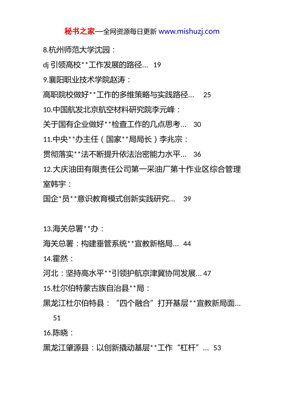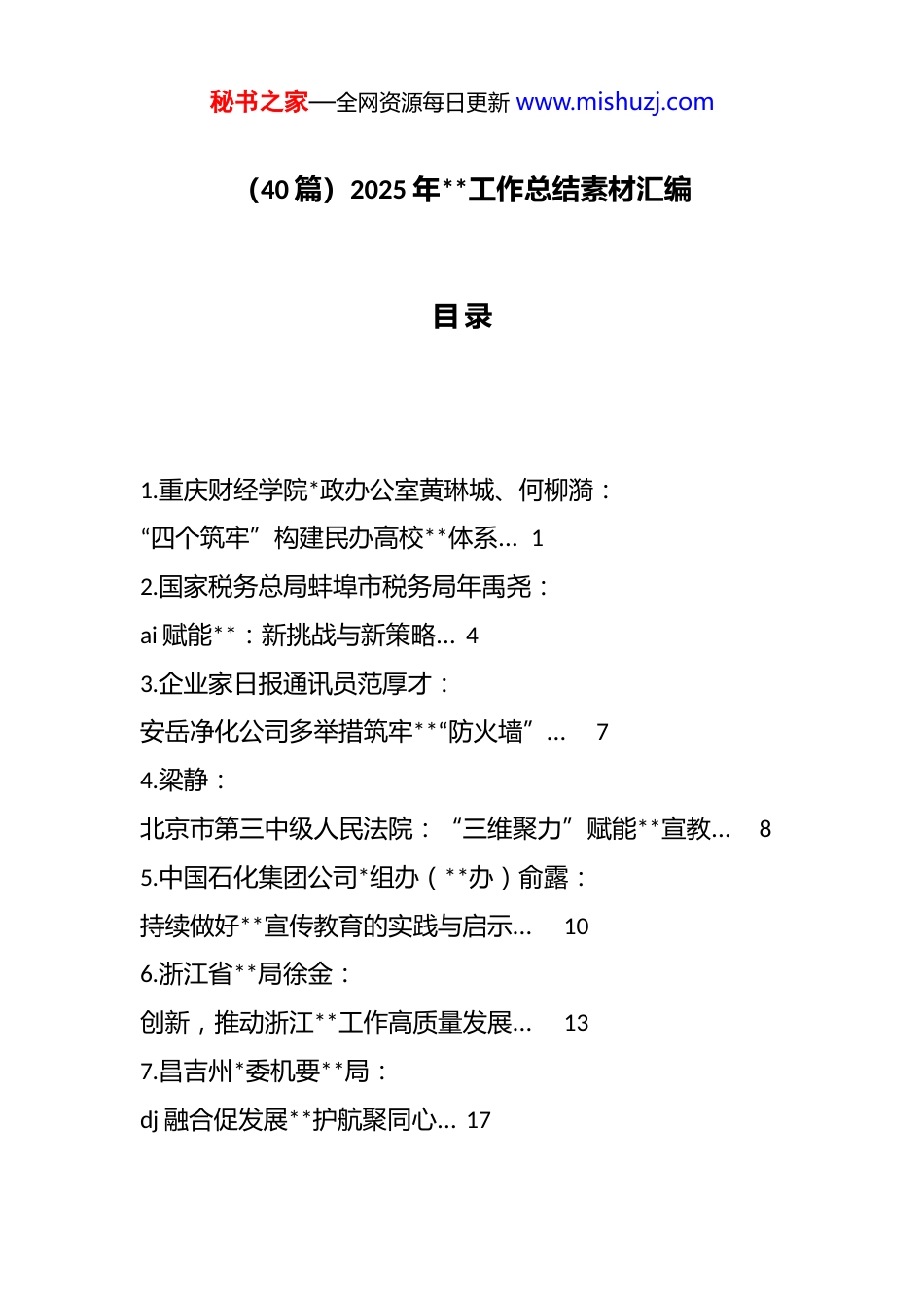 秘书之家—全网资源每日更新 www.mishuzj.com(40 篇)2025 年**工作总结素材汇编目 录1.重庆财经学院*政办公室黄琳城、何柳漪: “四个筑牢”构建民办高校**体系… 1 2.国家税务总局蚌埠市税务局年禹尧: ai 赋能**:新挑战与新策略… 4 3.企业家日报通讯员范厚才: 安岳净化公司多举措筑牢**“防火墙”…7 4.梁静: 北京市第三中级人民法院:“三维聚力”赋能**宣教…8 5.中国石化集团公司*组办(**办)俞露: 持续做好**宣传教育的实践与启示…10 6.浙江省**局徐金: 创新,推动浙江**工作高质量发展…13 7.昌吉州*委机要**局: dj 融合促发展**护航聚同心… 17 秘书之家—全网资源每日更新 www.mishuzj.com8.杭州师范大学沈园: dj 引领高校**工作发展的路径… 19 9.襄阳职业技术学院赵涛: 高职院校做好**工作的多维策略与实践路径…25 10.中国航发北京航空材料研究院李元峰: 关于国有企业做好**检查工作的几点思考…30 11.中央**办主任(国家**局局长)李兆宗: 贯彻落实**法不断提升依法治密能力水平…36 12.大庆油田有限责任公司第一采油厂第十作业区综合管理室韩宇: 国企*员**意识教育模式创新实践研究…39 13.海关总署**办: 海关总署:构建垂管系统**宣教新格局… 44 14.霍然: 河北:坚持高水平**引领护航京津冀协同发展… 47 15.杜尔伯特蒙古族自治县**局: 黑龙江杜尔伯特县:“四个融合”打开基层**宣教新局面…51 16.陈晓: 黑龙江肇源县:以创新撬动基层**工作“杠杆”… 53 秘书之家—全网资源每日更新 www.mishuzj.com17.达洁: 湖北省委统战部:为精准化**实践探路径、做示范…54 18.郭婉: 鸡西市委办:以**之笔绘就*办工作“三原色”…57 19.周萍: 基层**干部如何更好地贯彻落实新**法… 59 20.吉林省**局: 吉林:以作风建设新成效赋能**工作提质增效… 63 21.叶茂: 吉林省政府办公厅:五个关键提升**工作实效… 65 22.北京电子科技学院刘崇瑞: 加快推进**工作从“管理”向“治理”转变…67 23.罗芳: 聚焦“三高三牢”构筑企业**屏障…70 24.昆明市**局局长房文利: 落实*管**责任探索深化实践路径… 74 25.徐尚乐: 内蒙古:“点线面”齐发力构筑北疆**防线…77 26.林存国、那洪雨: 破除“四个效应”推进央企**管理…80 秘书之家—全网资源每日更新 www.mishuzj.com27.中国软电件子评信测息中产心业发闫展晓研丽究院科技处王厚芹: 浅谈**管理的四个抓手…82 28.河南省委办公厅: 强化监督检查织密**管理“防护网”… 85 29.王汝杰: 秦皇岛:出实招求实效 架好**工作“连心桥”…88 30.何治明: 深圳龙岗:构建“四全体系”推动**管理精细化… 91 31.王汝杰: 石家庄:持续推动**宣教谋深、落细、抓实…93 32.中共连城县委办公室罗镇辉: 探索基层**管理体系的完善路径…96 33.朱勇: 退化边境管捏女江:“四抓四解决“破解垦层**建设难题…101 34.山西云时代事务中心有限公司孟炜朝: 新时代 dj 引领下**宣传工作创新路径研究… 104 35.北京建筑大学刘文硕: 新形势下高校机要**工作研究… 107 36.江西省委**办主任(省**局局长)任丽民: 秘书之家—全网资源每日更新 www.mishuzj.com以改革创新精神提升**工作的新质战斗力…112 37.浙江省委**办(省**局): 浙江:“组合拳”打出**宣教新局面… 116 38.李占伟、王强、石宏伟: 中国石油吉林油田公司:12345 工作法筑牢企业**防线118 39.宁夏同心农村商业银行股份有限公司张念: 筑牢**安全防线 护航农村商业银行发展… 122 40.中韩(武汉)石油化工有限公司章卉: 做好新形势下石化企业**工作的思考… 124 “四个筑牢”构建民办高校**体系重庆财经学院*政办公室黄琳城、何柳漪(2025 年 11 月 3 日)**工作是维护国家安全的重要基石,也是高校稳健发展的生命线。2025 年第 37 个全国**宣传教育月的主题为“共筑**防线,公民人人有责”。面对日益复杂的**形势和艰巨的**任务,高校作为为*育人、为国育才的主阵地,在深入秘书之家—全网资源每日更新 www.mishuzj....