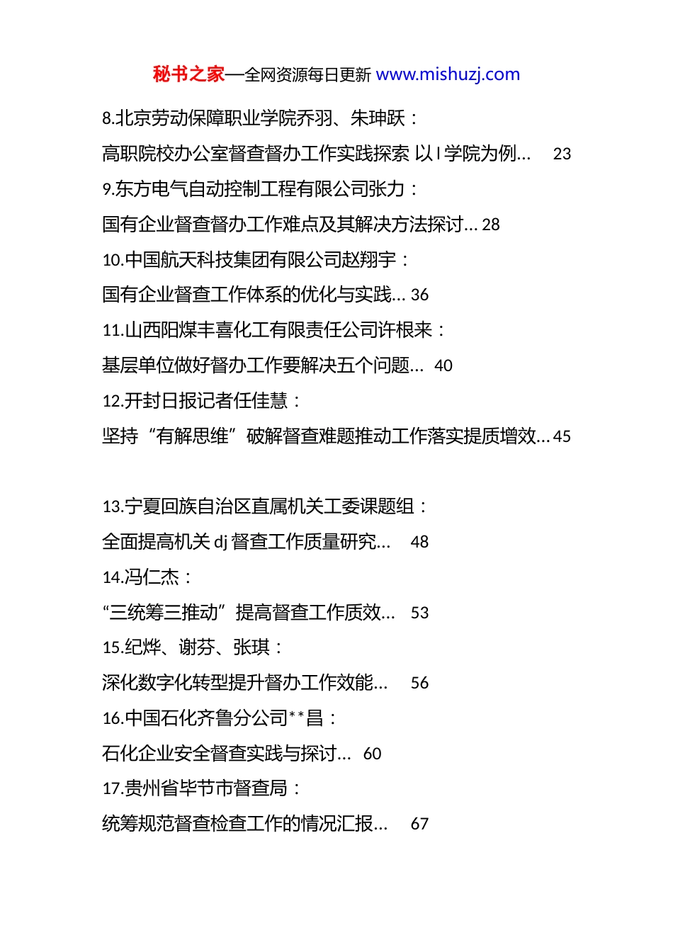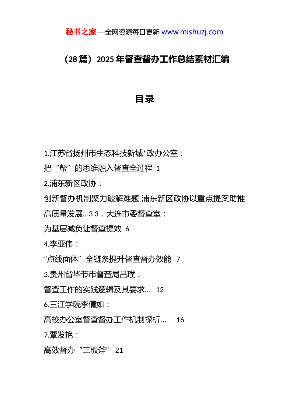 秘书之家—全网资源每日更新 www.mishuzj.com(28 篇)2025 年督查督办工作总结素材汇编目 录1.江苏省扬州市生态科技新城*政办公室: 把“帮”的思维融入督查全过程 1 2.浦东新区政协: 创新督办机制聚力破解难题 浦东新区政协以重点提案助推高质量发展…3 3.大连市委督查室: 为基层减负让督查提效 6 4.李亚伟: “点线面体”全链条提升督查督办效能 7 5.贵州省毕节市督查局吕璞: 督查工作的实践逻辑及其要求… 12 6.三江学院李倩如: 高校办公室督查督办工作机制探析…16 7.覃发艳: 高效督办“三板斧” 21 秘书之家—全网资源每日更新 www.mishuzj.com8.北京劳动保障职业学院乔羽、朱珅跃: 高职院校办公室督查督办工作实践探索 以 l 学院为例…239.东方电气自动控制工程有限公司张力: 国有企业督查督办工作难点及其解决方法探讨… 28 10.中国航天科技集团有限公司赵翔宇: 国有企业督查工作体系的优化与实践… 36 11.山西阳煤丰喜化工有限责任公司许根来: 基层单位做好督办工作要解决五个问题… 40 12.开封日报记者任佳慧: 坚持“有解思维”破解督查难题推动工作落实提质增效…4513.宁夏回族自治区直属机关工委课题组: 全面提高机关 dj 督查工作质量研究…48 14.冯仁杰: “三统筹三推动”提高督查工作质效…53 15.纪烨、谢芬、张琪: 深化数字化转型提升督办工作效能…56 16.中国石化齐鲁分公司**昌: 石化企业安全督查实践与探讨… 60 17.贵州省毕节市督查局: 统筹规范督查检查工作的情况汇报…67 秘书之家—全网资源每日更新 www.mishuzj.com18.惠州市第三人民医院廖瑞雪: 完善督办制度提升医院管理工作效率探究…71 19.河北省衡水市委办公室刘彦超: 现场督查要把准五对关系…77 20.赵安明: 新时代高等学校提升督查督办工作水平的思考与实践…7921.天津市委市级机关工委副书记、机关 dj 研究杂志社特约研究员刘丽: 新时代机关 dj 督查工作实践与思考…85 22.新疆维吾尔自治区*委直属机关工委课题组: 新时代机关 dj 督查工作探析…91 23.华北水利水电大学校长办公室龚之冰张建存: 新时代加强和改进高校督查督办工作的对策研究… 97 24.辽宁省直机关工委课题组: 新时代加强机关 dj 督查工作研究… 102 25.国网吉林省电力有限公司长春市城郊供电公司吕思潼: 以“三到位”督办机制为抓手全面提升综合部服务工作质效…108 26.黑河市政府办公室: 积极建设“四个体系”工作落实智慧管理平台112 秘书之家—全网资源每日更新 www.mishuzj.com27.冀中能源邢台矿业集团有限责任公司姜邱升: 以督查督办提升“三重一大”决策执行力…114 28.杨秀仁、郑强: 玉屏构建“131”督办体系依法处理矛盾纠纷…118 把“帮”的思维融入督查全过程江苏省扬州市生态科技新城*政办公室针对督查工作中存在的被动整改、协同不足、成果转化弱等痛点问题,江苏省扬州市生态科技新城*政办公室(简称“*政办”)秉持“督帮一体、以帮促办”理念,将“帮、服”贯穿督查全过程,推动重大事项更好落地落实。帮预防,促源头治理传统督查多依赖末端纠偏,难以实现风险源头防控。为此*政办构建“风险预判—防线前移—源头治理”的预防式督查体系,推动问题发现在早、处置在小。前置准入审查,建立政策合规、资源适配、风险可控“三单联审”机制,通过准入清单刚性约束、要素清单精准匹配、风险清单动态预警,对投资项目实现源头管控。量化进度预警,建立秘书之家—全网资源每日更新 www.mishuzj.com工程滞后风险值模型,量化评估项目滞后风险并分级预警夯实决策支撑,建立“专家库+案例库+数据库”支撑体系, 共享可复制经验、可调用资源。比如,集聚资源数据,研究形成有关组合策略, 精准扶持企业智改数转。帮协同,促落实增效职能部门面对综合性较强的工作时,常面临权责、资源、信息不匹配等困境。为此,*政办构建“难题共商—资源整合—成果共享”协同机制,帮助责任主体协同破题。搭建联动平台,建立“联诊共协商、联办共担当、联督共考量”的协调机制,成立督导组精准服务重点领域。强化要素保...