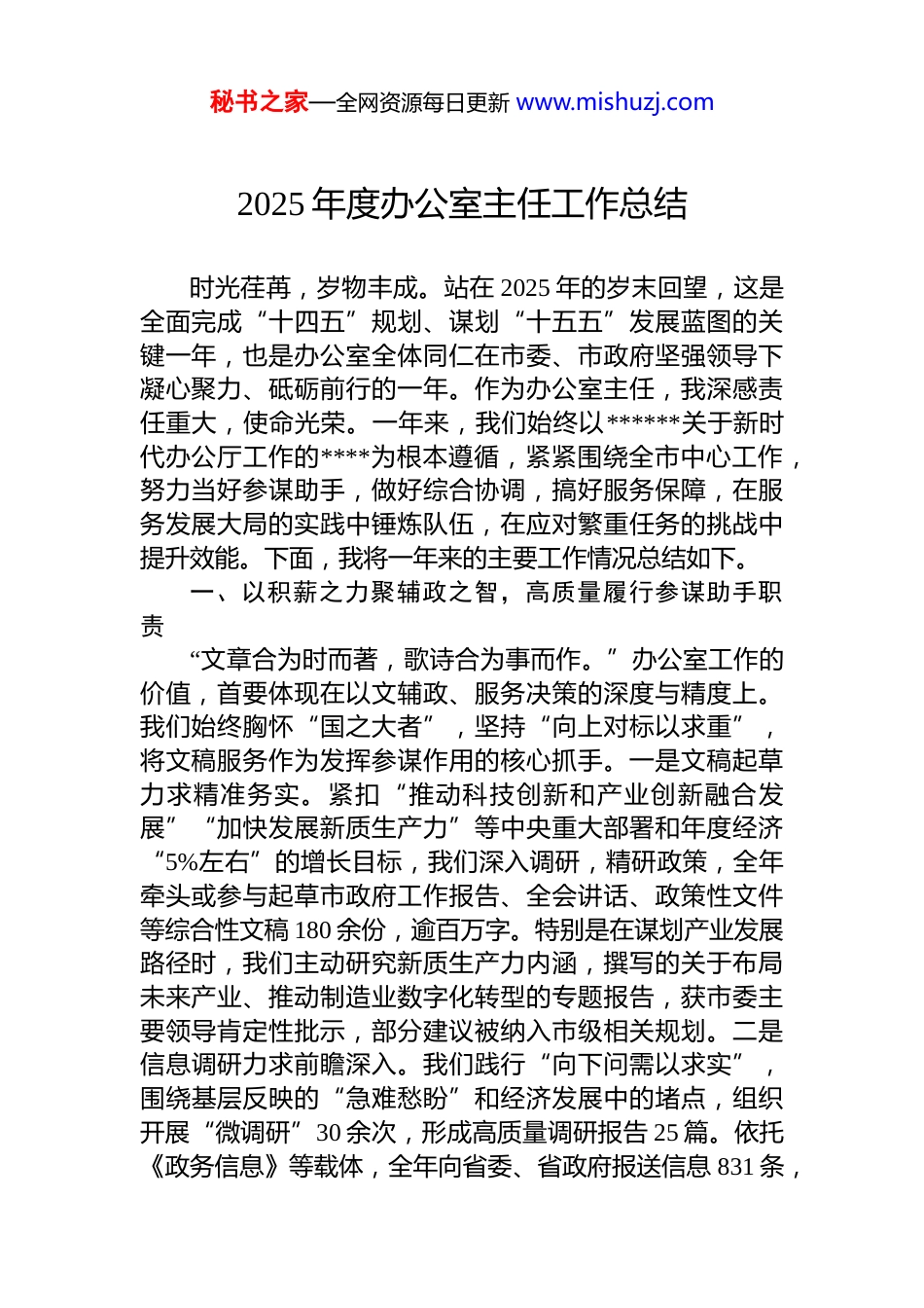 秘书之家—全网资源每日更新 www.mishuzj.com2025 年度办公室主任工作总结时光荏苒,岁物丰成。站在 2025 年的岁末回望,这是全面完成“十四五”规划、谋划“十五五”发展蓝图的关键一年,也是办公室全体同仁在市委、市政府坚强领导下凝心聚力、砥砺前行的一年。作为办公室主任,我深感责任重大,使命光荣。一年来,我们始终以******关于新时代办公厅工作的****为根本遵循,紧紧围绕全市中心工作,努力当好参谋助手,做好综合协调,搞好服务保障,在服务发展大局的实践中锤炼队伍,在应对繁重任务的挑战中提升效能。下面,我将一年来的主要工作情况总结如下。一、以积薪之力聚辅政之智,高质量履行参谋助手职责“文章合为时而著,歌诗合为事而作。”办公室工作的价值,首要体现在以文辅政、服务决策的深度与精度上。我们始终胸怀“国之大者”,坚持“向上对标以求重”,将文稿服务作为发挥参谋作用的核心抓手。一是文稿起草力求精准务实。紧扣“推动科技创新和产业创新融合发展”“加快发展新质生产力”等中央重大部署和年度经济“5%左右”的增长目标,我们深入调研,精研政策,全年牵头或参与起草市政府工作报告、全会讲话、政策性文件等综合性文稿 180 余份,逾百万字。特别是在谋划产业发展路径时,我们主动研究新质生产力内涵,撰写的关于布局未来产业、推动制造业数字化转型的专题报告,获市委主要领导肯定性批示,部分建议被纳入市级相关规划。二是信息调研力求前瞻深入。我们践行“向下问需以求实”,围绕基层反映的“急难愁盼”和经济发展中的堵点,组织开展“微调研”30 余次,形成高质量调研报告 25 篇。依托《政务信息》等载体,全年向省委、省政府报送信息 831 条,秘书之家—全网资源每日更新 www.mishuzj.com被采用超百条,信息工作持续位居全省前列,有效发挥了“千里眼”“顺风耳”作用。三是决策服务力求及时高效严格落实“第一议题”制度,动态梳理******最新重要讲话精神和*中央决策部署,结合本市实际形成分析建议,编制《政策速递与研判》内参 24 期,为领导科学决策提供了及时有力的参考,确保政令畅通、落实有力。二、以枢纽之功促协同之效,高效能保障政务运转顺畅“兵马未动,粮草先行;政务未启,协调已至。”办公室是承上启下、协调左右的枢纽,运转效率直接关系到政府工作的整体效能。我们着力在“谋篇用意,做到言之有序”上下功夫,确保各项工作条理清晰、推进有力。一是综合协调周密有序。全年统筹协调、服务保障市政府*组会、常务会、专题会议及重大活动逾千场次,均做到零差错、零失误。在服务“深化要素市场化配置改革、破除‘内卷式’竞争”等重大改革任务中,主动加强与相关部门的沟通衔接,明确责任分工,形成工作合力,保障了市委、市政府决策部署的顺利起步。二是督查督办动真碰硬。坚持“以督促改、以查促效”,围绕政府工作报告分解的 169 项具体任务、领导批示交办事项以及“十大攻坚战”等重点工作,建立台账,动态跟踪,销号管理。全年开展专项督查 40 余次,形成督查专报 20 期,推动解决项目落地、政策兑现等难点问题 58 个,确保各项工作“事事有回音、件件有着落”。三是运转保障规范高效。严格落实精文减会要求,全年以市政府及办公室名义印发的文件数量同比减少9%,会议数量减少 4.3%,切实为基层减负。优化值班应急流程,高效稳妥处置各类突发事件信息 1600 余条。高质量办理人大代表建议、政协提案 500 余件,办复率和满意率均达 100%,有力推动了民主政治建设。三、以磐石之志筑保障之基,高标准提升服务管理能级秘书之家—全网资源每日更新 www.mishuzj.com“天下难事,必作于易;天下大事,必作于细。”服务保障是办公室工作的基石,关系机关形象和队伍战斗力。我们致力于“磨石琢木,做到言之有度”,在精细化管理中提升保障水平。一是政治建设铸魂有力。将政治建设摆在首位,扎实开展 dj 学习教育,组织召开专题学习会、警示教育会 12 次,引导全办干部深刻领悟“两个确立”的决定性意义,筑牢忠诚干净担当的思想根基。办公室*支部创新 dj 模式,与挂点社区、乡村开展共建,解决基层...