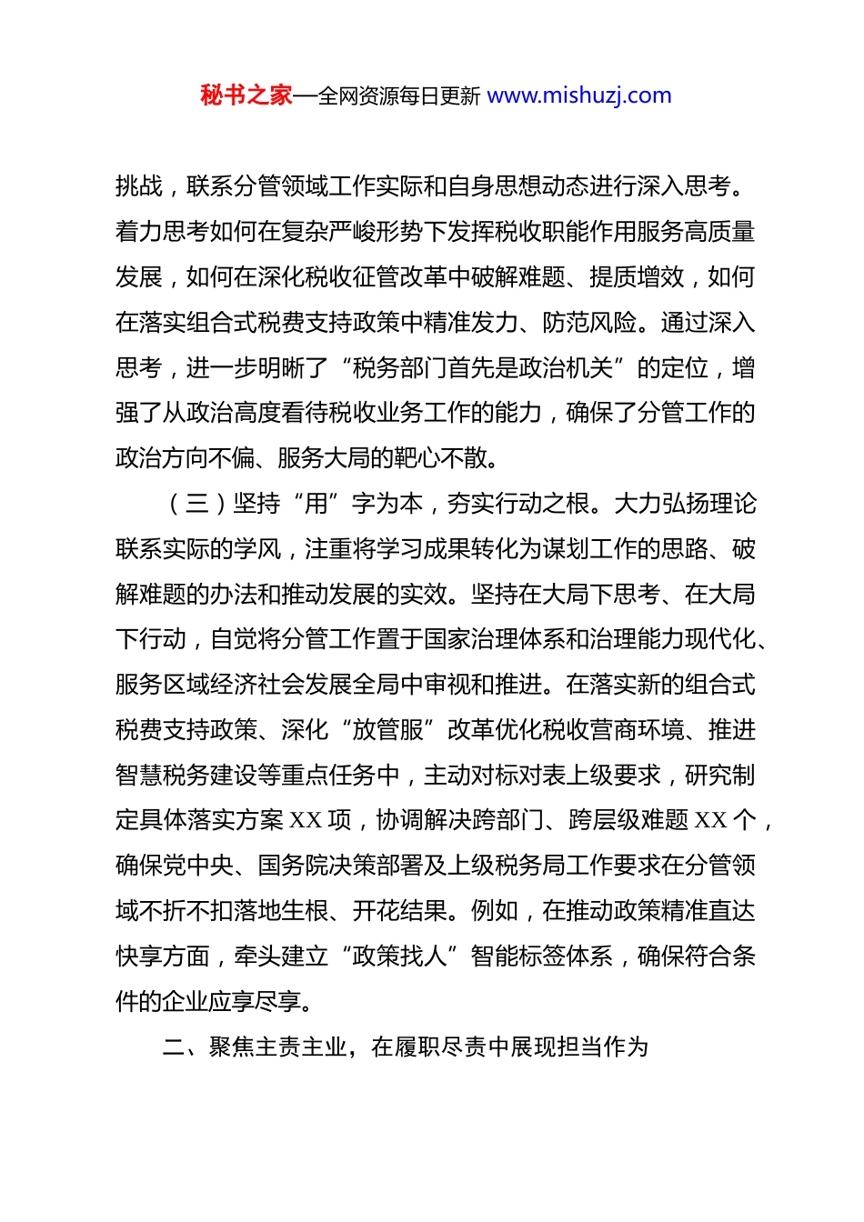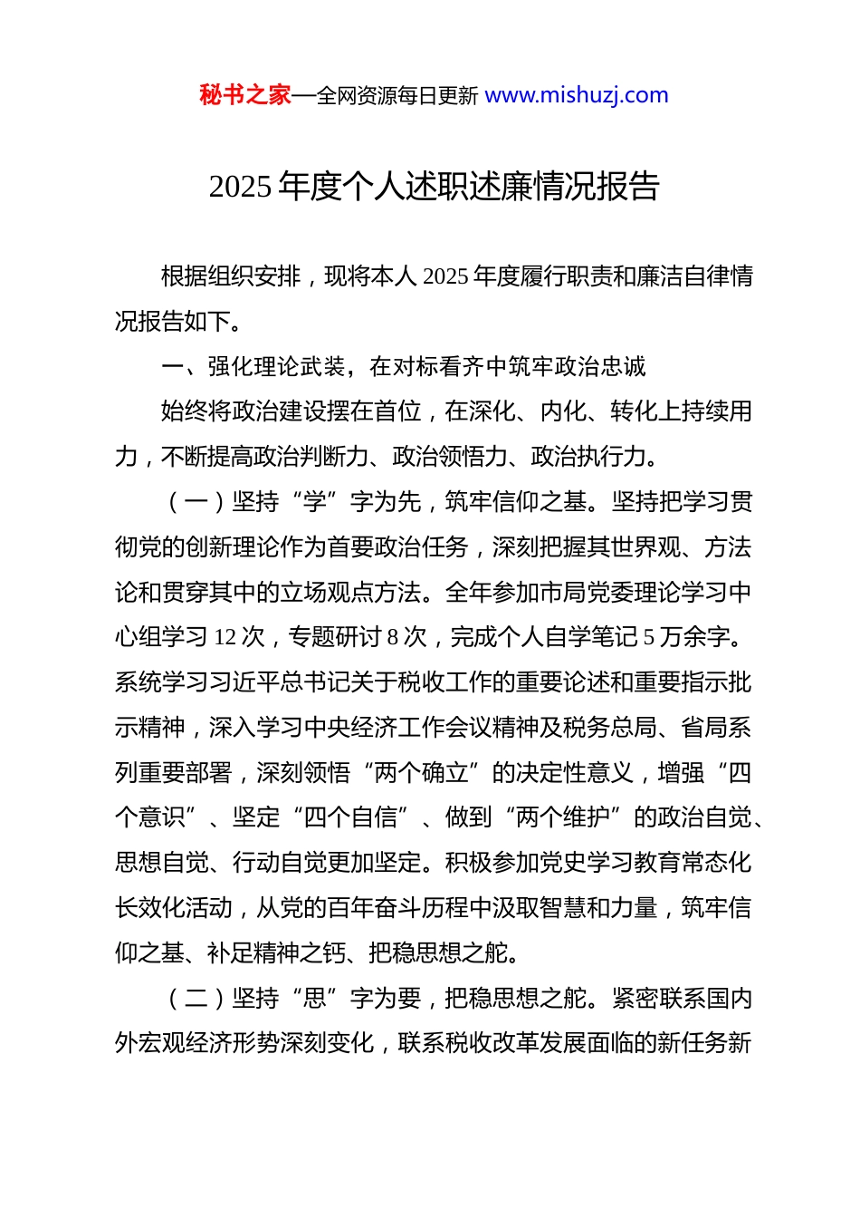 秘书之家—全网资源每日更新 www.mishuzj.com2025 年度个人述职述廉情况报告 根据组织安排,现将本人 2025 年度履行职责和廉洁自律情况报告如下。一、强化理论武装,在对标看齐中筑牢政治忠诚始终将政治建设摆在首位,在深化、内化、转化上持续用力,不断提高政治判断力、政治领悟力、政治执行力。(一)坚持“学”字为先,筑牢信仰之基。坚持把学习贯彻党的创新理论作为首要政治任务,深刻把握其世界观、方法论和贯穿其中的立场观点方法。全年参加市局党委理论学习中心组学习 12 次,专题研讨 8 次,完成个人自学笔记 5 万余字。系统学习习近平总书记关于税收工作的重要论述和重要指示批示精神,深入学习中央经济工作会议精神及税务总局、省局系列重要部署,深刻领悟“两个确立”的决定性意义,增强“四个意识”、坚定“四个自信”、做到“两个维护”的政治自觉、思想自觉、行动自觉更加坚定。积极参加党史学习教育常态化长效化活动,从党的百年奋斗历程中汲取智慧和力量,筑牢信仰之基、补足精神之钙、把稳思想之舵。(二)坚持“思”字为要,把稳思想之舵。紧密联系国内外宏观经济形势深刻变化,联系税收改革发展面临的新任务新秘书之家—全网资源每日更新 www.mishuzj.com挑战,联系分管领域工作实际和自身思想动态进行深入思考。着力思考如何在复杂严峻形势下发挥税收职能作用服务高质量发展,如何在深化税收征管改革中破解难题、提质增效,如何在落实组合式税费支持政策中精准发力、防范风险。通过深入思考,进一步明晰了“税务部门首先是政治机关”的定位,增强了从政治高度看待税收业务工作的能力,确保了分管工作的政治方向不偏、服务大局的靶心不散。(三)坚持“用”字为本,夯实行动之根。大力弘扬理论联系实际的学风,注重将学习成果转化为谋划工作的思路、破解难题的办法和推动发展的实效。坚持在大局下思考、在大局下行动,自觉将分管工作置于国家治理体系和治理能力现代化、服务区域经济社会发展全局中审视和推进。在落实新的组合式税费支持政策、深化“放管服”改革优化税收营商环境、推进智慧税务建设等重点任务中,主动对标对表上级要求,研究制定具体落实方案 XX 项,协调解决跨部门、跨层级难题 XX 个,确保党中央、国务院决策部署及上级税务局工作要求在分管领域不折不扣落地生根、开花结果。例如,在推动政策精准直达快享方面,牵头建立“政策找人”智能标签体系,确保符合条件的企业应享尽享。二、聚焦主责主业,在履职尽责中展现担当作为秘书之家—全网资源每日更新 www.mishuzj.com紧紧围绕税收现代化服务中国式现代化这一主题,恪尽职守,锐意进取,努力推动分管各项工作取得新进展、实现新突破。(一)聚焦组织收入中心,在服务大局上“求实效”。始终坚持依法依规组织税费收入的原则,科学研判经济税源形势,加强收入统筹调度和质量监控。面对经济下行压力和结构性减税降费影响,带领分管部门深入重点税源企业调研 XX 次,召开收入形势分析会 XX 次,动态掌握税源变化。强化税收经济分析,撰写高质量分析报告 XX 篇,其中 X 篇获市委、市政府主要领导批示,为地方党委政府决策提供了有力参考。全年分管领域负责的税费收入在依法征收、应收尽收的前提下,实现了与经济发展相协调的增长,为地方财力保障和经济社会发展提供了坚实支撑。同时,坚决不收“过头税费”,切实维护纳税人缴费人合法权益。(二)聚焦征管改革攻坚,在破解难题上“出实招”。全力投身于深化税收征管改革,针对改革中的堵点、难点问题,敢于担当,勇于探索。牵头负责“以数治税”分类精准监管试点工作,推动建立“信用+风险”新型监管机制,构建了涵盖XX 个指标的风险识别模型,实现对不同风险等级纳税人的差异化管理和服务,既提高了监管精准度,又减少了对守法经营秘书之家—全网资源每日更新 www.mishuzj.com纳税人的打扰。针对发票电子化改革中的难点,组织攻关团队,优化流程,解决了 XX 个技术衔接和业务适配问题,推动全电发票平稳扩围。在优化税务执法方式上,推动落实“首违不罚”清单制度,推广运用说服教育、约谈警示等非强制性执法方式...