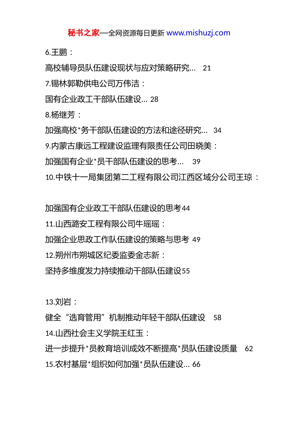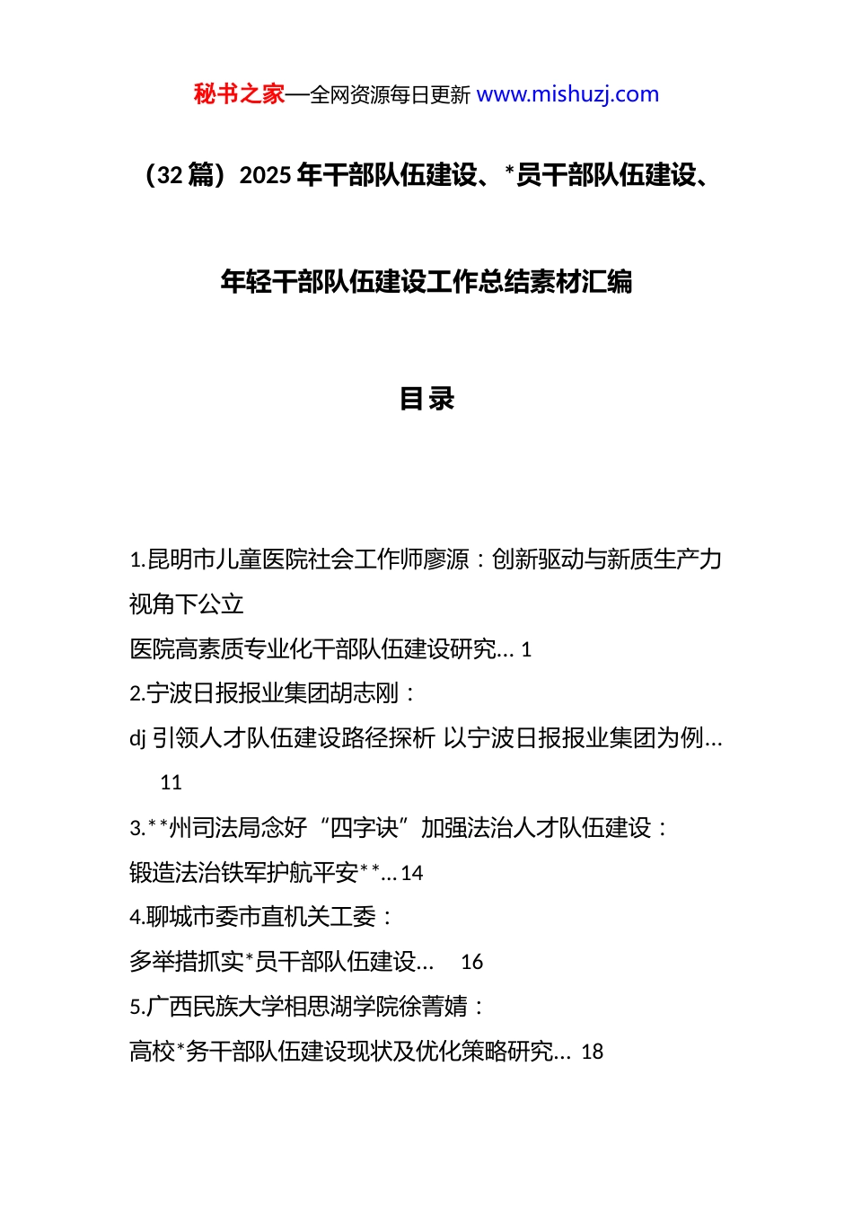 秘书之家—全网资源每日更新 www.mishuzj.com(32 篇)2025 年干部队伍建设、*员干部队伍建设、年轻干部队伍建设工作总结素材汇编目 录1.昆明市儿童医院社会工作师廖源:创新驱动与新质生产力视角下公立 医院高素质专业化干部队伍建设研究… 1 2.宁波日报报业集团胡志刚: dj 引领人才队伍建设路径探析 以宁波日报报业集团为例…11 3.**州司法局念好“四字诀”加强法治人才队伍建设: 锻造法治铁军护航平安**…14 4.聊城市委市直机关工委: 多举措抓实*员干部队伍建设…16 5.广西民族大学相思湖学院徐菁婧: 高校*务干部队伍建设现状及优化策略研究… 18 秘书之家—全网资源每日更新 www.mishuzj.com6.王鹏: 高校辅导员队伍建设现状与应对策略研究…21 7.锡林郭勒供电公司万伟洁: 国有企业政工干部队伍建设… 28 8.杨继芳: 加强高校*务干部队伍建设的方法和途径研究… 34 9.内蒙古康远工程建设监理有限责任公司田晓美: 加强国有企业*员干部队伍建设的思考…39 10.中铁十一局集团第二工程有限公司江西区域分公司王琼: 加强国有企业政工干部队伍建设的思考44 11.山西潞安工程有限公司牛瑶瑶: 加强企业思政工作队伍建设的策略与思考 49 12.朔州市朔城区纪委监委金志新: 坚持多维度发力持续推动干部队伍建设55 13.刘岩: 健全“选育管用”机制推动年轻干部队伍建设58 14.山西社会主义学院王红玉: 进一步提升*员教育培训成效不断提高*员队伍建设质量6215.农村基层*组织如何加强*员队伍建设… 66 秘书之家—全网资源每日更新 www.mishuzj.com16.“四维发力”构建全周期培养体系… 68 17.中国武夷实业股份有限公司肖方鸿: 浅析新形势下国有企业年轻干部队伍建设 70 18.大庆油田水务环保公司制水二公司(大庆水库管理处)*委副书记孙月: 三项举措抓实基层企业*员干部队伍建设76 19.上海市财政局: 上海:坚持政治统领健全培养机制持续加力推进年轻干部队伍建设……79 20.河南省社会科学院王峥: 为国有工业企业干部队伍建设装上“ai 引擎”83 21.规划总院人力资源部副主任、*委组织部副部长纪芳: “五维”发力强化干部队伍建设86 22.中国移动通信集团天津有限公司纪晓青: 新时代背景下 dj 引领国企人才队伍建设的思考…91 23.张韵明: 新时代干部队伍建设的具体要素探析94 24.漯河职业技术学院杨曦:新时代高职院校以教育家精神引领教师队伍 建设的现实问题及路径分析… 97 25.江西江煤电力有限公司张文奇: 新时代国企政工干部队伍建设的困境与突破…103 秘书之家—全网资源每日更新 www.mishuzj.com26.山西路桥第三工程有限公司崔文: 新时代国有企业政工队伍建设与能力提升研究… 105 27.刘海飞、陈恋念: 新时代加强高素质干部队伍建设举措、成效与经验…108 28.四川发展(控股)有限责任公司付冬梅: 新形势下加强国有企业*员队伍建设的路径与方法…121 29.中共潍坊市委组织部: 以强有力监督助力高素质干部队伍建设… 126 30.长兴县自然资源和规划局张子言、林笑一: 长兴县聚焦干部队伍建设 全力锻造高素质“五能”铁军…128 31.长春宽城三维发力推进队伍建设 131 32.铁道*校邵孟楠: 做好新时代年轻干部培养助力高素质干部队伍建设…133 创新驱动与新质生产力视角下公立医院高素质专业化干部队伍建设研究秘书之家—全网资源每日更新 www.mishuzj.com昆明市儿童医院社会工作师廖源全面建设社会主义现代化国家,全面推进中华民族伟大复兴,关键在*, 关键在人,关键在于建设一支堪当重任的高素质干部队伍。*的二十届三中全会通过的《中共中央关于进一步全面深化改革 推进中国式现代化的决定》中对提高干部现代化建设能力作出了重大部署:“健全常态化培训特别是基本培训机制,强化专业训练和实践锻炼,全面提高干部现代化建设能力。”[1]在公立医院,这一要求更具专业化与数字化内涵。创新是引领和推动新质生产力发展的主要动力,创新驱动的实质是人才驱动。[2]当前和今后一个时期,随着智慧医疗、远程诊疗、精准医学等新质生产力在医疗领域的蓬勃发展,公立医院干部不仅要...