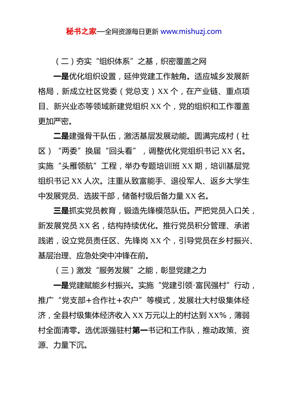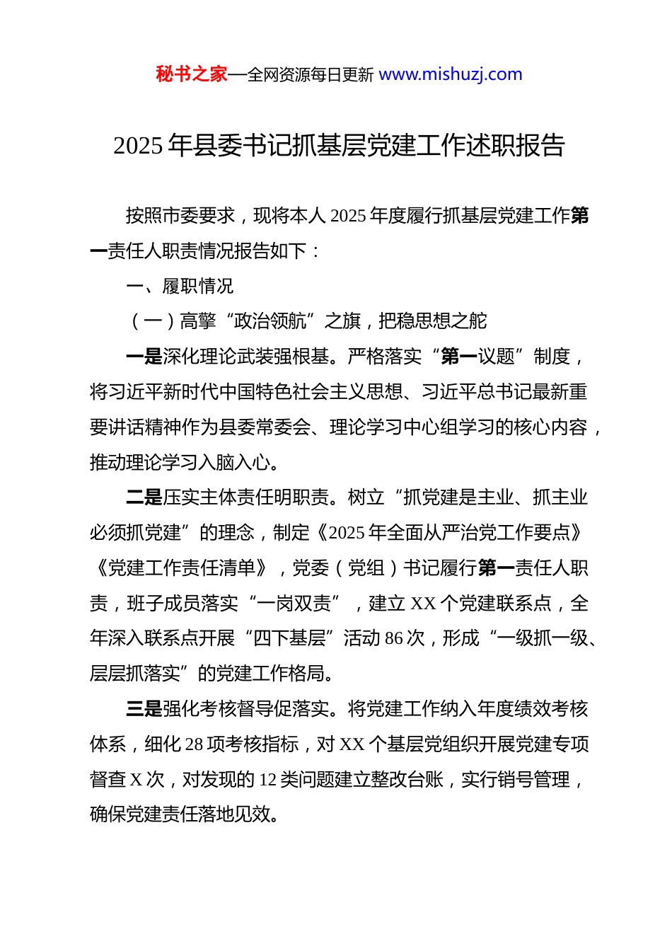 秘书之家—全网资源每日更新 www.mishuzj.com2025 年县委书记抓基层党建工作述职报告 按照市委要求,现将本人 2025 年度履行抓基层党建工作第一责任人职责情况报告如下:一、履职情况(一)高擎“政治领航”之旗,把稳思想之舵一是深化理论武装强根基。严格落实“第一议题”制度,将习近平新时代中国特色社会主义思想、习近平总书记最新重要讲话精神作为县委常委会、理论学习中心组学习的核心内容,推动理论学习入脑入心。二是压实主体责任明职责。树立“抓党建是主业、抓主业必须抓党建”的理念,制定《2025 年全面从严治党工作要点》《党建工作责任清单》,党委(党组)书记履行第一责任人职责,班子成员落实“一岗双责”,建立 XX 个党建联系点,全年深入联系点开展“四下基层”活动 86 次,形成“一级抓一级、层层抓落实”的党建工作格局。三是强化考核督导促落实。将党建工作纳入年度绩效考核体系,细化 28 项考核指标,对 XX 个基层党组织开展党建专项督查 X 次,对发现的 12 类问题建立整改台账,实行销号管理,确保党建责任落地见效。秘书之家—全网资源每日更新 www.mishuzj.com(二)夯实“组织体系”之基,织密覆盖之网一是优化组织设置,延伸党建工作触角。适应城乡发展新格局,新成立社区党委(党总支)XX 个,在产业链、重点项目、新兴业态等领域新建党组织 XX 个,党的组织和工作覆盖更加严密。二是建强骨干队伍,激活基层发展动能。圆满完成村(社区)“两委”换届“回头看”,调整优化党组织书记 XX 名。实施“头雁领航”工程,举办专题培训班 XX 期,培训基层党组织书记 XX 人次。注重从致富能手、退役军人、返乡大学生中发展党员、选拔干部,储备村级后备力量 XX 名。三是抓实党员教育,锻造先锋模范队伍。严把党员入口关,新发展党员 XX 名,结构持续优化。推行党员积分管理、承诺践诺,设立党员责任区、先锋岗 XX 个,引导党员在乡村振兴、基层治理、应急处突中冲锋在前。(三)激发“服务发展”之能,彰显党建之力一是党建赋能乡村振兴。实施“党建引领·富民强村”行动,推广“党支部+合作社+农户”等模式,发展壮大村级集体经济,全县村级集体经济收入 XX 万元以上的村达到 XX%,薄弱村全面清零。选优派强驻村第一书记和工作队,推动政策、资源、力量下沉。秘书之家—全网资源每日更新 www.mishuzj.com二是党建引领基层治理。深化网格化党建,将党组织建在网格上,建立“社区党组织—网格党支部—楼栋党小组—党员中心户”组织架构。推广“红色议事厅”“民情恳谈会”等机制,全年化解矛盾纠纷 XX 余起,解决群众急难愁盼问题 XX项,党建引领下的共建共治共享格局基本形成。三是党建助推中心工作。设立重大项目临时党支部 XX 个,组织党员突击队攻坚克难。在优化营商环境、文明城市创建、生态环境保护等重点工作中,充分发挥党组织战斗堡垒和党员先锋模范作用,形成了“党旗飘在一线、堡垒筑在一线、党员冲在一线”的生动局面。二、主要问题(一)压力传导存在“边际递减”,责任落实有待强化。“抓好党建是最大政绩”的理念在少数基层党委(党组)中树得还不够牢固,存在“上热中温下冷”现象。一些党组织书记主责主业意识不强,习惯于“上传下达”“按部就班”,结合本地本单位实际创造性开展工作的思路不宽、办法不多。个别班子成员履行“一岗双责”不到位,对分管领域党建工作指导督促不够。党建考核“指挥棒”作用发挥尚不充分,结果运用与干部奖惩、任用挂钩不够紧密,导致一些责任落实打了折扣。(二)组织功能存在“虚化弱化”,政治引领有待提升。秘书之家—全网资源每日更新 www.mishuzj.com部分农村基层党组织领导核心作用发挥不充分,在引领产业发展、带领群众致富方面能力不足,“说话没人听、办事没人跟”的问题依然存在。少数机关事业单位党建与业务工作“两张皮”现象尚未根本解决,党建引领业务发展的融合机制不够顺畅。一些非公企业和社会组织党组织活动形式单一,吸引力和凝聚力不强,政治功能发挥受限。部分基层党组织组织生活程式化、表面化,批评和自我批评的武器运用不够,战斗性不足...