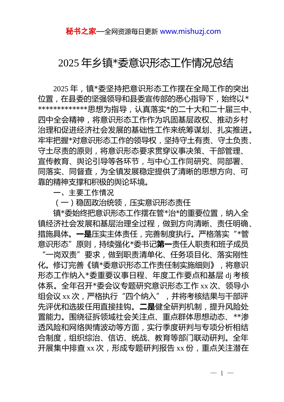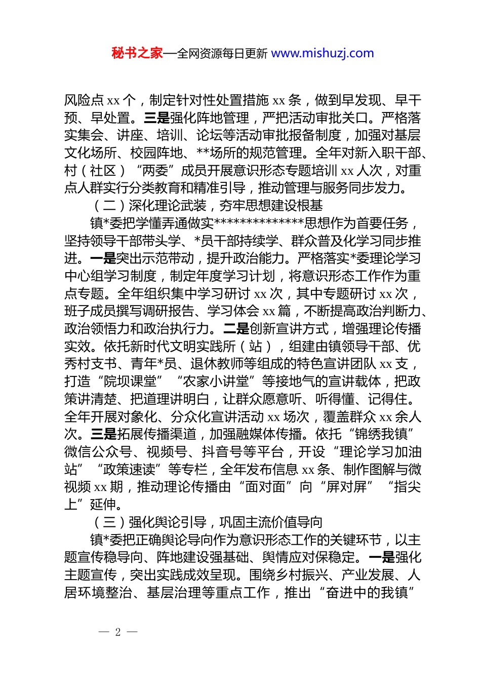 秘书之家—全网资源每日更新 www.mishuzj.com2025 年乡镇*委意识形态工作情况总结2025 年,镇*委坚持把意识形态工作摆在全局工作的突出位置,在县委的坚强领导和县委宣传部的悉心指导下,始终以**************思想为指导,认真落实*的二十大和二十届三中、四中全会精神,将意识形态工作作为巩固基层政权、推动乡村治理和促进经济社会发展的基础性工作来统筹谋划、扎实推进。牢牢把握*对意识形态工作的领导权,坚持守土有责、守土负责、守土尽责的原则,将意识形态要求贯穿议事决策、干部管理、宣传教育、舆论引导等各环节,与中心工作同研究、同部署、同落实、同督查,为全镇发展稳定提供了清晰的思想方向、可靠的精神支撑和积极的舆论环境。一、主要工作情况(一)稳固政治统领,压实意识形态责任镇*委始终把意识形态工作摆在管*治*的重要位置,纳入全镇经济社会发展和基层治理全过程,做到方向清晰、责任明确、措施具体。一是压实主体责任,完善制度执行。严格落实“*管意识形态”原则,持续强化*委书记第一责任人职责和班子成员“一岗双责”要求,做到职责清单化、任务项目化、落实刚性化。修订完善《镇*委意识形态工作责任制实施细则》,将意识形态工作纳入*委重要议事日程、年度工作要点和基层 dj 考核体系。全年召开*委会议专题研究意识形态工作 xx 次、领导小组会议 xx 次,严格执行“四个纳入”,并将考核结果与干部评先评优和选拔任用直接挂钩。二是健全研判机制,提升风险处置能力。围绕征拆领域社会关注点、重点群体思想动态、**渗透风险和网络舆情波动等方面,实行季度研判与专项分析相结合制度,组织综治、信访、统战、教育等部门联动研判。全年开展集中排查 xx 次,形成专题研判报告 xx 份,重点关注潜在— 1 —秘书之家—全网资源每日更新 www.mishuzj.com风险点 xx 个,制定针对性处置措施 xx 条,做到早发现、早干预、早处置。三是强化阵地管理,严把活动审批关口。严格落实集会、讲座、培训、论坛等活动审批报备制度,加强对基层文化场所、校园阵地、**场所的规范管理。全年对新入职干部、村(社区)“两委”成员开展意识形态专题培训 xx 人次,对重点人群实行分类教育和精准引导,推动管理与服务同步发力。(二)深化理论武装,夯牢思想建设根基镇*委把学懂弄通做实**************思想作为首要任务,坚持领导干部带头学、*员干部持续学、群众普及化学习同步推进。一是突出示范带动,提升政治能力。严格落实*委理论学习中心组学习制度,制定年度学习计划,将意识形态工作作为重点专题。全年组织集中学习研讨 xx 次,其中专题研讨 xx 次,班子成员撰写调研报告、学习体会 xx 篇,不断提高政治判断力、政治领悟力和政治执行力。二是创新宣讲方式,增强理论传播实效。依托新时代文明实践所(站),组建由镇领导干部、优秀村支书、青年*员、退休教师等组成的特色宣讲团队 xx 支,打造“院坝课堂”“农家小讲堂”等接地气的宣讲载体,把政策讲清楚、把道理讲明白,让群众愿意听、听得懂、记得住。全年开展对象化、分众化宣讲活动 xx 场次,覆盖群众 xx 余人次。三是拓展传播渠道,加强融媒体传播。依托“锦绣我镇”微信公众号、视频号、抖音号等平台,开设“理论学习加油站”“政策速读”等专栏,全年发布信息 xx 条、制作图解与微视频 xx 期,推动理论传播由“面对面”向“屏对屏”“指尖上”延伸。(三)强化舆论引导,巩固主流价值导向镇*委把正确舆论导向作为意识形态工作的关键环节,以主题宣传稳导向、阵地建设强基础、舆情应对保稳定。一是强化主题宣传,突出实践成效呈现。围绕乡村振兴、产业发展、人居环境整治、基层治理等重点工作,推出“奋进中的我镇”— 2 —秘书之家—全网资源每日更新 www.mishuzj.com“我镇振兴进行时”等专题报道,全面展示发展变化和治理成效。全年在自有平台发布稿件 xx 篇,被县级以上媒体采用 xx篇。二是完善阵地体系,丰富内容传播方式。用好新时代文明实践所(站)、村级宣传栏、电子屏等阵地,全年开展政策宣传、文艺演出、科普教育等活动 xx 场次,更新宣传展板 xx 处、电...