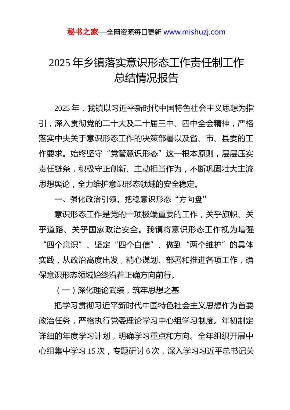 秘书之家—全网资源每日更新 www.mishuzj.com2025 年乡镇落实意识形态工作责任制工作总结情况报告 2025 年,我镇以习近平新时代中国特色社会主义思想为指引,深入贯彻党的二十大及二十届三中、四中全会精神,严格落实中央关于意识形态工作的决策部署以及省、市、县委的工作要求。始终坚守“党管意识形态”这一根本原则,层层压实责任链条,积极守正创新、主动担当作为,不断巩固壮大主流思想舆论,全力维护意识形态领域的安全稳定。一、强化政治引领,把稳意识形态“方向盘”意识形态工作是党的一项极端重要的工作,关乎旗帜、关乎道路、关乎国家政治安全。我镇将意识形态工作视为增强“四个意识”、坚定“四个自信”、做到“两个维护”的具体实践,从政治高度出发,精心谋划、部署和推进各项工作,确保意识形态领域始终沿着正确方向前行。(一)深化理论武装,筑牢思想之基把学习贯彻习近平新时代中国特色社会主义思想作为首要政治任务,严格执行党委理论学习中心组学习制度。年初制定详细的年度学习计划,明确学习重点和方向。全年组织开展中心组集中学习 15 次,专题研讨 6 次,深入学习习近平总书记关秘书之家—全网资源每日更新 www.mishuzj.com于意识形态工作的重要论述、关于乡村振兴的重要指示精神以及在全国生态环境保护大会上的重要讲话等内容。通过逐字逐句研读原文、结合实际深入思考、交流研讨碰撞思想,切实提升领导班子的政治判断力、政治领悟力和政治执行力。1.推动理论普及,走进群众心间。充分利用新时代文明实践所(站)、农村大喇叭、田间地头小课堂等基层阵地,组织镇村干部、志愿者开展“理论轻骑兵进万家”活动 40 场次,覆盖群众 6500 余人次。用通俗易懂、生动形象的语言,解读党的政策方针,讲述乡村发展变化,让党的创新理论真正“飞入寻常百姓家”,打通理论宣传的“最后一公里”。2.加强青少年思政教育,扣好人生扣子。与镇中小学紧密合作,开展“传承红色基因,争做时代新人”主题教育实践活动。通过开展红色研学、主题征文、演讲比赛等形式,引导青少年树立正确的世界观、人生观和价值观。全年举办校园思政课讲座 10 场,覆盖师生 1500 余人,让红色基因、革命薪火代代传承。(二)压实主体责任,健全工作机制将意识形态工作纳入重要议事日程、党建工作责任制以及领导班子和领导干部目标管理,构建起党委统一领导、党政齐抓共管、宣传部门组织协调、有关部门分工负责的工作格局。秘书之家—全网资源每日更新 www.mishuzj.com1.完善责任体系,明确职责分工。镇党委切实履行主体责任,党委书记认真履行第一责任人职责,对意识形态工作重要事项亲自部署、重要问题亲自过问、重大事件亲自处置。班子成员严格落实“一岗双责”,将意识形态工作与业务工作同部署、同落实、同检查、同考核。制定《镇意识形态工作责任清单》,明确各部门、各村(社区)的工作职责和任务,确保责任落实到岗、到人。2.建立健全工作制度,规范工作流程。完善意识形态工作分析研判、定期报告、督查考核等制度。每季度召开一次意识形态工作分析研判会议,及时掌握意识形态领域的新情况、新问题,研究制定应对措施。每年向县委专题报告意识形态工作情况,接受县委的监督和指导。加强对意识形态工作的督查考核,将考核结果作为领导干部评先评优、选拔任用的重要依据。二、聚焦舆论引导,唱响意识形态“主旋律”坚持团结稳定鼓劲、正面宣传为主的方针,积极传播正能量,营造良好的舆论氛围。(一)加强正面宣传,展现镇域风采围绕镇党委、政府的中心工作和重点任务,加大宣传力度展示镇域经济社会发展的新成就、新亮点。1.讲好镇域故事,传播镇域声音。充分利用微信公众号、秘书之家—全网资源每日更新 www.mishuzj.com微博、抖音等新媒体平台,开设“镇域风采”“乡村振兴进行时”等专栏,发布各类宣传稿件 300 余篇,图片 500 余张,视频 80 余个,全方位、多角度展示镇域的自然风光、人文历史、产业发展和民生改善等方面的情况。制作了《魅力小镇,活力无限》《乡村振兴,我们在行动》等宣传视频,在各大平台广泛传播,提升了镇域的知名度和美誉度。2....