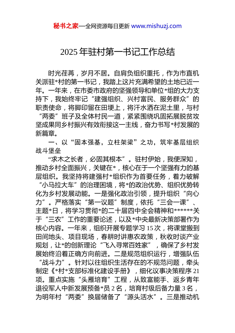 秘书之家—全网资源每日更新 www.mishuzj.com2025 年驻村第一书记工作总结时光荏苒,岁月不居。自肩负组织重托,作为市直机关派驻*村的第一书记,我踏上这片充满希望的土地已近一年。一年来,在市委市政府的坚强领导和单位*组的大力支持下,我始终牢记“建强组织、兴村富民、服务群众”的职责使命,将脚印留在田埂上,将汗水洒在泥土里,与村“两委”班子及全体村民一道,紧紧围绕巩固拓展脱贫攻坚成果同乡村振兴有效衔接这一主线,奋力书写*村发展的新篇章。一、以“固本强基,立柱架梁”之功,筑牢基层组织战斗堡垒“求木之长者,必固其根本”。驻村伊始,我便深知,推动乡村全面振兴,关键在*,核心在于一个坚强有力的基层组织。我坚持将建强村*组织作为首要任务,着力破解“小马拉大车”的治理困境,将*的政治优势、组织优势转化为乡村发展动能。一是强化政治引领,提升组织“向心力”。严格落实“第一议题”制度,依托“三会一课”、主题*日,将学习贯彻*的二十届四中全会精神和******关于“三农”工作的重要论述,以及*中央最新决策部署作为核心内容。一年来,组织开展专题学习 15 次,将课堂搬到田间地头、项目现场,春耕时讲惠农政策,秋收时谈产业规划,让*的创新理论“飞入寻常百姓家”,确保了乡村发展始终沿着正确方向前进。二是规范组织运行,增强队伍“战斗力”。针对以往组织生活存在的不规范问题,牵头制定《*村*支部标准化建设手册》,细化议事决策程序 21项。重点实施“头雁培育”工程,从致富能手、返乡青年退役军人中新发展预备*员 2 名,培育村级后备力量 3 名,为明年村“两委”换届储备了“源头活水”。三是推动机秘书之家—全网资源每日更新 www.mishuzj.com制创新,激发治理“内驱力”。学习借鉴“书记直通车”等先进经验,在村内推行“书记板凳议事会”机制。由村*支部书记牵头,我本人与村“两委”、*员代表、村民代表定期围坐一圈,围绕基础设施建设、集体资产处置、矛盾纠纷调解等议题“开门说事”。年内通过此机制成功化解宅基地纠纷、邻里矛盾等“棘手事”8 起,实现了“小事不出村、矛盾不上交”,*组织的凝聚力和公信力显著提升。二、以“因地制宜,精准滴灌”之策,激活乡村产业造血功能“产业兴则乡村兴,产业旺则百姓富”。我深刻认识到,发展产业是巩固脱贫成果、推进乡村振兴的根本之策。我们摒弃“等靠要”思想,立足*村资源禀赋,精准施策,探索符合村情的特色产业发展之路。一是摸清家底,绘制产业“规划图”。驻村后,我第一时间开展全覆盖走访和“微调研”,与 87 户村民深入交谈,形成万余字的村情调研报告。我们发现,村内虽有零散的果蔬种植传统,但存在“小、散、弱”、抗风险能力差、销售渠道单一等问题为此,我们确立了“整合资源、打造品牌、拓宽销路”的产业发展三步走策略。二是聚合资源,打造发展“联合体”。借鉴“四联共建”模式,推动成立“*村特色果蔬产业 dj 联合体”,将分散的农户组织起来,整合土地 150 余亩。联合体*委统筹协调,与市农科院对接引入优质种苗,与大型商超签订保底收购协议。通过“*支部+合作社+农户”模式,带动 42 户农户(含脱贫户 8 户)参与,实现规模化种植,亩均产值预计提升 30%以上。三是创新销路,架设增收“直通桥”。为解决“酒香也怕巷子深”的问题我们积极拓展线上线下销售渠道。线上,我带头学习并组织 3 名年轻*员开设助农直播账号,开展“周五有约”云端带货活动,年内累计直播 24 场,销售草莓、蜜桃等农产品超 5000 斤,线上销售额突破 15 万元。线下,依托派出单位资源,在市区设立“*村优品”展销专柜。今年以来,通过秘书之家—全网资源每日更新 www.mishuzj.com多渠道销售,帮助村民直接增收逾 40 万元,村集体经济收入也从去年的 5 万元增长至 8.2 万元,增幅达 64%。三、以“枝叶关情,初心为民”之心,提升村民幸福生活质感“民之所忧,我必念之;民之所盼,我必行之”。驻村工作的价值,最终要落脚在为群众办实事、解难题上,让老百姓看到真变化、得到真实惠。我始终将村民的“急难愁盼”作为工作的“风向标”,努力做好服务群众...