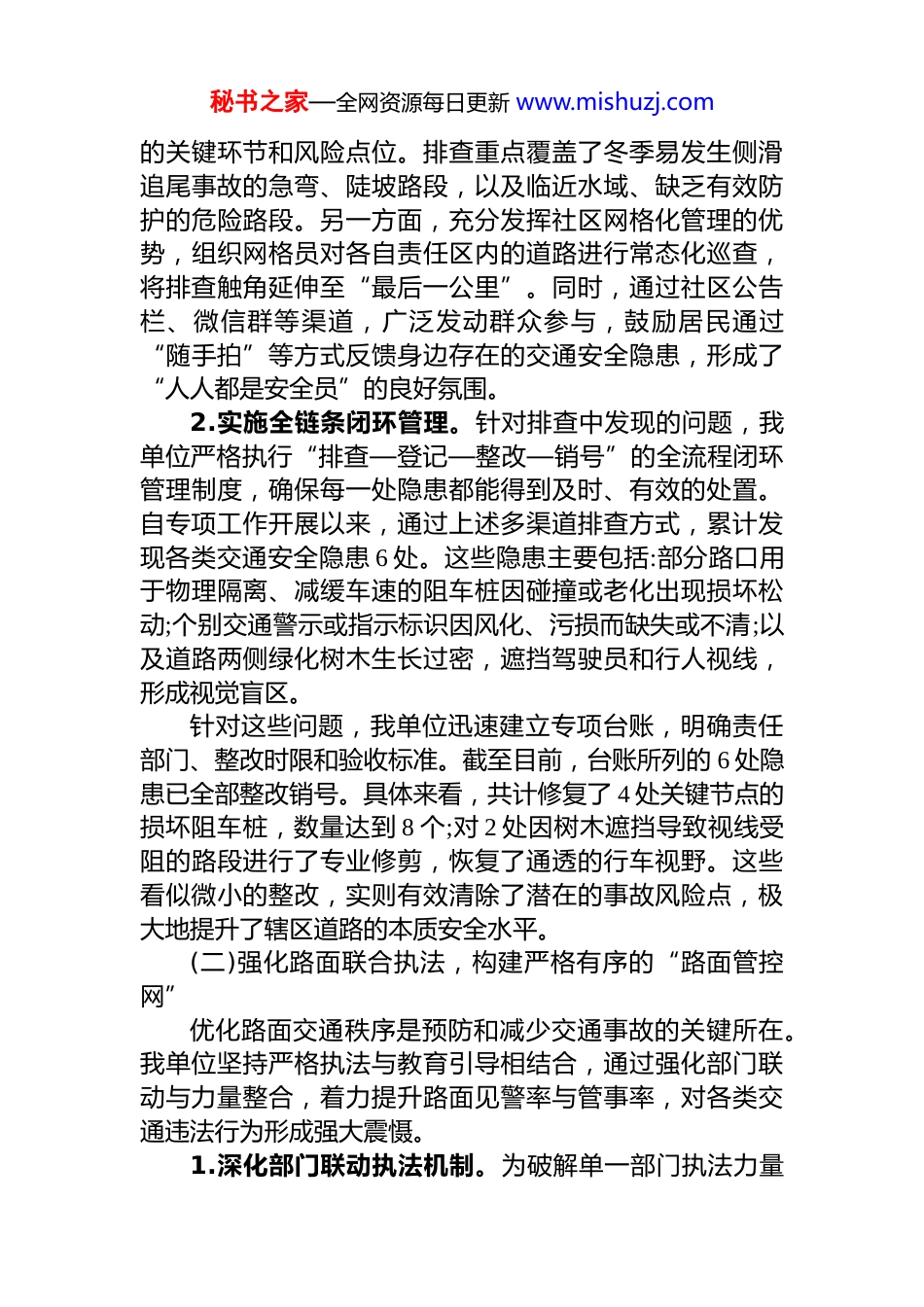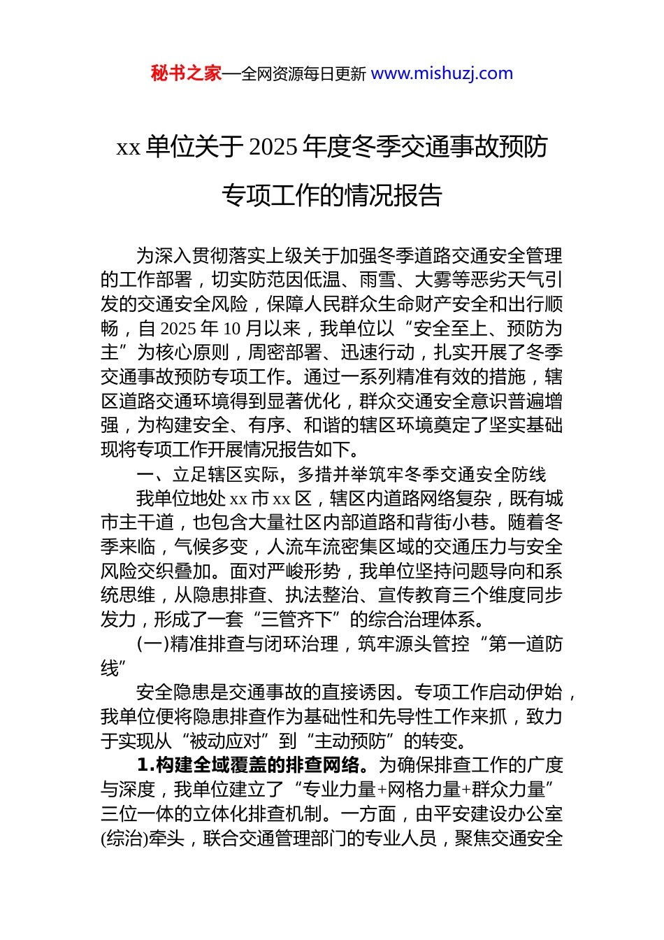 秘书之家—全网资源每日更新 www.mishuzj.comxx 单位关于 2025 年度冬季交通事故预防专项工作的情况报告为深入贯彻落实上级关于加强冬季道路交通安全管理的工作部署,切实防范因低温、雨雪、大雾等恶劣天气引发的交通安全风险,保障人民群众生命财产安全和出行顺畅,自 2025 年 10 月以来,我单位以“安全至上、预防为主”为核心原则,周密部署、迅速行动,扎实开展了冬季交通事故预防专项工作。通过一系列精准有效的措施,辖区道路交通环境得到显著优化,群众交通安全意识普遍增强,为构建安全、有序、和谐的辖区环境奠定了坚实基础现将专项工作开展情况报告如下。一、立足辖区实际,多措并举筑牢冬季交通安全防线我单位地处 xx 市 xx 区,辖区内道路网络复杂,既有城市主干道,也包含大量社区内部道路和背街小巷。随着冬季来临,气候多变,人流车流密集区域的交通压力与安全风险交织叠加。面对严峻形势,我单位坚持问题导向和系统思维,从隐患排查、执法整治、宣传教育三个维度同步发力,形成了一套“三管齐下”的综合治理体系。(一)精准排查与闭环治理,筑牢源头管控“第一道防线”安全隐患是交通事故的直接诱因。专项工作启动伊始,我单位便将隐患排查作为基础性和先导性工作来抓,致力于实现从“被动应对”到“主动预防”的转变。1.构建全域覆盖的排查网络。为确保排查工作的广度与深度,我单位建立了“专业力量+网格力量+群众力量”三位一体的立体化排查机制。一方面,由平安建设办公室(综治)牵头,联合交通管理部门的专业人员,聚焦交通安全秘书之家—全网资源每日更新 www.mishuzj.com的关键环节和风险点位。排查重点覆盖了冬季易发生侧滑追尾事故的急弯、陡坡路段,以及临近水域、缺乏有效防护的危险路段。另一方面,充分发挥社区网格化管理的优势,组织网格员对各自责任区内的道路进行常态化巡查,将排查触角延伸至“最后一公里”。同时,通过社区公告栏、微信群等渠道,广泛发动群众参与,鼓励居民通过“随手拍”等方式反馈身边存在的交通安全隐患,形成了“人人都是安全员”的良好氛围。2.实施全链条闭环管理。针对排查中发现的问题,我单位严格执行“排查—登记—整改—销号”的全流程闭环管理制度,确保每一处隐患都能得到及时、有效的处置。自专项工作开展以来,通过上述多渠道排查方式,累计发现各类交通安全隐患 6 处。这些隐患主要包括:部分路口用于物理隔离、减缓车速的阻车桩因碰撞或老化出现损坏松动;个别交通警示或指示标识因风化、污损而缺失或不清;以及道路两侧绿化树木生长过密,遮挡驾驶员和行人视线,形成视觉盲区。针对这些问题,我单位迅速建立专项台账,明确责任部门、整改时限和验收标准。截至目前,台账所列的 6 处隐患已全部整改销号。具体来看,共计修复了 4 处关键节点的损坏阻车桩,数量达到 8 个;对 2 处因树木遮挡导致视线受阻的路段进行了专业修剪,恢复了通透的行车视野。这些看似微小的整改,实则有效清除了潜在的事故风险点,极大地提升了辖区道路的本质安全水平。(二)强化路面联合执法,构建严格有序的“路面管控网”优化路面交通秩序是预防和减少交通事故的关键所在。我单位坚持严格执法与教育引导相结合,通过强化部门联动与力量整合,着力提升路面见警率与管事率,对各类交通违法行为形成强大震慑。1.深化部门联动执法机制。为破解单一部门执法力量秘书之家—全网资源每日更新 www.mishuzj.com不足、覆盖面有限的难题,平安建设办公室(综治)主动加强与辖区交通警务站的协同联动,建立了常态化的联合执法机制。自 2025 年 10 月以来,双方共同组织开展了针对性的街面交通秩序专项整治行动,累计达到 11 次。行动重点聚焦群众反映强烈、极易引发拥堵和事故的机动车乱停乱放问题。通过现场执法,共计张贴违法停车告知单 700 余张,现场劝离、纠正违规停放及不按规定通行的车辆超过 1800辆次,有效净化了主次干道及重点区域的停车环境。2.聚焦重点时段与重点行为。执法力量的投入讲求精准高效。我单位将警力部署向早晚高峰时段以及雨雪、大雾等恶劣天气时段倾斜,在学校、大型商超、社区出入口等人流...