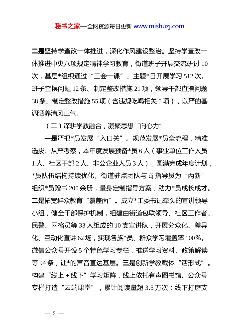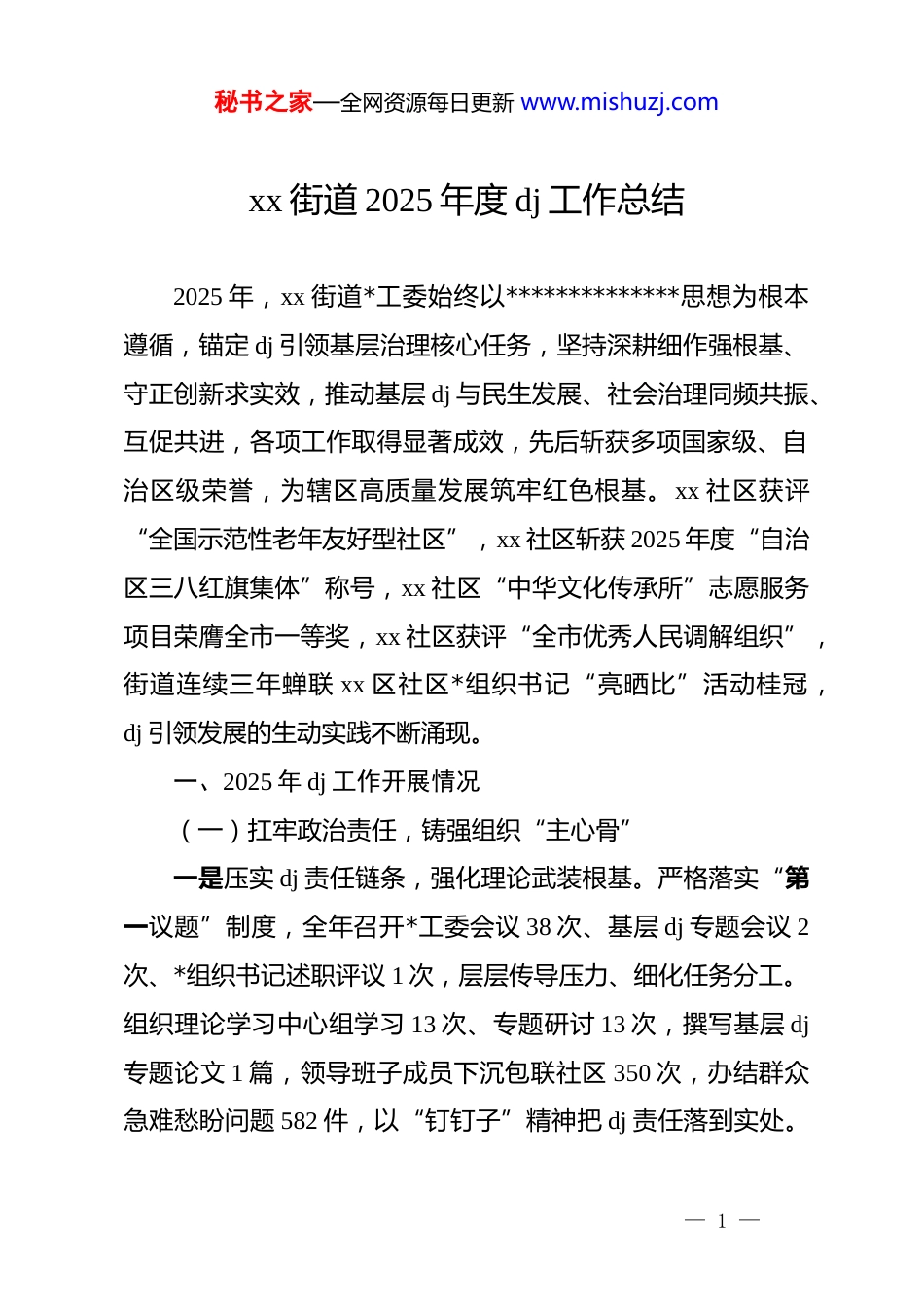 秘书之家—全网资源每日更新 www.mishuzj.comxx 街道 2025 年度 dj 工作总结2025 年,xx 街道*工委始终以**************思想为根本遵循,锚定 dj 引领基层治理核心任务,坚持深耕细作强根基、守正创新求实效,推动基层 dj 与民生发展、社会治理同频共振、互促共进,各项工作取得显著成效,先后斩获多项国家级、自治区级荣誉,为辖区高质量发展筑牢红色根基。xx 社区获评“全国示范性老年友好型社区”,xx 社区斩获 2025 年度“自治区三八红旗集体”称号,xx 社区“中华文化传承所”志愿服务项目荣膺全市一等奖,xx 社区获评“全市优秀人民调解组织”,街道连续三年蝉联 xx 区社区*组织书记“亮晒比”活动桂冠,dj 引领发展的生动实践不断涌现。一、2025 年 dj 工作开展情况(一)扛牢政治责任,铸强组织“主心骨”一是压实 dj 责任链条,强化理论武装根基。严格落实“第一议题”制度,全年召开*工委会议 38 次、基层 dj 专题会议 2次、*组织书记述职评议 1 次,层层传导压力、细化任务分工。组织理论学习中心组学习 13 次、专题研讨 13 次,撰写基层 dj专题论文 1 篇,领导班子成员下沉包联社区 350 次,办结群众急难愁盼问题 582 件,以“钉钉子”精神把 dj 责任落到实处。— 1 —秘书之家—全网资源每日更新 www.mishuzj.com二是坚持学查改一体推进,深化作风建设整治。坚持学查改一体推进中央八项规定精神学习教育,街道班子开展交流研讨 10次,基层*组织通过“三会一课”、主题*日开展学习 512 次。班子查摆问题 12 条、制定整改措施 21 项,领导干部查摆问题38 条、制定整改措施 55 项(含违规吃喝相关 5 项),以严的基调涵养清风正气。(二)深耕学教融合,凝聚思想“向心力”一是严把*员发展“入口关”。规范发展*员全流程,精准选拔、从严考察,本年度发展预备*员 6 人(事业单位工作人员1 人、社区干部 2 人、非公企业人员 3 人),圆满完成年度计划,*员队伍结构持续优化。街道驻点团队与 dj 指导员为“两新”组织*员赠书 200 余册,量身定制指导方案,助力*员成长成才。二是拓宽群众教育“覆盖面”。成立*工委书记牵头的宣讲领导小组,健全干部保护机制,组建由街道包联领导、社区工作者、民警、网格员等 33 人组成的 10 支宣讲队,开展分众化、差异化、互动化宣讲 62 场,实现各族*员、群众学习覆盖率 100%。微信公众号开设 5 个特色学习专栏,推送学习资料、政策解读等 94 条,让*的声音直达基层。三是创新学教载体“活形式”。构建“线上+线下”学习矩阵,线上依托有声图书馆、公众号专栏打造“云端课堂”,累计阅读量超 3.5 万次;线下打磨支— 2 —秘书之家—全网资源每日更新 www.mishuzj.com部书记精品*课,推动理论学习与实践感悟深度融合,让学习教育既有“深度”更有“温度”。(三)建强战斗堡垒,激活支部“新动能”一是推进支部建设规范化。锚定标准化建设目标,细化标准、压实责任、常态督导,推动各支部强基础、补短板、提质效。xx 区 xx 街道机关*支部等 10 个支部获评 xx 市“坚强堡垒支部”,以典型示范引领整体提升,让每个支部都成为坚强战斗堡垒。二是严把换届选举“程序关”。严格遵循法定程序,坚持公开公正原则,统筹推进社区“两委”换届工作。7 个社区*组织换届已完成关键环节,产生委员 35 名;居委会换届顺利推进至选民名单公布阶段,即将进入申诉环节,为社区发展注入新鲜血液。三是深化联建共建“聚合力”。制定《xx 街道dj 联建共建运行规则》,吸纳 48 家驻区单位*组织参与基层治理、帮扶慰问等工作,推动 dj 互联互动常态化。落实“四下基层”和“在职*员进社区”制度,841 名*员到社区报到,开展志愿服务 1300 余次,认领“微心愿”88 个,开展“我为群众办实事”活动 109 次,解决水电、住房等民生问题 622 件,让*群同心绘就治理画卷。(四)守牢意识形态,筑牢宣传“主阵地”一是压实阵地管理责任。严格落实意识形态工作责任制,— 3 —秘书之家—全网资源每日更新 www.mishuzj.com召开专题会议 2 次...