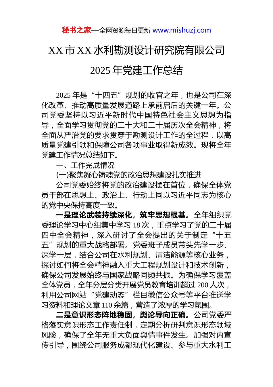 秘书之家—全网资源每日更新 www.mishuzj.comXX 市 XX 水利勘测设计研究院有限公司2025 年党建工作总结2025 年是“十四五”规划的收官之年,也是公司在深化改革、推动高质量发展道路上承前启后的关键一年。公司党委坚持以习近平新时代中国特色社会主义思想为指导,全面学习贯彻党的二十大和二十届历次全会精神,将全面从严治党的要求贯穿于勘测设计工作的全过程,以高质量党建引领和保障公司各项事业取得新成效。现将全年党建工作情况总结如下。一、工作完成情况(一)聚焦凝心铸魂党的政治思想建设扎实推进公司党委始终将党的政治建设摆在首位,确保全体党员干部在思想上、政治上、行动上同以习近平同志为核心的党中央保持高度一致。一是理论武装持续深化,筑牢思想根基。全年组织党委理论学习中心组集中学习 18 次,重点学习了党的二十届四中全会精神,深入研讨了全会提出的关于制定“十五五”规划的重大战略部署。党委班子成员带头先学一步、深学一层,结合公司在水利规划、清洁能源等核心业务,探讨如何将全会精神融入重大工程规划设计和技术创新,确保公司发展始终与国家战略同频共振。为确保学习覆盖全体党员,全年分层分类开展党员教育培训超过 200 人次,利用公司网站“党建动态”栏目微信公众号等平台推送学习资料和理论文章 110 余篇,营造了浓厚的学习氛围。二是意识形态阵地稳固,舆论导向正确。公司党委严格落实意识形态工作责任制,定期分析研判意识形态领域风险,确保了全年无重大负面舆情事件发生。加强对内宣传引导,围绕公司服务成都现代化建设、参与重大水利工秘书之家—全网资源每日更新 www.mishuzj.com程等中心工作,在人民日报、人民网等主流媒体及网络平台发稿 30 余篇,有效提升了公司的社会形象和行业影响力。同时,严格执行信访工作管理办法,建立信访隐患排查机制,特别是在重大节假日期间强化值班值守,确保了内部和谐稳定。三是深入贯彻中央八项规定精神学习教育走深走实。公司党委将此项学习教育作为年度党建和党风廉政建设的重中之重。年初,专门召开动员部署会,制定详尽实施方案。全年通过“三会一课”、主题党日等形式,组织全体党员、干部职工深入学习中央八项规定及其细则精神,观看警示教育片 10 余场次,邀请市纪委专家进行专题辅导讲座,深刻剖析违纪违法典型案例,以案明纪、以案释法。结合设计院行业特点,重点围绕项目招投标、供应商选择、经费使用等关键环节开展作风大排查,坚决纠治形式主义、官僚主义问题。紧盯元旦、春节、国庆等重要节点,通过发送廉洁提醒、开展专项督查等方式,严防“四风”问题反弹回潮,营造了风清气正的干事创业环境。(二)聚焦强基固本组织建设全面加强公司党委坚持大抓基层的鲜明导向,着力增强基层党组织的政治功能和组织功能。一是组织体系持续优化。根据业务发展和人员变动情况,动态调整优化党组织设置,确保党组织在项目一线、关键部门全覆盖。截至 2025 年底,公司党委下辖党组织 15个,管理党员 260 人,做到了应建尽建,为党建工作向基层延伸提供了坚实的组织保障。二是组织生活规范高效。严格落实“三会一课”、组织生活会、民主评议党员等基本制度,注重提升会议质量和效果。党委班子成员带头以普通党员身份参加所在支部的组织生活,带头讲党课。各党支部围绕“党建引领技术创新”“党员先锋在行动”等主题,开展特色鲜明的主题党日活动 20 余次,如组织党员集中观看纪念中国人民抗日秘书之家—全网资源每日更新 www.mishuzj.com战争暨世界反法西斯战争胜利 80 周年阅兵式直播,激发爱国热情和奋斗精神。三是党建与业务融合深入推进。为破解“两张皮”问题,公司党委着力创建“水利先锋,设计尖兵”党建品牌,并指导下属各支部结合业务特色创建子品牌。在重大项目中设立“党员先锋岗”和“党员突击队”,鼓励党员在急难险重任务中亮身份、当表率。例如,在某市重点水利枢纽工程勘测设计项目中,“党员突击队”带头攻克技术难题,确保了项目按期高质量完成,真正实现了党建工作与生产经营同向聚合、互促共进。得益于此,公司发展稳步前行,截至 2025 年 11 月末,公...