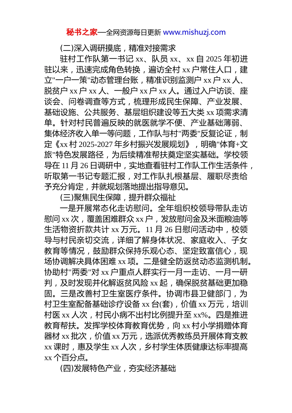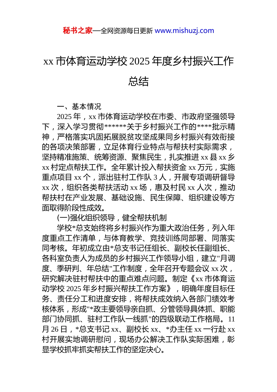 秘书之家—全网资源每日更新 www.mishuzj.comxx 市体育运动学校 2025 年度乡村振兴工作总结一、基本情况2025 年,xx 市体育运动学校在市委、市政府坚强领导下,深入学习贯彻******关于乡村振兴工作的****批示精神,严格落实巩固拓展脱贫攻坚成果同乡村振兴有效衔接的各项决策部署,立足体育行业特点与帮扶村实际需求,坚持精准施策、统筹资源、聚焦民生,扎实推进 xx 县 xx 乡xx 村定点帮扶工作。全年累计投入帮扶资金 xx 万元,实施重点项目 xx 个,派出驻村工作队 3 人,开展专项调研督导xx 次,组织各类帮扶活动 xx 场,惠及村民 xx 人次,推动帮扶村在产业发展、基础设施、民生保障、组织建设等方面取得阶段性成效。(一)强化组织领导,健全帮扶机制学校*总支始终将乡村振兴作为重大政治任务,列入年度重点工作清单,与体育教学、竞技训练同部署、同落实同考核。年初成立由*总支书记任组长、副校长任副组长、各科室负责人为成员的乡村振兴工作领导小组,建立"月调度、季研判、年总结"工作制度,全年召开专题会议 xx 次,研究解决驻村帮扶中的重点难点问题。制定《xx 市体育运动学校 2025 年乡村振兴帮扶工作方案》,明确年度目标任务、责任分工和进度安排,将帮扶成效纳入各部门绩效考核体系,形成"*政主要领导亲自抓、分管领导具体抓、职能部门协同抓、驻村工作队一线抓"的四级联动工作格局。11月 26 日,*总支书记 xx、副校长 xx、*办主任 xx 一行赴 xx村开展实地调研慰问,现场办公解决工作队实际困难,彰显学校抓牢抓实帮扶工作的坚定决心。秘书之家—全网资源每日更新 www.mishuzj.com(二)深入调研摸底,精准对接需求驻村工作队第一书记 xx、队员 xx、xx 自 2025 年初进驻以来,迅速完成角色转换,遍访全村 xx 户常住人口,建立"一户一策"动态管理台账,精准识别监测户 xx 户 xx 人、脱贫户 xx 户 xx 人、一般户 xx 户 xx 人。通过入户访谈、座谈会、问卷调查等方式,梳理形成民生保障、产业发展、基础设施、公共服务、基层组织建设等五大类 xx 项需求清单。针对村民普遍反映的就医就学不便、产业基础薄弱、集体经济收入单一等问题,工作队与村"两委"反复论证,制定《xx 村 2025-2027 年乡村振兴发展规划》,明确"体育+文旅"特色发展路径,为后续精准帮扶奠定坚实基础。学校领导在 11 月 26 日调研中,实地查看驻村工作队工作生活条件,听取第一书记专题汇报,对工作队扎根基层、履职尽责给予充分肯定,并就规划落地提出指导意见。(三)聚焦民生保障,提升群众福祉一是开展常态化走访慰问。全年组织校领导带队走访慰问 xx 次,覆盖困难群众 xx 户,发放慰问金及米面粮油等生活物资折款共计 xx 万元。11 月 26 日慰问活动中,校领导与村民亲切交流,详细了解身体状况、家庭收入、子女教育等情况,鼓励群众保持乐观心态、坚定致富信心,现场协调解决具体困难 xx 项。二是健全防返贫动态监测机制。协助村"两委"对 xx 户重点人群实行一月一走访、一月一研判,及时发现并化解返贫风险 xx 起,确保脱贫基础更加稳固。三是改善村卫生室医疗条件。协调市县卫健部门,为村卫生室配备基础诊疗设备 xx 台(套),价值 xx 万元,培训村医 xx 人次,村民小病不出村比例提升至 xx%。四是推进教育帮扶。发挥学校体育教育优势,向 xx 村小学捐赠体育器材 xx 批次,价值 xx 万元,选派优秀教练员开展体育支教xx 课时,惠及学生 xx 人次,乡村学生体质健康达标率提高xx 个百分点。(四)发展特色产业,夯实经济基础秘书之家—全网资源每日更新 www.mishuzj.com立足 xx 村生态资源禀赋,学校重点扶持"体育+文旅"融合产业。一是支持建成山地自行车骑行道 xx 公里,投入帮扶资金 xx 万元,配套建设休憩驿站 xx 处、标识系统 xx 套。该项目于 2025 年 5 月开工、9 月竣工,吸引骑行爱好者 xx人次,带动村民增收 xx 万元。二是培育乡村民宿经济。引导 xx 户村民改造闲置农房发展民宿,学校提供设计指导和运营培训,每户补贴 xx 万元,全年新增民宿床位 xx 张,接待游客 xx...