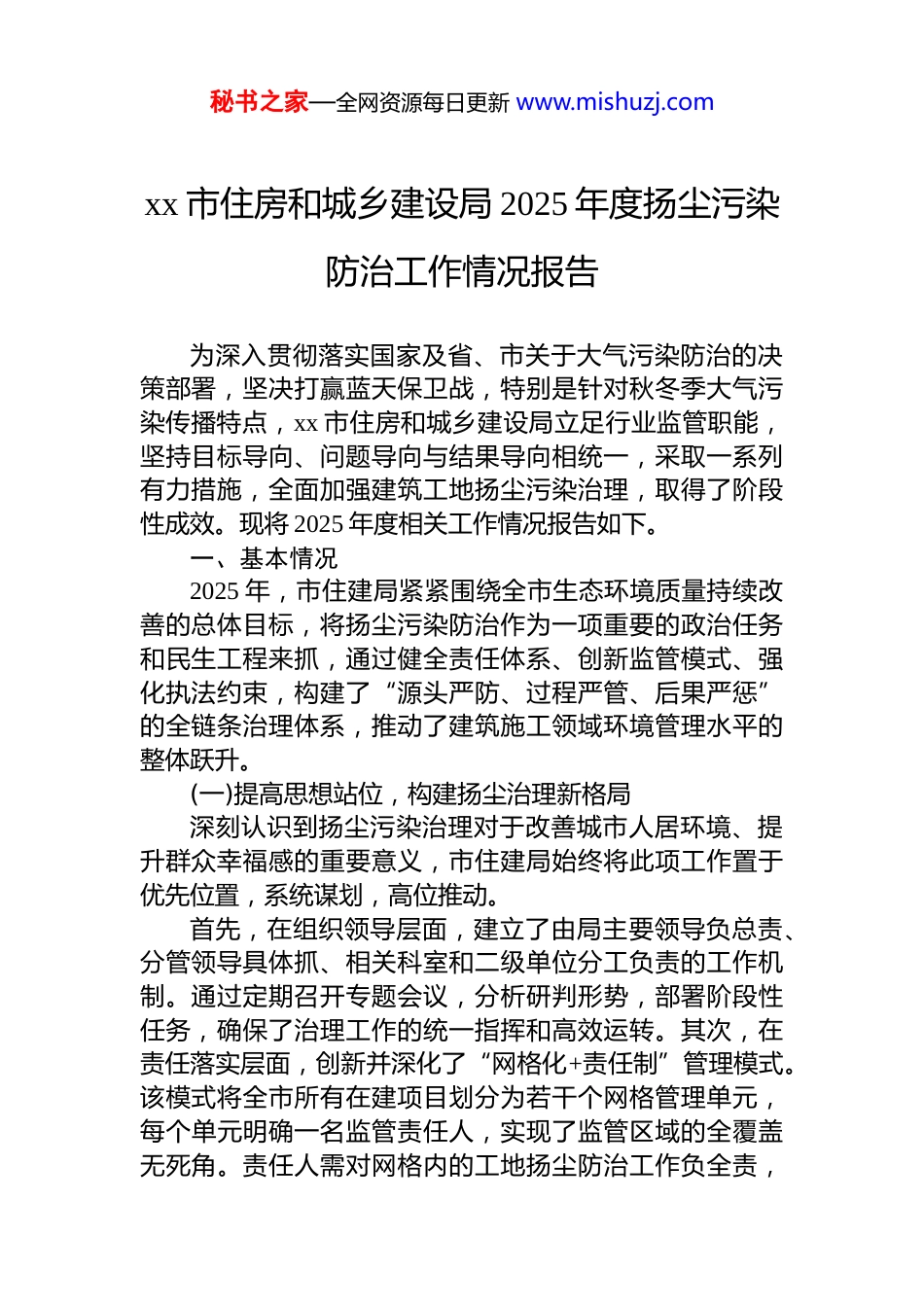 秘书之家—全网资源每日更新 www.mishuzj.comxx 市住房和城乡建设局 2025 年度扬尘污染防治工作情况报告为深入贯彻落实国家及省、市关于大气污染防治的决策部署,坚决打赢蓝天保卫战,特别是针对秋冬季大气污染传播特点,xx 市住房和城乡建设局立足行业监管职能,坚持目标导向、问题导向与结果导向相统一,采取一系列有力措施,全面加强建筑工地扬尘污染治理,取得了阶段性成效。现将 2025 年度相关工作情况报告如下。一、基本情况2025 年,市住建局紧紧围绕全市生态环境质量持续改善的总体目标,将扬尘污染防治作为一项重要的政治任务和民生工程来抓,通过健全责任体系、创新监管模式、强化执法约束,构建了“源头严防、过程严管、后果严惩”的全链条治理体系,推动了建筑施工领域环境管理水平的整体跃升。(一)提高思想站位,构建扬尘治理新格局深刻认识到扬尘污染治理对于改善城市人居环境、提升群众幸福感的重要意义,市住建局始终将此项工作置于优先位置,系统谋划,高位推动。首先,在组织领导层面,建立了由局主要领导负总责、分管领导具体抓、相关科室和二级单位分工负责的工作机制。通过定期召开专题会议,分析研判形势,部署阶段性任务,确保了治理工作的统一指挥和高效运转。其次,在责任落实层面,创新并深化了“网格化+责任制”管理模式。该模式将全市所有在建项目划分为若干个网格管理单元,每个单元明确一名监管责任人,实现了监管区域的全覆盖无死角。责任人需对网格内的工地扬尘防治工作负全责,秘书之家—全网资源每日更新 www.mishuzj.com从源头上杜绝了责任推诿、监管缺位等现象。在此基础上,为确保责任落到实处,市住建局探索建立了“三查三改”闭环工作机制。“三查”即查问题、查责任、查措施,要求监管人员不仅要发现工地围挡不严、裸土未苫盖、道路未硬化等表面问题,更要深挖问题背后的责任归属和措施缺陷。“三改”即即查即改、限期整改长效防治,针对发现的问题,要求能立即整改的必须现场监督完成;对需要一定时间整改的,下达书面整改通知书,明确时限和标准;对反复出现、共性突出的问题,则深入剖析根源,指导企业建立长效管理机制,从而实现了从“头痛医头”向“标本兼治”的转变。(二)创新监管手段,注入科技赋能新动力面对传统监管方式存在的效率不高、干扰企业正常生产等局限,市住建局积极拥抱现代信息技术,大力推进智慧监管,为扬尘治理装上了“千里眼”和“智慧大脑”。核心举措是依托全市统一的扬尘在线监控平台,实现了对重点建设项目的全天候、自动化实时监测。该平台通过 在 工 地 关 键 点 位 布 设 的 传 感 器 , 实 时 采 集pm2.5、pm10、噪声等关键环境数据,一旦数据超标,系统便会自动预警,并将信息同步推送至监管人员和项目负责人的移动终端。这种非现场、数据化的监管方式,不仅极大地提升了发现问题的及时性和精准性,也最大限度地减少了对企业正常施工活动的干扰,体现了监管与服务的统一。为进一步拓展监管覆盖面,解决传统巡查难以触及的视角盲区,市住建局创新性地引入了无人机进行空中巡查无人机凭借其机动灵活、视野开阔的优势,能够对工地的顶部、角落等隐蔽区域进行高清航拍和视频监控,高效排查大面积裸土未覆盖、高处作业扬尘等问题。自该技术应用以来,已累计开展无人机飞巡百余架次,成功发现并督促整改了 30 余处隐蔽性较强的扬尘污染问题,有效弥补了秘书之家—全网资源每日更新 www.mishuzj.com地面巡查的不足。科技手段的应用,标志着市住建局的扬尘治理工作正从“人海战术”向“精准滴灌”的智慧环保新阶段迈进。(三)强化执法刚性,树立从严管控新常态严格的执法是保障各项防治措施落地见效的关键。市住建局坚持“零容忍”态度,手握法律戒尺,对扬尘污染违法违规行为形成了强大震慑。一方面,保持高压巡查态势。组织精干执法力量,采取“四不两直”的方式,对全市在建项目开展高频次、拉网式执法检查。截至 2025 年 11 月底,已累计开展专项巡查33 次,检查项目超过 150 个次,针对发现的问题下达《限期整改通知书》28 份,并对 10 家责任落实不力、问题较为突出...