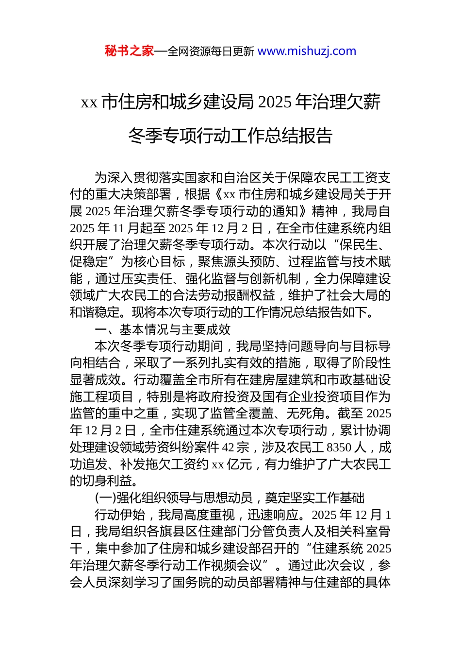 秘书之家—全网资源每日更新 www.mishuzj.comxx 市住房和城乡建设局 2025 年治理欠薪冬季专项行动工作总结报告为深入贯彻落实国家和自治区关于保障农民工工资支付的重大决策部署,根据《xx 市住房和城乡建设局关于开展 2025 年治理欠薪冬季专项行动的通知》精神,我局自2025 年 11 月起至 2025 年 12 月 2 日,在全市住建系统内组织开展了治理欠薪冬季专项行动。本次行动以“保民生、促稳定”为核心目标,聚焦源头预防、过程监管与技术赋能,通过压实责任、强化监督与创新机制,全力保障建设领域广大农民工的合法劳动报酬权益,维护了社会大局的和谐稳定。现将本次专项行动的工作情况总结报告如下。一、基本情况与主要成效本次冬季专项行动期间,我局坚持问题导向与目标导向相结合,采取了一系列扎实有效的措施,取得了阶段性显著成效。行动覆盖全市所有在建房屋建筑和市政基础设施工程项目,特别是将政府投资及国有企业投资项目作为监管的重中之重,实现了监管全覆盖、无死角。截至 2025年 12 月 2 日,全市住建系统通过本次专项行动,累计协调处理建设领域劳资纠纷案件 42 宗,涉及农民工 8350 人,成功追发、补发拖欠工资约 xx 亿元,有力维护了广大农民工的切身利益。(一)强化组织领导与思想动员,奠定坚实工作基础行动伊始,我局高度重视,迅速响应。2025 年 12 月 1日,我局组织各旗县区住建部门分管负责人及相关科室骨干,集中参加了住房和城乡建设部召开的“住建系统 2025年治理欠薪冬季行动工作视频会议”。通过此次会议,参会人员深刻学习了国务院的动员部署精神与住建部的具体秘书之家—全网资源每日更新 www.mishuzj.com工作要求,进一步统一了思想,明确了“保民生、促稳定”的核心任务,深刻认识到当前形势下做好欠薪治理工作的紧迫性与重要性,为全市住建系统高效、有序开展冬季欠薪治理行动筑牢了思想根基,提供了清晰的政策指引。视频会议结束后,我局立即召开贯彻落实专题会议,由局分管领导主持。会议结合我市建设领域的实际情况与潜在风险点,围绕源头预防、过程监管、技术赋能三个关键环节,对冬季专项行动进行了再动员、再部署、再压实会议明确要求,全市各级住建部门必须提高政治站位,将治理欠薪工作作为当前最重要的民生工程和政治任务来抓确保各项制度措施不折不扣地落地见效。(二)聚焦源头预防,构筑欠薪风险“防火墙”根治欠薪问题,关键在于源头治理。我局坚持“防未然、治未病”的原则,将监管重心前置,通过严格落实各项保障制度,从根本上减少欠薪风险的发生。一是全面夯实制度保障。严格执行《保障农民工工资支付条例》,强制推行工程款支付担保制度,确保建设单位具备充足的工程款支付能力。同时,督促所有在建项目严格落实农民工工资专用账户管理、施工总承包单位代发工资、工资保证金等核心制度。行动期间,对全市在建项目制度落实情况进行拉网式排查,检查发现有 15 个项目未按规定存储工资保证金或开立工资专用账户,已全部责令限期整改,并依法对相关责任单位进行了处罚,确保制度的刚性约束力。二是突出重点项目监管。针对老旧小区改造、市政道路及管网更新、保障性住房等政府投资和国有企业投资项目,实行台账式重点监管。这些项目由于资金来源明确、社会关注度高,我局将其作为欠薪治理的“示范田”。通过压实建设单位的首要责任和施工总承包单位的直接责任确保工程款按合同约定足额、及时拨付至施工总承包单位并优先用于支付农民工工资,形成了从资金拨付到工资发秘书之家—全网资源每日更新 www.mishuzj.com放的全流程闭环管控,从源头上切断了欠薪链条。(三)深化过程监管,织密动态监控“防护网”在强化源头预防的同时,我局着力于过程中的动态监管与风险排查,确保问题早发现、早介入、早处置。一是创新并深化“双驻双查”工作机制。为推动监管力量下沉一线,我局抽调业务骨干组成多个督查组,采取“属地部门驻点+市局巡回驻场”的方式,对重点项目和重点区域进行深度监管。结合日常巡查的广度与专项督查的深度,全面排查在建项目的劳资管理情况。督查组深入施工现场,与一线农民工面对面交流...