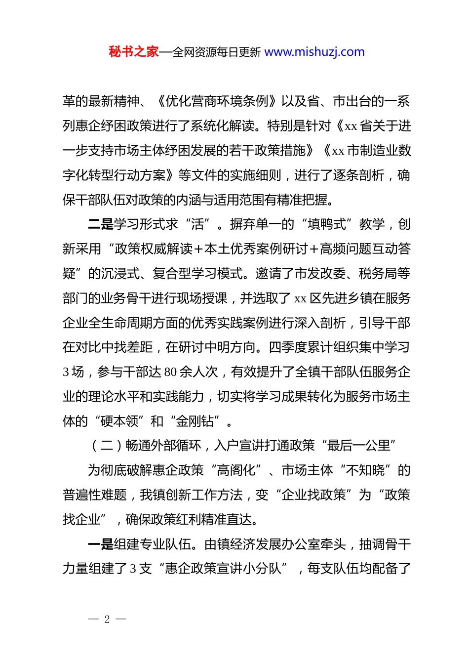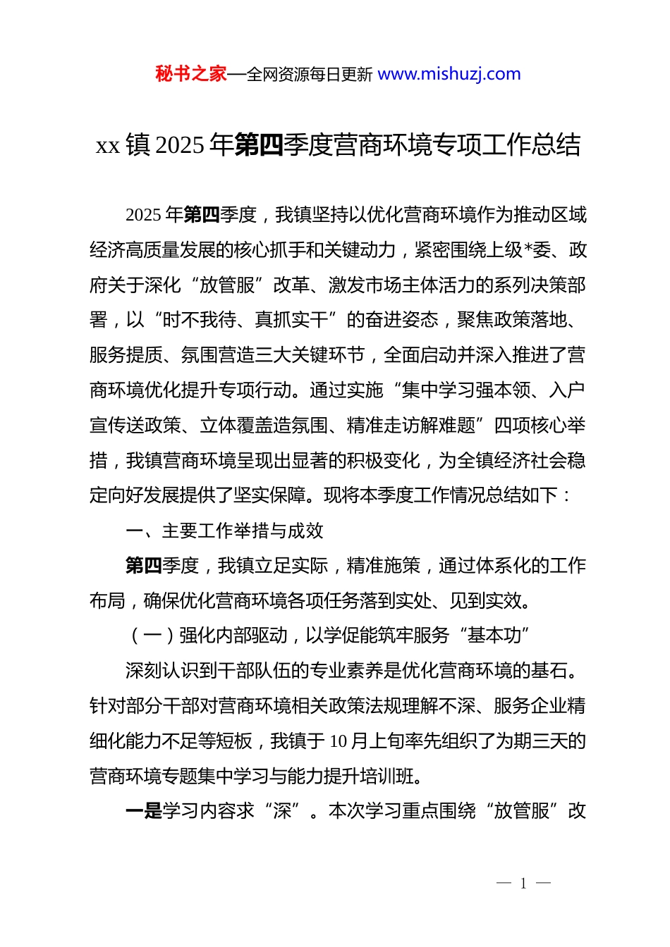 秘书之家—全网资源每日更新 www.mishuzj.comxx 镇 2025 年第四季度营商环境专项工作总结2025 年第四季度,我镇坚持以优化营商环境作为推动区域经济高质量发展的核心抓手和关键动力,紧密围绕上级*委、政府关于深化“放管服”改革、激发市场主体活力的系列决策部署,以“时不我待、真抓实干”的奋进姿态,聚焦政策落地、服务提质、氛围营造三大关键环节,全面启动并深入推进了营商环境优化提升专项行动。通过实施“集中学习强本领、入户宣传送政策、立体覆盖造氛围、精准走访解难题”四项核心举措,我镇营商环境呈现出显著的积极变化,为全镇经济社会稳定向好发展提供了坚实保障。现将本季度工作情况总结如下:一、主要工作举措与成效第四季度,我镇立足实际,精准施策,通过体系化的工作布局,确保优化营商环境各项任务落到实处、见到实效。(一)强化内部驱动,以学促能筑牢服务“基本功”深刻认识到干部队伍的专业素养是优化营商环境的基石。针对部分干部对营商环境相关政策法规理解不深、服务企业精细化能力不足等短板,我镇于 10 月上旬率先组织了为期三天的营商环境专题集中学习与能力提升培训班。一是学习内容求“深”。本次学习重点围绕“放管服”改— 1 —秘书之家—全网资源每日更新 www.mishuzj.com革的最新精神、《优化营商环境条例》以及省、市出台的一系列惠企纾困政策进行了系统化解读。特别是针对《xx 省关于进一步支持市场主体纾困发展的若干政策措施》《xx 市制造业数字化转型行动方案》等文件的实施细则,进行了逐条剖析,确保干部队伍对政策的内涵与适用范围有精准把握。二是学习形式求“活”。摒弃单一的“填鸭式”教学,创新采用“政策权威解读+本土优秀案例研讨+高频问题互动答疑”的沉浸式、复合型学习模式。邀请了市发改委、税务局等部门的业务骨干进行现场授课,并选取了 xx 区先进乡镇在服务企业全生命周期方面的优秀实践案例进行深入剖析,引导干部在对比中找差距,在研讨中明方向。四季度累计组织集中学习3 场,参与干部达 80 余人次,有效提升了全镇干部队伍服务企业的理论水平和实践能力,切实将学习成果转化为服务市场主体的“硬本领”和“金刚钻”。(二)畅通外部循环,入户宣讲打通政策“最后一公里”为彻底破解惠企政策“高阁化”、市场主体“不知晓”的普遍性难题,我镇创新工作方法,变“企业找政策”为“政策找企业”,确保政策红利精准直达。一是组建专业队伍。由镇经济发展办公室牵头,抽调骨干力量组建了 3 支“惠企政策宣讲小分队”,每支队伍均配备了— 2 —秘书之家—全网资源每日更新 www.mishuzj.com熟悉经济、税务、社保等领域的专业人员,确保政策解读的权威性和准确性。二是开展精准推送。宣讲小分队采取“网格化管理、地毯式覆盖”的工作模式,深入我镇辖区内的各类商铺、小微企业、个体工商户以及重点规上企业,开展“一对一、面对面”的入户宣传。宣讲内容不仅涵盖了国家普惠性的减税降费政策,如“六税两费”减免、增值税留抵退税等,还重点介绍了针对小微企业的创业担保贷款及贴息、一次性创业补贴等专项扶持政策。工作人员用通俗易懂的语言进行讲解,现场为企业主答疑解惑,就营业执照办理流程优化、社保“网上办”、融资渠道对接等高频事项提供现场指导。正如 xx 街个体商户 xx 女士所言:“这些减税降费政策讲得太透彻了,正好解决了我们经营中的疑惑,也让我们对未来的发展更有信心!”截至 12 月初,全镇已累计开展入户宣讲活动超过 200 次,发放各类政策宣传手册、服务指南等材料 1500 余份,实现了对辖区内 300 余家活跃经营主体的政策知晓初步全覆盖,极大提升了政策的到达率和转化率。(三)营造浓厚氛围,构建亲商安商的“强磁场”良好的营商环境不仅需要扎实的制度支撑,更需要浓厚的社会文化氛围。我镇坚持线上线下联动,全方位、多角度开展— 3 —秘书之家—全网资源每日更新 www.mishuzj.com宣传,努力在全镇范围内营造“处处都是营商环境、人人都是形象使者”的共识。一是在线下营造“抬头可见”的视觉氛围。在 xx 大道、xx路等城镇主干道两侧、镇人民政府、便民服...