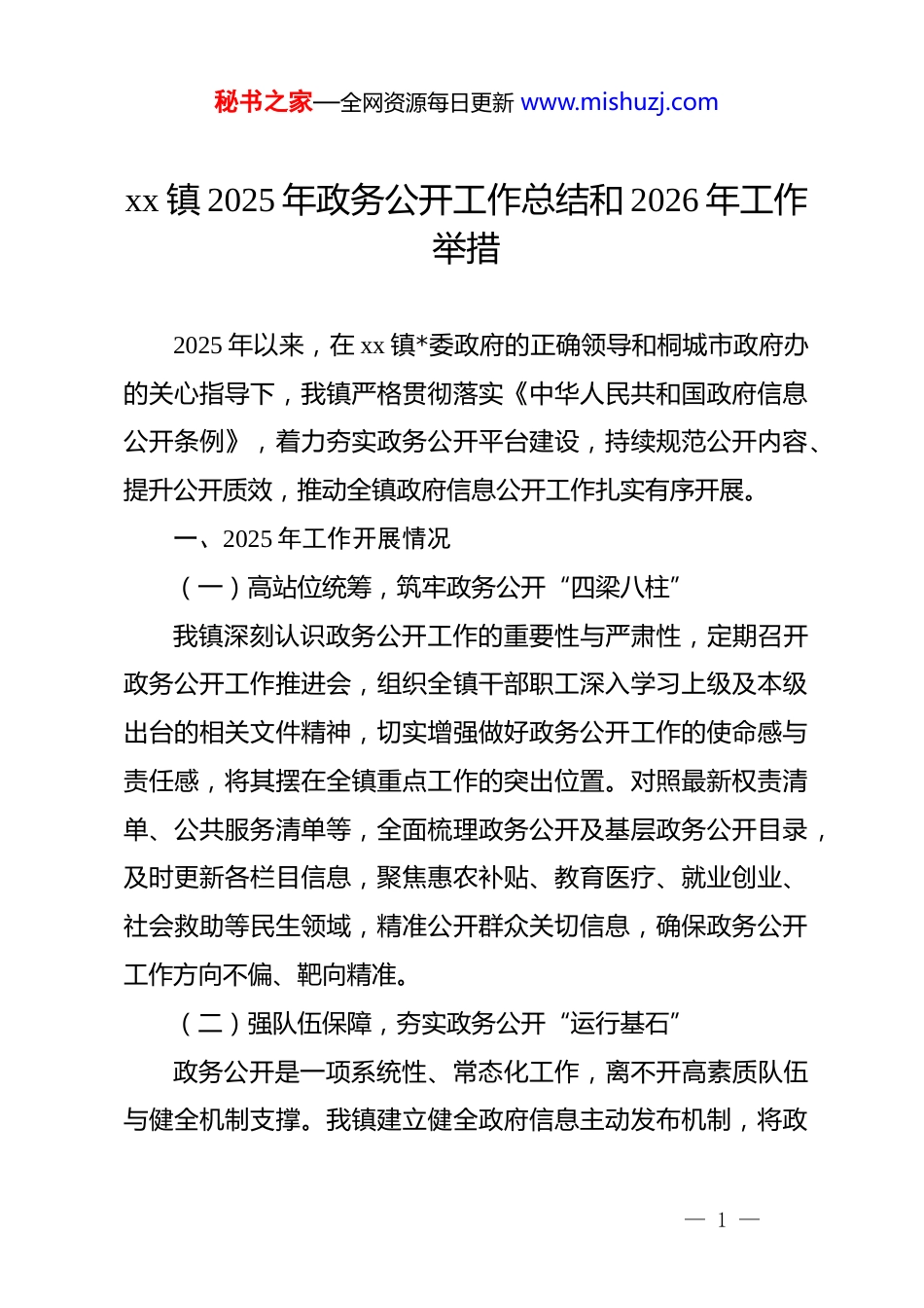 秘书之家—全网资源每日更新 www.mishuzj.comxx 镇 2025 年政务公开工作总结和 2026 年工作举措2025 年以来,在 xx 镇*委政府的正确领导和桐城市政府办的关心指导下,我镇严格贯彻落实《中华人民共和国政府信息公开条例》,着力夯实政务公开平台建设,持续规范公开内容、提升公开质效,推动全镇政府信息公开工作扎实有序开展。一、2025 年工作开展情况(一)高站位统筹,筑牢政务公开“四梁八柱”我镇深刻认识政务公开工作的重要性与严肃性,定期召开政务公开工作推进会,组织全镇干部职工深入学习上级及本级出台的相关文件精神,切实增强做好政务公开工作的使命感与责任感,将其摆在全镇重点工作的突出位置。对照最新权责清单、公共服务清单等,全面梳理政务公开及基层政务公开目录,及时更新各栏目信息,聚焦惠农补贴、教育医疗、就业创业、社会救助等民生领域,精准公开群众关切信息,确保政务公开工作方向不偏、靶向精准。(二)强队伍保障,夯实政务公开“运行基石”政务公开是一项系统性、常态化工作,离不开高素质队伍与健全机制支撑。我镇建立健全政府信息主动发布机制,将政— 1 —秘书之家—全网资源每日更新 www.mishuzj.com务公开工作纳入镇*委、政府重要议事日程,构建“主要领导亲自抓、分管领导具体抓、*政办牵头统筹、其他办公室协同参与”的工作格局,配齐配强责任心强、业务能力优的政务公开工作负责人,抓实抓细政府网站建设与管理,营造主动公开、常态公开的浓厚工作氛围。(三)抓能力提升,锤炼政务公开“过硬本领”我镇坚持以学促干、以干提质,组织政务公开经办人员常态化向先进部门请教学习,熟练掌握政务公开分类目录、发布时限及规范标准,精准查摆自身工作短板,借鉴吸收优秀经验做法,不断提升业务素质与管理水平。同时,建立阶段性总结复盘机制,引导各办公室凝聚工作合力,从自身找差距、补短板,推动政务公开工作提质增效。2025 年,镇*政办经办人员累计参加上级政务公开跟班学习 1 次。(四)严监督审核,守好政务公开“质量关口”我镇严格遵循依法依规公开原则,对拟公开信息开展全面细致的**审查,坚决杜绝泄密风险。强化政府网站信息发布管理,健全“初审—复审—终审”三级审核流程,压实工作责任,严把政治关、法律关、政策关、**关、文字关,重点对基础数据源头、附件资料及隐藏表格内容进行交叉复核,严防个人信息泄露、表述错误等问题发生。精准把握不同类型信息公开要— 2 —秘书之家—全网资源每日更新 www.mishuzj.com求,科学选定公开渠道与方式,确保公开工作规范有序。(五)促整改落实,擦亮政务公开“严实底色”我镇坚持问题导向,以“刀刃向内”的决心抓实整改提升对照每月政务公开测评、安庆市乡镇(街道)政务公开互查反馈问题,细化整改措施、明确整改时限、压实整改责任,对丢分项逐条逐项整改销号,确保问题整改不走过场、取得实效。常态化开展自查自纠,严格落实政务公开各项制度规定,对自查发现的问题立行立改、真改实改,以常态化整改推动政务公开工作持续优化。截至目前,上级测评反馈问题已全部整改到位。二、存在的问题在上级部门的悉心指导下,我镇政务公开工作取得一定成效,但仍存在短板不足:一是部分公开信息格式不够规范、内容不够详实,政民互动板块功能发挥不充分,与群众的互动交流黏性较弱;二是少数部门对政务公开工作重视程度不足,具体经办人员工作经验欠缺,业务能力与新形势下政务公开工作要求存在差距;三是政策解读工作深度不够,多以文字罗列为主,解读形式单一、内容晦涩,群众理解度不高。三、2026 年工作举措(一)聚焦“提质增效”,做细做实公开内容— 3 —秘书之家—全网资源每日更新 www.mishuzj.com强化信息发布源头管控和细节把关,建立信息发布“二次审核”机制,对公开内容的规范性、准确性、完整性进行全面核查,确保发布信息零差错。严格落实政务公开各项规章制度,优化工作流程,创新工作方法,做到法定公开内容应公开尽公开、应公开早公开。深化政民互动,依托政府网站、便民服务大厅等平台,及时回应群众咨询投诉,2025 年累计答复市民热线 20 条,20...
