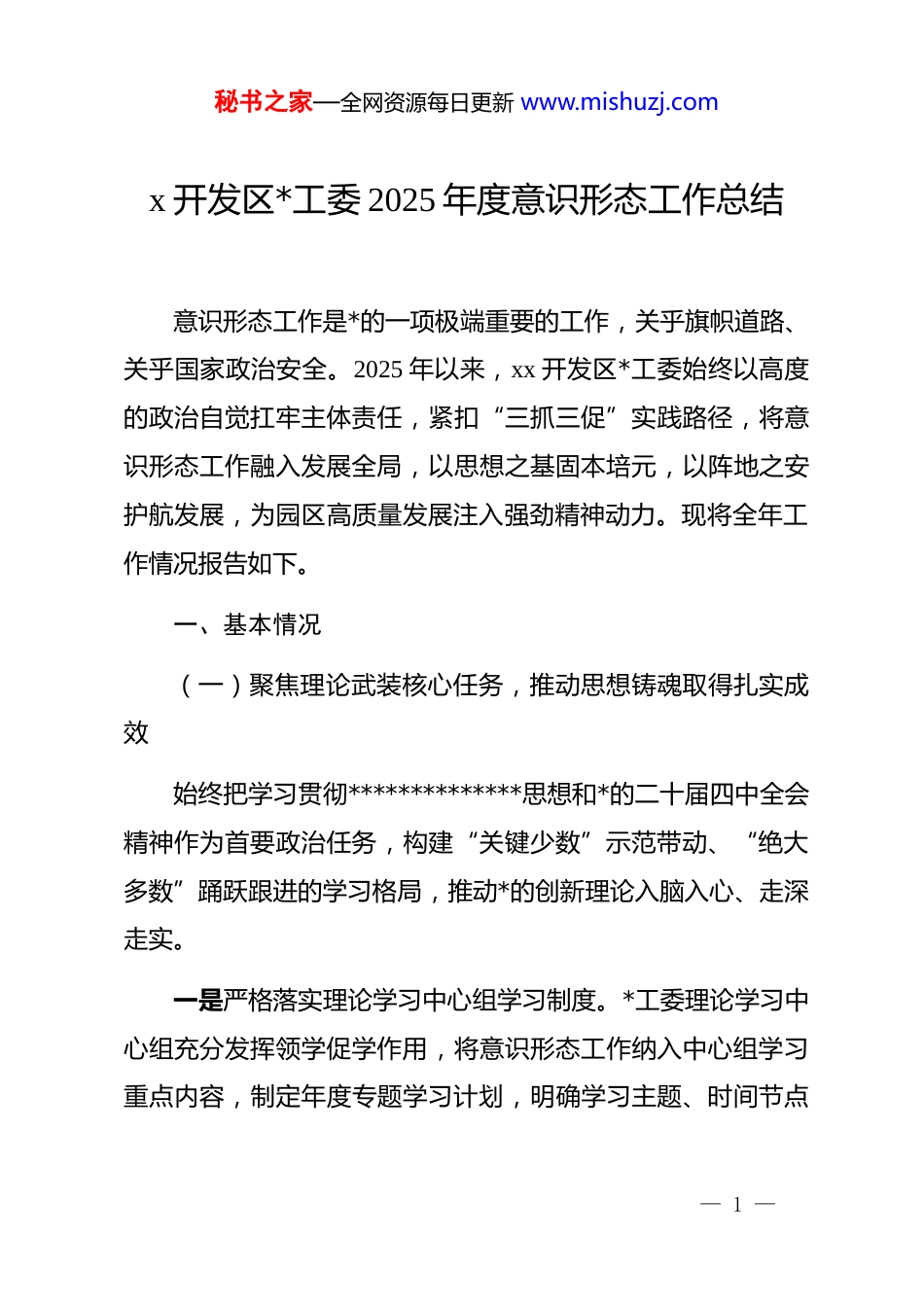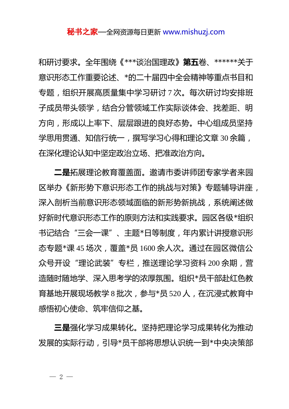 秘书之家—全网资源每日更新 www.mishuzj.comx 开发区*工委 2025 年度意识形态工作总结意识形态工作是*的一项极端重要的工作,关乎旗帜道路、关乎国家政治安全。2025 年以来,xx 开发区*工委始终以高度的政治自觉扛牢主体责任,紧扣“三抓三促”实践路径,将意识形态工作融入发展全局,以思想之基固本培元,以阵地之安护航发展,为园区高质量发展注入强劲精神动力。现将全年工作情况报告如下。一、基本情况(一)聚焦理论武装核心任务,推动思想铸魂取得扎实成效始终把学习贯彻**************思想和*的二十届四中全会精神作为首要政治任务,构建“关键少数”示范带动、“绝大多数”踊跃跟进的学习格局,推动*的创新理论入脑入心、走深走实。一是严格落实理论学习中心组学习制度。*工委理论学习中心组充分发挥领学促学作用,将意识形态工作纳入中心组学习重点内容,制定年度专题学习计划,明确学习主题、时间节点— 1 —秘书之家—全网资源每日更新 www.mishuzj.com和研讨要求。全年围绕《***谈治国理政》第五卷、******关于意识形态工作重要论述、*的二十届四中全会精神等重点书目和专题,组织开展高质量集中学习研讨 7 次。每次研讨均安排班子成员带头领学,结合分管领域工作实际谈体会、找差距、明方向,形成以上率下、层层跟进的良好态势。中心组成员坚持学思用贯通、知信行统一,撰写学习心得和理论文章 30 余篇,在深化理论认知中坚定政治立场、把准政治方向。二是拓展理论教育覆盖面。邀请市委讲师团专家学者来园区举办《新形势下意识形态工作的挑战与对策》专题辅导讲座,深入剖析当前意识形态领域面临的新形势新挑战,系统阐述做好新时代意识形态工作的原则方法和实践要求。园区各级*组织书记结合“三会一课”、主题*日等制度,年内累计讲授意识形态专题*课 45 场次,覆盖*员 1600 余人次。通过在园区微信公众号开设“理论武装”专栏,推送理论学习资料 200 余期,营造随时随地学、深入思考学的浓厚氛围。组织*员干部赴红色教育基地开展现场教学 8 批次,参与*员 520 人,在沉浸式教育中感悟初心使命、筑牢信仰之基。三是强化学习成果转化。坚持把理论学习成果转化为推动发展的实际行动,引导*员干部将思想认识统一到*中央决策部— 2 —秘书之家—全网资源每日更新 www.mishuzj.com署上来。成立园区项目攻坚*员先锋队,在重大项目建设、招商引资主战场设立*员示范岗,推动理论学习成果转化为破解发展难题、推动项目落地的具体实践。全年实现重点产业项目签约28 个,总投资达 156 亿元,其中*员骨干牵头推进项目占比超过85%,充分发挥理论武装对实践工作的引领和保障作用。四是完善学习督查评估机制。建立理论学习纪实管理制度,对中心组学习、支部学习、个人自学情况进行全程记录和动态管理。每季度开展学习情况专项检查,通过调阅学习笔记、组织随机测试、访谈*员干部等方式,检验学习实效。将理论学习情况纳入 dj 工作考核和干部年度考核重要内容,权重占比不低于 15%,确保学习任务硬落实、学习效果可量化。(二)强化问题整改政治担当,推动责任落实实现闭环管理坚持问题导向,以刀刃向内的政治勇气查摆意识形态领域短板弱项,建立问题发现、整改、提升全链条工作机制,推动意识形态工作从“软任务”变为“硬指标”。一是深入查摆剖析问题根源。在年度民主生活会召开前,专门开展意识形态领域专题研讨,聚焦“思想认识偏差”“责— 3 —秘书之家—全网资源每日更新 www.mishuzj.com任落实虚化”“阵地管理宽松软”等突出问题,组织班子成员对照检查、自我剖析。通过发放征求意见函、设立意见箱、召开座谈会等形式,广泛收集基层*组织和*员干部意见建议,梳理归纳问题清单 13 项。针对查摆出的问题,召开专题分析会,从政治站位、思想认识、能力作风等维度深挖根源,形成剖析材料,为靶向整改奠定坚实基础。二是压实整改责任链条。对历年意识形态工作中存在的问题进行全面梳理,建立“清单化管理、节点式推进、销号制落实”整改工作机制。制定《意识形态工作问题整改台账》,逐项明确整改措施、责任领导、责任部门、完成时限和验...