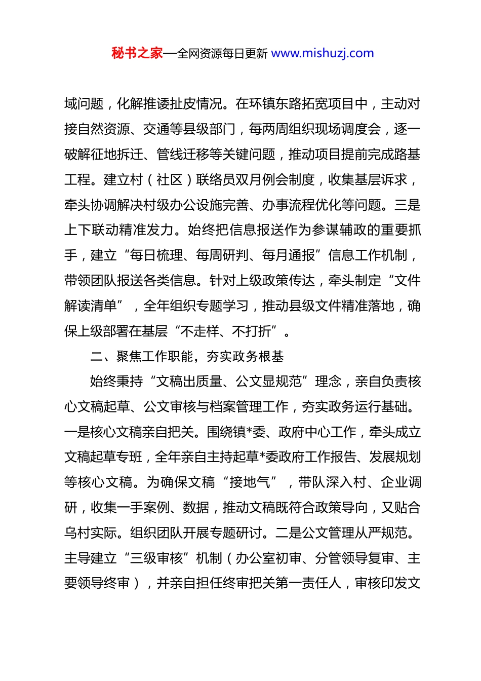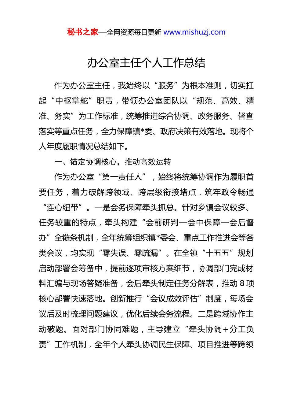 秘书之家—全网资源每日更新 www.mishuzj.com办公室主任个人工作总结作为办公室主任,我始终以“服务”为根本准则,切实扛起“中枢掌舵”职责,带领办公室团队以“规范、高效、精准、务实”为工作标准,统筹推进综合协调、政务服务、督查落实等重点任务,全力保障镇*委、政府决策有效落地。现将个人年度履职情况总结如下。一、锚定协调核心,推动高效运转作为办公室“第一责任人”,始终将统筹协调作为履职首要任务,着力破解跨领域、跨层级衔接堵点,筑牢政令畅通“连心纽带”。一是会务保障牵头抓总。针对乡镇会议较多、任务较重的特点,牵头构建“会前研判—会中保障—会后督办”全链条机制,全年统筹组织镇*委会、重点工作推进会等各类会议,均实现“零失误、零疏漏”。在全镇“十五五”规划启动部署会筹备中,提前逐项审核方案细节,协调部门完成材料汇编与现场答疑准备,会后牵头制定任务分解表,推动 8 项核心部署快速落地。创新推行“会议成效评估”制度,每场会议后及时梳理问题建议,优化后续会务流程。二是跨域协作主动破题。面对部门协同难题,主导建立“牵头协调+分工负责”工作机制,全年个人牵头协调民生保障、项目推进等跨领秘书之家—全网资源每日更新 www.mishuzj.com域问题,化解推诿扯皮情况。在环镇东路拓宽项目中,主动对接自然资源、交通等县级部门,每两周组织现场调度会,逐一破解征地拆迁、管线迁移等关键问题,推动项目提前完成路基工程。建立村(社区)联络员双月例会制度,收集基层诉求,牵头协调解决村级办公设施完善、办事流程优化等问题。三是上下联动精准发力。始终把信息报送作为参谋辅政的重要抓手,建立“每日梳理、每周研判、每月通报”信息工作机制,带领团队报送各类信息。针对上级政策传达,牵头制定“文件解读清单”,全年组织专题学习,推动县级文件精准落地,确保上级部署在基层“不走样、不打折”。二、聚焦工作职能,夯实政务根基始终秉持“文稿出质量、公文显规范”理念,亲自负责核心文稿起草、公文审核与档案管理工作,夯实政务运行基础。一是核心文稿亲自把关。围绕镇*委、政府中心工作,牵头成立文稿起草专班,全年亲自主持起草*委政府工作报告、发展规划等核心文稿。为确保文稿“接地气”,带队深入村、企业调研,收集一手案例、数据,推动文稿既符合政策导向,又贴合乌村实际。组织团队开展专题研讨。二是公文管理从严规范。主导建立“三级审核”机制(办公室初审、分管领导复审、主要领导终审),并亲自担任终审把关第一责任人,审核印发文秘书之家—全网资源每日更新 www.mishuzj.com件,纠正格式不规范、政策衔接不畅等问题,杜绝“带病文件”出台。优化公文流转流程,推行“收文登记—拟办—转办—督办—办结”闭环管理,个人每日督办重点文件流转情况,确保上级文件办结,平均流转时限缩短。三是档案工作提质增效。严格落实《档案法》要求,牵头制定档案整理规范,组织完成上年度文书档案、电子档案的归档工作,编制检索目录,实现调档全程可溯”。全年亲自协调解决档案查阅疑难问题。三、突出督查抓手,推动任务落地始终把督查作为推动工作的“利剑”,聚焦重点任务与民生关切,牵头构建全链条督查体系,确保决策部署“件件有着落”。一是重点任务精准督查。围绕“十五五”开局重点任务,牵头制定“周调度、月督查、季通报”方案,亲自带队开展专项督查,印发通报,推动古镇文化广场改造、康养养老服务中心建设等项目按计划推进。二是民生实事跟踪问效,聚焦民生实事,建立“一人一项目、两周一核查”督查机制,每月带队实地核查进展,全年推动村级道路硬化、安全饮水提升等实事全部办结。针对村级道路硬化工程,亲自协调解决资金缺口、施工矛盾等问题,确保群众出行难题得到解决;在安全饮水项目中,全程跟踪水源地改造。三是问题整改闭环推进,对上级督查、巡察反馈的问题,牵头建立“问题—措施—责任—秘书之家—全网资源每日更新 www.mishuzj.com时限”四张清单,制定整改措施,亲自审核每一项整改方案,组织“回头看”督查。四、立足服务保障,增强支撑能力秉持“后勤无小事、服务无止境”理念,亲自统筹后...