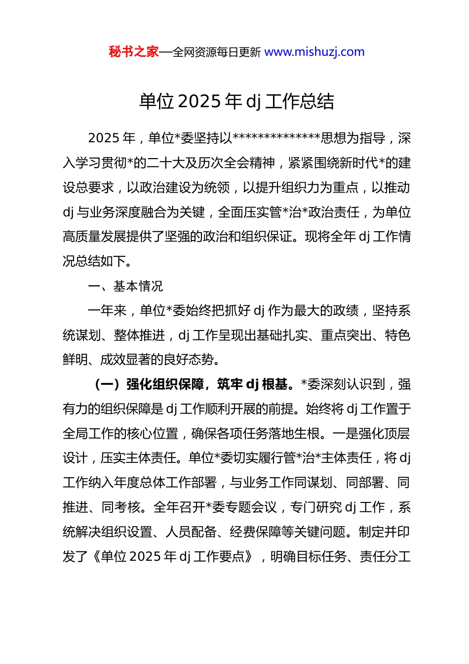 秘书之家—全网资源每日更新 www.mishuzj.com单位 2025 年 dj 工作总结2025 年,单位*委坚持以**************思想为指导,深入学习贯彻*的二十大及历次全会精神,紧紧围绕新时代*的建设总要求,以政治建设为统领,以提升组织力为重点,以推动dj 与业务深度融合为关键,全面压实管*治*政治责任,为单位高质量发展提供了坚强的政治和组织保证。现将全年 dj 工作情况总结如下。一、基本情况一年来,单位*委始终把抓好 dj 作为最大的政绩,坚持系统谋划、整体推进,dj 工作呈现出基础扎实、重点突出、特色鲜明、成效显著的良好态势。(一)强化组织保障,筑牢 dj 根基。*委深刻认识到,强有力的组织保障是 dj 工作顺利开展的前提。始终将 dj 工作置于全局工作的核心位置,确保各项任务落地生根。一是强化顶层设计,压实主体责任。单位*委切实履行管*治*主体责任,将 dj工作纳入年度总体工作部署,与业务工作同谋划、同部署、同推进、同考核。全年召开*委专题会议,专门研究 dj 工作,系统解决组织设置、人员配备、经费保障等关键问题。制定并印发了《单位 2025 年 dj 工作要点》,明确目标任务、责任分工秘书之家—全网资源每日更新 www.mishuzj.com和完成时限,形成了*委统一领导、部门齐抓共管、一级抓一级、层层抓落实的 dj 工作格局。将 dj 工作责任制落实情况作为领导班子和领导干部年度考核的重要依据,有效传导了压力,压实了责任。二是健全制度机制,提供坚实支撑。为确保 dj 工作规范化、长效化,不断完善制度体系。健全*委领导下的 dj工作联席会议制度,定期组织组织、宣传、纪检及各业务部门召开协调会,推动信息互通、资源共享、行动协同,形成工作合力。在经费保障上,坚持“财政投入为主、*费补充为辅”的原则,将 dj 工作经费全额纳入年度财政预算,并为重大专项活动设立专项经费,确保有钱办事、有场所议事。落实*委办公室和各*支部独立办公活动场所,精心打造集学习、活动、服务于一体的*员活动中心、“*员先锋岗”等工作阵地,为 dj 工作开展创造了良好条件。三是选优配强队伍,建强战斗堡垒。高度重视*务干部队伍建设,选拔政治强、业务精、作风硬的干部充实到*务工作岗位。成立由单位*委书记任组长,*委副书记任副组长,*委委员及各*支部书记为成员的 dj 工作领导小组,全面统筹协调。加强对*支部书记的培训和业务指导,举办*务干部专题培训班,显著提升了其履职能力。大力推进*员队伍建设,严格按照“控制总量、优化结构、提高质量、发挥作用”的总要求,全年发展新*员,优化了*员队伍结构。秘书之家—全网资源每日更新 www.mishuzj.com(二)深化思想引领,把稳政治方向。坚持把*的政治建设摆在首位,持续深化理论武装,引导广大*员干部坚定拥护“两个确立”、坚决做到“两个维护”。一是抓实理论学习,提升政治素养。将**************思想和*的最新理论创新成果作为*委理论学习中心组、*支部“三会一课”的核心内容,组织集中学习,专题研讨。依托学习强国等线上平台,推动理论学习常态化、制度化。在*内深入开展学习教育,引导*员干部读原著、学原文、悟原理,深刻领会其核心要义和实践要求,不断提高政治判断力、政治领悟力、政治执行力,确保单位各项工作始终沿着正确政治方向前进。二是传承红色基因,坚定理想信念。充分挖掘利用本地红色资源,将其作为坚定理想信念的生动教材。组织*员干部赴红色教育基地开展现场教学,重温入*誓词,感悟初心使命。邀请老*员、老战士组建“银发宣讲团”,深入基层*支部和一线团队,开展革命传统教育讲座,通过讲述革命故事、追忆奋斗历程,引导*员干部赓续红色血脉,传承红色基因,树牢忠诚干净担当的政治品格。三是加强意识形态,筑牢思想防线。严格落实意识形态工作责任制,*委定期分析研判意识形态领域风险点,加强对宣传阵地、网络平台的管理。组织开展意识形态专题培训,增强*员干部辨别是非、抵制错误思潮的能力。积极弘扬主旋律,传播正能量,选树宣传秘书之家—全网资源每日更新 www.mishuzj.com了一批在平凡岗位上作出不凡贡献的先进典型,营造了崇德向善、奋发向上的...