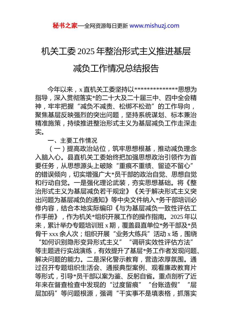 秘书之家—全网资源每日更新 www.mishuzj.com机关工委 2025 年整治形式主义推进基层减负工作情况总结报告今年以来,x 直机关工委坚持以**************思想为指导,深入贯彻落实*的二十大及二十届三中、四中全会精神,牢牢把握“减负不减责、松绑不松劲”的工作导向,聚焦基层反映强烈的突出问题,坚持系统谋划、标本兼治精准施策,持续推进整治形式主义为基层减负工作走深走实。一、主要工作情况(一)提高政治站位,筑牢思想根基,推动减负理念入脑入心。县直机关工委始终把加强思想政治引领作为首要任务,从思想源头上破除“重痕不重绩、留迹不留心”的错误倾向,切实增强广大*员干部的政治自觉、思想自觉和行动自觉。一是强化理论武装,夯实思想基础。将《整治形式主义为基层减负若干规定》《关于解决形式主义突出问题为基层减负的通知》等中央文件纳入*务干部培训必修内容,结合本地实际编印《与为基层减负一致性评估工作手册》,作为机关*组织开展工作的操作指南。2025 年以来,累计举办专题培训班 x 期,覆盖县直单位*务干部及*员骨干 xxx 余人次;组织开展“业务大练兵”活动 x 场,围绕“如何识别隐形变异形式主义”“调研实效性评估方法”等主题进行实战演练,有效提升了基层*务工作者发现问题、解决问题的能力。二是深化警示教育,营造浓厚氛围。通过召开专题组织生活会、通报典型案例、观看廉政教育片等形式,引导*员干部以案为鉴、反躬自省。重点剖析了近年来在督查检查中发现的“过度留痕”“台账造假”“层层加码”等问题根源,强调“干实事不是填表格,抓落实秘书之家—全网资源每日更新 www.mishuzj.com不能靠材料”,在全县机关系统掀起了一场“向形式主义亮剑”的思想革命。同时,充分利用微信公众号、电子屏宣传栏等载体,广泛宣传“轻车简从、务实高效”的工作导向,推动形成崇尚实干、抵制空转的良好生态。三是突出示范引领,发挥头雁效应。工委领导班子带头转变作风严格落实“一线工作法”,每月至少一次深入联系点单位蹲点调研,主动倾听基层声音,现场协调解决实际困难。要求各单位主要负责人履行第一责任人职责,做到重要任务亲自部署、重大问题亲自过问、重点环节亲自协调,带动全体机关干部树立正确政绩观和发展观。(二)健全制度机制,优化运行流程,构建长效治理体系。制度建设是根治形式主义的根本之策。县直机关工委坚持问题导向与目标导向相结合,着力从体制机制层面破解“上面千条线、下面一根针”的结构性矛盾,推动各项工作由“被动迎检”向“主动服务”转变。一是精简考核体系,变“繁文缛节”为“实绩导向”。针对以往 dj 考核中存在的“重资料、轻实效”“多头查、反复考”等问题,工委联合县委组织部对机关 dj 年度考评办法进行全面修订。取消原定的半年度集中检查,实行“年初明责、年中提醒、年末综合评价”的新模式;实地考核由每年两次压缩至一次,考核事项从 x 项精简为“政治建设、组织建设、作风建设、作用发挥、群众满意度”x 个核心维度,并建立负面清单管理制度,对出现形式主义典型问题的单位实行“一票否决”。同时,全面推行“四不两直”工作法,减少程序性负担。日常指导改为线上清单推送+季度动态提醒,变“纸质台账”为“数据支撑+实地验证”,真正实现“让数据多跑路、让干部少填表”。二是规范调研行为,打破“扎堆扰民”困局。工委牵头制定《县开展调研与为基层减负一致性评估工作机制》,明确所有县级部门赴乡镇、村社开展调研必须提前报备,填写《调研一致性评估审批表》,经审核通过后方可实施。在此基础上,建立“调研秘书之家—全网资源每日更新 www.mishuzj.com统筹调度平台”,每周汇总各部门调研计划,由工委办公室会同县委办、县政府办进行联合会审,防止时间集中、地点重叠、内容重复。每月与县工信局、国资委等部门召开联席会议,分析调研频次、范围、成效,提出优化建议2025 年至今,共受理并审批调研事项 xx 项,涉及 xx 个职能部门,未发生一起扎堆调研或违规陪同事件,基层普遍反映“终于有时间静下心来做事情了”。三是完善协同机制,打通部门壁垒。工委主动发挥桥梁纽带作...