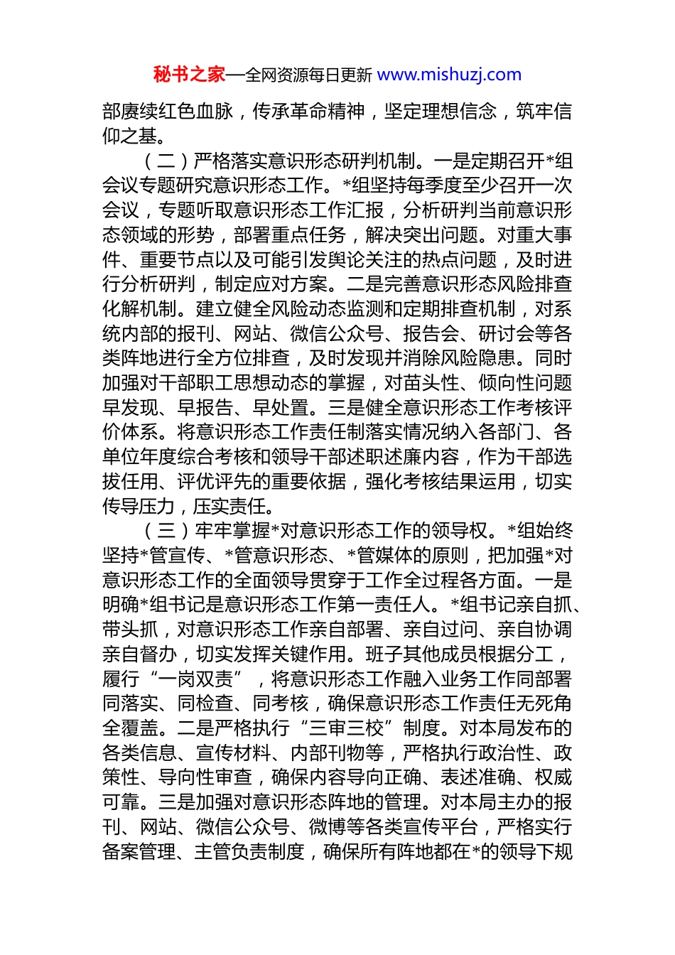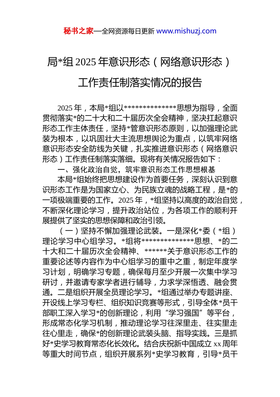 秘书之家—全网资源每日更新 www.mishuzj.com局*组 2025 年意识形态(网络意识形态)工作责任制落实情况的报告2025 年,本局*组以**************思想为指导,全面贯彻落实*的二十大和二十届历次全会精神,坚决扛起意识形态工作主体责任,坚持*管意识形态原则,以加强理论武装为根本,以巩固壮大主流思想舆论为重点,以筑牢网络意识形态安全防线为关键,扎实推进意识形态(网络意识形态)工作责任制落实落细。现将有关情况报告如下:一、强化政治自觉,筑牢意识形态工作思想根基本局*组始终把思想建设作为首要任务,深刻认识到意识形态工作是为国家立心、为民族立魂的战略工程,是*的一项极端重要的工作。2025 年,*组坚持以高度的政治自觉,不断深化理论学习,提升政治站位,为各项工作的顺利开展提供了坚实的思想保障和政治引领。(一)坚持不懈加强理论武装。一是深化*委(*组)理论学习中心组学习。*组将**************思想、*的二十大和二十届历次全会精神、******关于意识形态工作的重要论述等内容作为中心组学习的重中之重,制定年度学习计划,明确学习专题,确保每月至少开展一次集中学习研讨,并邀请专家学者进行辅导,力求学深悟透、融会贯通。二是组织开展全员理论学习。*组通过举办专题讲座、开设线上学习专栏、组织知识竞赛等形式,引导全体*员干部职工深入学习*的创新理论,利用“学习强国”等平台,形成常态化学习机制,推动理论学习往深里走、往实里走往心里走,确保*的创新理论武装头脑、指导实践。三是抓好*史学习教育常态化长效化。结合庆祝新中国成立 xx 周年等重大时间节点,组织开展系列*史学习教育,引导*员干秘书之家—全网资源每日更新 www.mishuzj.com部赓续红色血脉,传承革命精神,坚定理想信念,筑牢信仰之基。(二)严格落实意识形态研判机制。一是定期召开*组会议专题研究意识形态工作。*组坚持每季度至少召开一次会议,专题听取意识形态工作汇报,分析研判当前意识形态领域的形势,部署重点任务,解决突出问题。对重大事件、重要节点以及可能引发舆论关注的热点问题,及时进行分析研判,制定应对方案。二是完善意识形态风险排查化解机制。建立健全风险动态监测和定期排查机制,对系统内部的报刊、网站、微信公众号、报告会、研讨会等各类阵地进行全方位排查,及时发现并消除风险隐患。同时加强对干部职工思想动态的掌握,对苗头性、倾向性问题早发现、早报告、早处置。三是健全意识形态工作考核评价体系。将意识形态工作责任制落实情况纳入各部门、各单位年度综合考核和领导干部述职述廉内容,作为干部选拔任用、评优评先的重要依据,强化考核结果运用,切实传导压力,压实责任。(三)牢牢掌握*对意识形态工作的领导权。*组始终坚持*管宣传、*管意识形态、*管媒体的原则,把加强*对意识形态工作的全面领导贯穿于工作全过程各方面。一是明确*组书记是意识形态工作第一责任人。*组书记亲自抓、带头抓,对意识形态工作亲自部署、亲自过问、亲自协调亲自督办,切实发挥关键作用。班子其他成员根据分工,履行“一岗双责”,将意识形态工作融入业务工作同部署同落实、同检查、同考核,确保意识形态工作责任无死角全覆盖。二是严格执行“三审三校”制度。对本局发布的各类信息、宣传材料、内部刊物等,严格执行政治性、政策性、导向性审查,确保内容导向正确、表述准确、权威可靠。三是加强对意识形态阵地的管理。对本局主办的报刊、网站、微信公众号、微博等各类宣传平台,严格实行备案管理、主管负责制度,确保所有阵地都在*的领导下规秘书之家—全网资源每日更新 www.mishuzj.com范运行。二、全面落实主体责任,构建意识形态工作坚强防线本局*组坚持把落实意识形态工作责任制作为硬任务,构建科学严密的责任体系,确保各项工作有人抓、有人管抓得实、有成效。(一)健全责任体系,层层压实责任链条。一是明确主体责任。*组作为本局意识形态工作的主体,对全局意识形态工作负总责。*组书记是第一责任人,对重要工作亲自部署,重要问题亲自过问,重要环节亲自协调,重要案件亲自督办。分管领导是直接责任人,按照职责分工抓好分管领域的意识形...