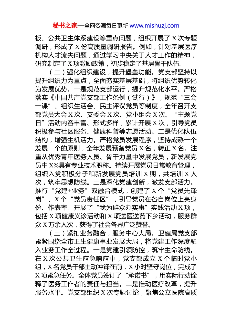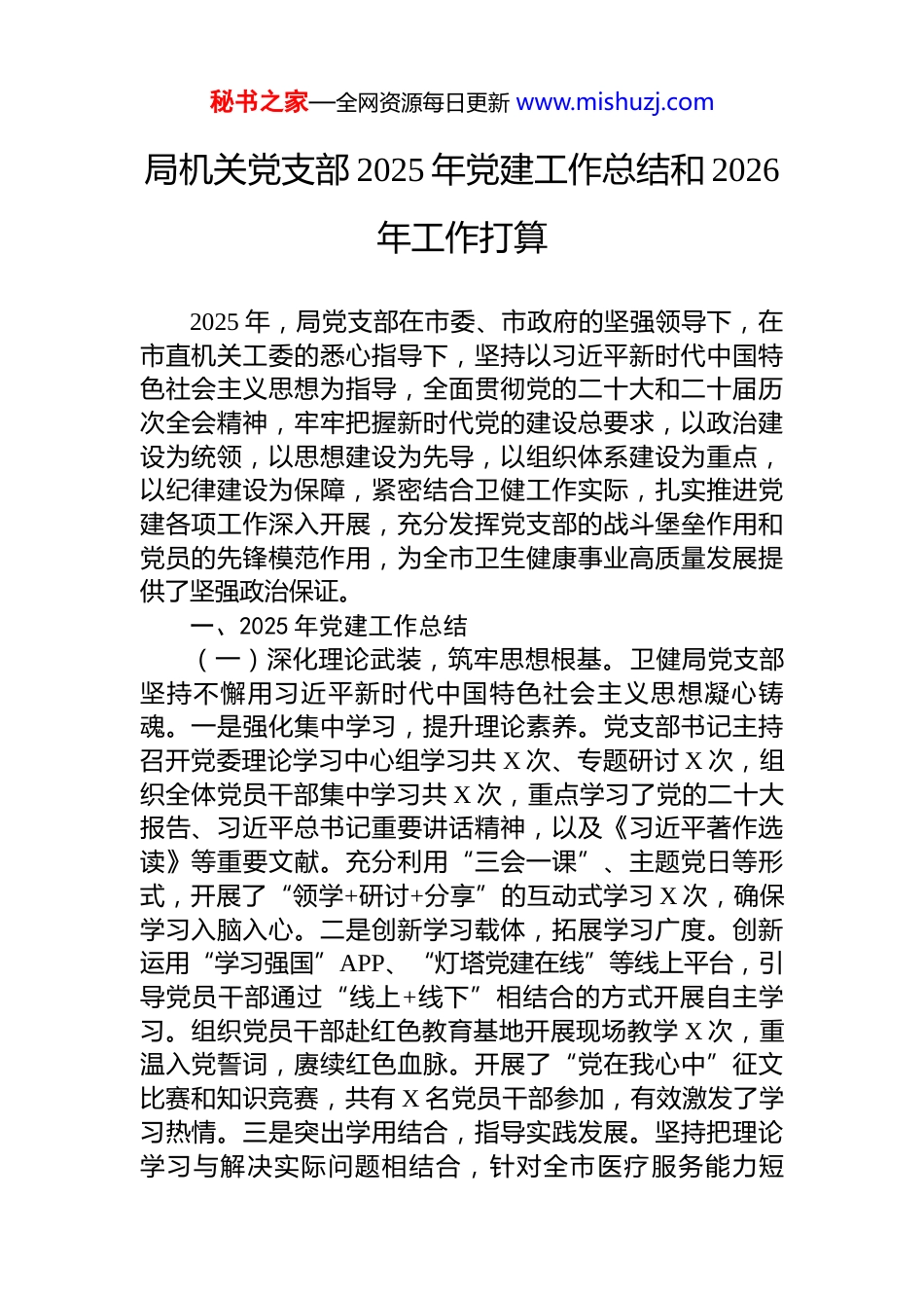 秘书之家—全网资源每日更新 www.mishuzj.com局机关党支部 2025 年党建工作总结和 2026年工作打算2025 年,局党支部在市委、市政府的坚强领导下,在市直机关工委的悉心指导下,坚持以习近平新时代中国特色社会主义思想为指导,全面贯彻党的二十大和二十届历次全会精神,牢牢把握新时代党的建设总要求,以政治建设为统领,以思想建设为先导,以组织体系建设为重点,以纪律建设为保障,紧密结合卫健工作实际,扎实推进党建各项工作深入开展,充分发挥党支部的战斗堡垒作用和党员的先锋模范作用,为全市卫生健康事业高质量发展提供了坚强政治保证。一、2025 年党建工作总结(一)深化理论武装,筑牢思想根基。卫健局党支部坚持不懈用习近平新时代中国特色社会主义思想凝心铸魂。一是强化集中学习,提升理论素养。党支部书记主持召开党委理论学习中心组学习共 X 次、专题研讨 X 次,组织全体党员干部集中学习共 X 次,重点学习了党的二十大报告、习近平总书记重要讲话精神,以及《习近平著作选读》等重要文献。充分利用“三会一课”、主题党日等形式,开展了“领学+研讨+分享”的互动式学习 X 次,确保学习入脑入心。二是创新学习载体,拓展学习广度。创新运用“学习强国”APP、“灯塔党建在线”等线上平台,引导党员干部通过“线上+线下”相结合的方式开展自主学习。组织党员干部赴红色教育基地开展现场教学 X 次,重温入党誓词,赓续红色血脉。开展了“党在我心中”征文比赛和知识竞赛,共有 X 名党员干部参加,有效激发了学习热情。三是突出学用结合,指导实践发展。坚持把理论学习与解决实际问题相结合,针对全市医疗服务能力短秘书之家—全网资源每日更新 www.mishuzj.com板、公共卫生体系建设等重点问题,组织开展了 X 次专题调研,形成了 X 份高质量调研报告。例如,针对基层医疗机构人才流失问题,通过学习中央关于人才工作的精神,研究制定了 X 项激励政策,初步稳定了基层骨干队伍。(二)强化组织建设,提升堡垒功能。党支部坚持以提升组织力为重点,全面夯实基层基础,将组织优势转化为发展优势。一是规范支部运行,提升规范化水平。严格落实《中国共产党支部工作条例(试行)》,规范“三会一课”、组织生活会、民主评议党员等制度,全年召开支部党员大会 X 次、支委会 X 次、党小组会 X 次。“主题党日”活动内容丰富、形式多样,累计开展 X 次,引导党员积极参与社区服务、健康科普等志愿活动。二是优化队伍结构,增强生机活力。严格党员发展程序,坚持成熟一个发展一个的原则,全年发展预备党员 X 名,转正 X 名。注重从优秀青年医务人员、骨干力量中发展党员,新发展党员中 X%具有专业技术职称。持续开展党员日常教育管理,组织入党积极分子和新发展党员培训 X 期,共培训 X 人次,筑牢思想防线。三是深化党建创新,激发支部活力。推行“党建+业务”双融合模式,创建了 X 个“党员先锋岗”、X 个“党员责任区”,引导党员在各自岗位上亮身份、作表率。开展了“我为群众办实事”实践活动 X 项,包括 X 项健康义诊活动和 X 项送医送药下乡活动,服务群众 X 万余人次,获得了社会各界广泛赞誉。(三)紧扣业务融合,服务中心大局。卫健局党支部紧紧围绕全市卫生健康事业发展大局,将党建工作深度融入业务工作全过程。一是党建引领防控,筑牢生命防线。在 X 次公共卫生应急响应中,党支部成立 X 个临时党小组,X 名党员干部主动冲锋在前,X 小时坚守岗位,完成了X 项紧急任务。全体党员签订了“承诺书”,用实际行动诠释了医务工作者的责任与担当。二是推动医疗改革,提升服务水平。党支部组织 X 次专题讨论,聚焦公立医院高质秘书之家—全网资源每日更新 www.mishuzj.com量发展、医共体建设等重点任务,形成了 X 项改革方案。通过党员带头攻坚,推广 X 项适宜技术,使 X 个社区卫生服务中心服务能力得到明显提升。三是助力健康 X 建设,增进民生福祉。组织党员干部深入社区、乡村开展健康宣教 X 场次,推广健康生活方式。例如,在 X 区试点推广 X项慢性病管理模式,使 X 名高血压、糖尿...