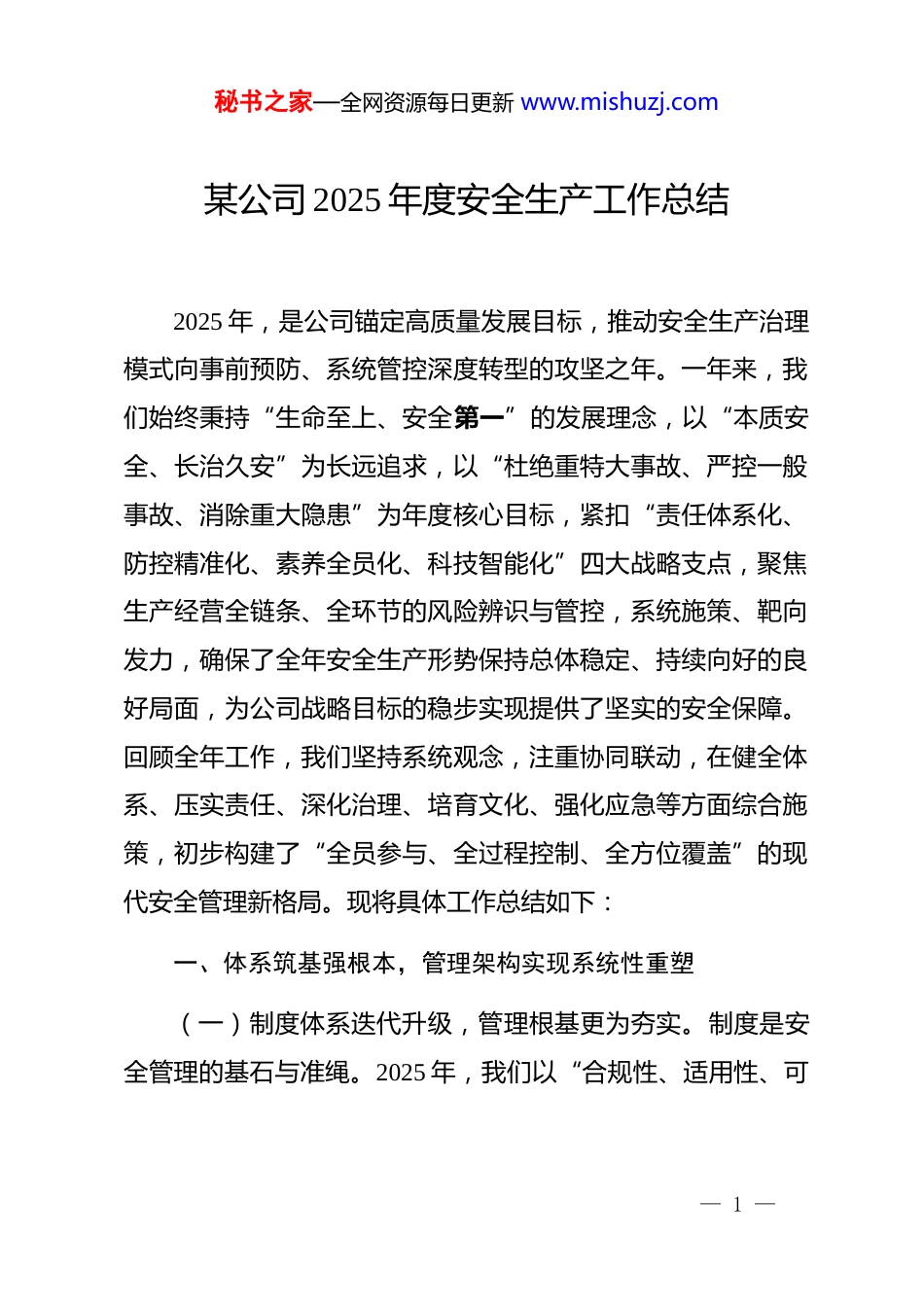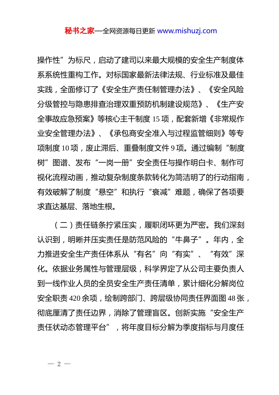 秘书之家—全网资源每日更新 www.mishuzj.com某公司 2025 年度安全生产工作总结2025 年,是公司锚定高质量发展目标,推动安全生产治理模式向事前预防、系统管控深度转型的攻坚之年。一年来,我们始终秉持“生命至上、安全第一”的发展理念,以“本质安全、长治久安”为长远追求,以“杜绝重特大事故、严控一般事故、消除重大隐患”为年度核心目标,紧扣“责任体系化、防控精准化、素养全员化、科技智能化”四大战略支点,聚焦生产经营全链条、全环节的风险辨识与管控,系统施策、靶向发力,确保了全年安全生产形势保持总体稳定、持续向好的良好局面,为公司战略目标的稳步实现提供了坚实的安全保障。回顾全年工作,我们坚持系统观念,注重协同联动,在健全体系、压实责任、深化治理、培育文化、强化应急等方面综合施策,初步构建了“全员参与、全过程控制、全方位覆盖”的现代安全管理新格局。现将具体工作总结如下:一、体系筑基强根本,管理架构实现系统性重塑(一)制度体系迭代升级,管理根基更为夯实。制度是安全管理的基石与准绳。2025 年,我们以“合规性、适用性、可— 1 —秘书之家—全网资源每日更新 www.mishuzj.com操作性”为标尺,启动了建司以来最大规模的安全生产制度体系系统性重构工作。对标国家最新法律法规、行业标准及最佳实践,全面修订了《安全生产责任制管理办法》、《安全风险分级管控与隐患排查治理双重预防机制建设规范》、《生产安全事故应急预案》等核心主干制度 15 项,配套新增《非常规作业安全管理办法》、《承包商安全准入与过程监管细则》等专项制度 10 项,废止滞后、重叠制度文件 9 项。通过编制“制度树”图谱、发布“一岗一册”安全责任与操作明白卡、制作可视化流程动画,推动复杂制度条款转化为简洁明了的行动指南,有效破解了制度“悬空”和执行“衰减”难题,确保了各项要求直达基层、落地生根。(二)责任链条拧紧压实,履职闭环更为严密。我们深刻认识到,明晰并压实责任是防范风险的“牛鼻子”。年内,全力推进安全生产责任体系从“有名”向“有实”、“有效”深化。依据业务属性与管理层级,科学界定了从公司主要负责人到一线作业人员的全员安全生产责任清单,累计细化分解岗位安全职责 420 余项,绘制跨部门、跨层级协同责任界面图 48 张,彻底厘清了责任边界,消除了管理盲区。创新实施“安全生产责任状动态管理平台”,将年度目标分解为季度指标与月度任— 2 —秘书之家—全网资源每日更新 www.mishuzj.com务,通过“线上签约、过程留痕、自动预警、在线督办”模式,实现责任履行情况的实时监控与量化考核。全年组织责任落实专项审计与穿透式检查 23 次,下发督办单 67 份,推动解决责任传导不畅、履职不到位问题 89 个,形成了“明责、履责、督责、问责”的强力闭环。(三)业务安全深度融合,协同效能更为凸显。坚持“管业务必须管安全”的原则,致力于将安全管理深度嵌入业务流程价值链。在项目策划、工艺设计、设备选型、采购招标、生产运行、检维修、物流运输等各业务环节,前置安全风险评估,强制嵌入安全审批节点与技术管控措施。建立了“业务方案与安全措施同步编制、同步评审、同步落实”的工作机制,在新建项目、技术改造中全面推行“安全设计专篇”审查。通过业务流程再造,将安全要求固化为 it 系统里的必填项、审批流中的必经环节,利用 erp、mes 及专属安全信息平台的数据互通,实现了业务流、信息流与安全风险流的同步感知与智能联动,从根本上改变了安全与业务“两张皮”现象。二、风险防控织密网,隐患治理迈向精准化靶向(一)风险辨识动态覆盖,预警预控更为超前。树立“视隐 患 为 事 故 ” 的 理 念 , 全 面 升 级 风 险 管 控 机 制 。 运 用— 3 —秘书之家—全网资源每日更新 www.mishuzj.comhazop、jsa、lec 等多种分析方法,组织完成了对全公司所有作业活动、设备设施、工艺环节的第三轮系统性风险再辨识、再评估,更新发布公司级重大风险清单 12 项、部门级较大风险清单 85 项,全部落实“一风险一档案、一措施一责任人”管理。引入物...
