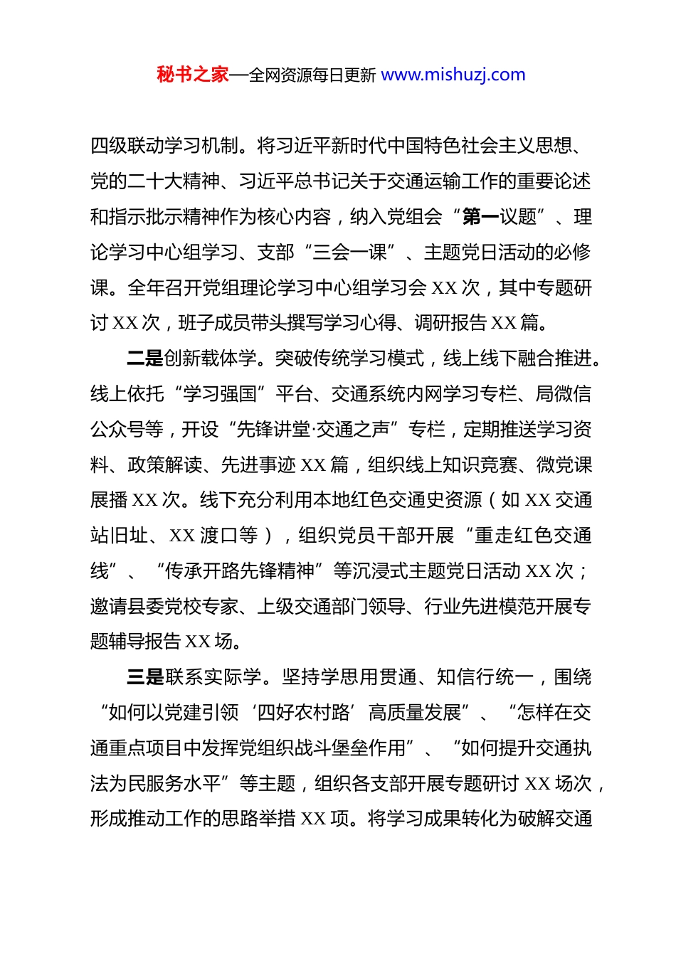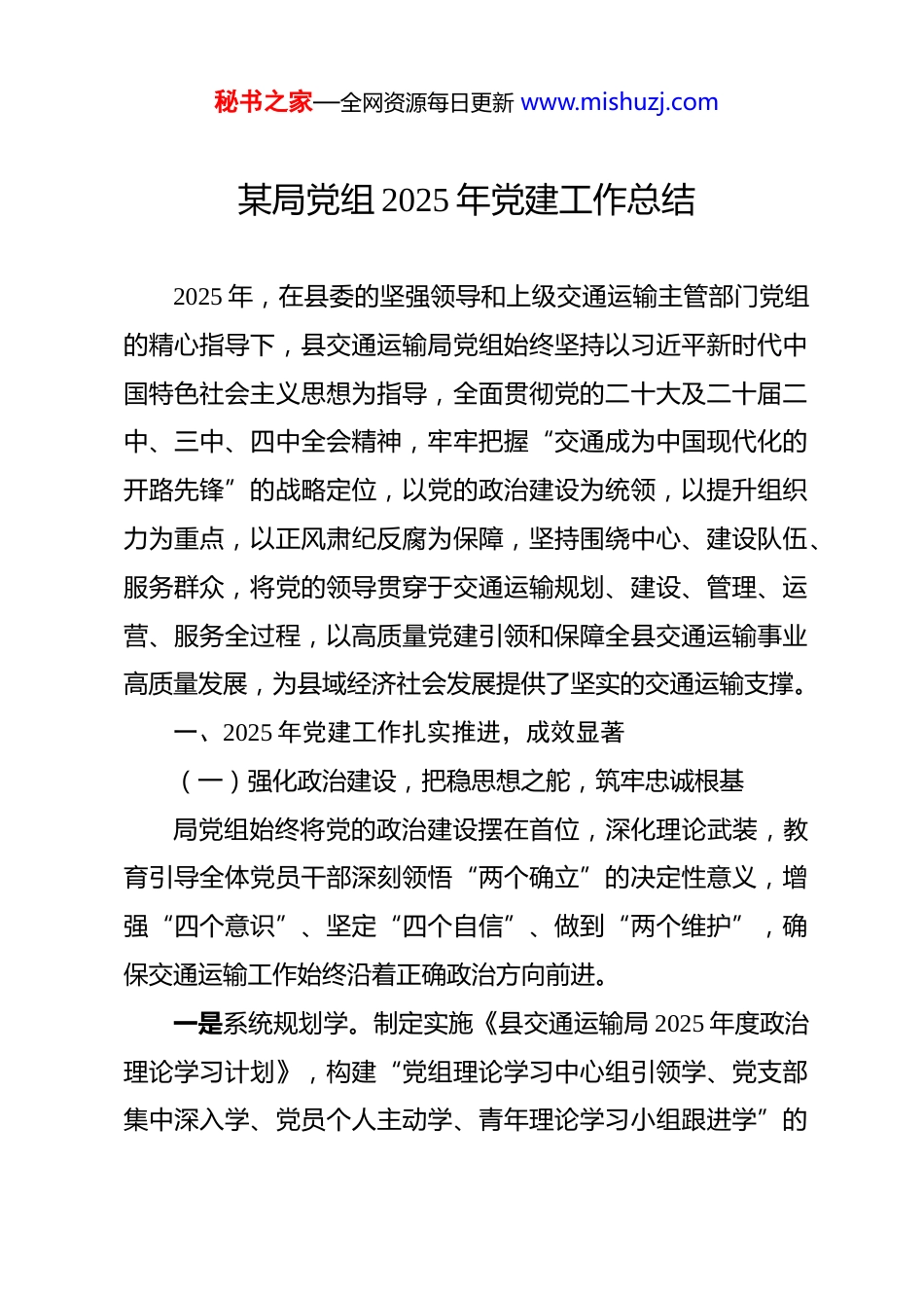 秘书之家—全网资源每日更新 www.mishuzj.com某局党组 2025 年党建工作总结 2025 年,在县委的坚强领导和上级交通运输主管部门党组的精心指导下,县交通运输局党组始终坚持以习近平新时代中国特色社会主义思想为指导,全面贯彻党的二十大及二十届二中、三中、四中全会精神,牢牢把握“交通成为中国现代化的开路先锋”的战略定位,以党的政治建设为统领,以提升组织力为重点,以正风肃纪反腐为保障,坚持围绕中心、建设队伍、服务群众,将党的领导贯穿于交通运输规划、建设、管理、运营、服务全过程,以高质量党建引领和保障全县交通运输事业高质量发展,为县域经济社会发展提供了坚实的交通运输支撑。一、2025 年党建工作扎实推进,成效显著(一)强化政治建设,把稳思想之舵,筑牢忠诚根基局党组始终将党的政治建设摆在首位,深化理论武装,教育引导全体党员干部深刻领悟“两个确立”的决定性意义,增强“四个意识”、坚定“四个自信”、做到“两个维护”,确保交通运输工作始终沿着正确政治方向前进。一是系统规划学。制定实施《县交通运输局 2025 年度政治理论学习计划》,构建“党组理论学习中心组引领学、党支部集中深入学、党员个人主动学、青年理论学习小组跟进学”的秘书之家—全网资源每日更新 www.mishuzj.com四级联动学习机制。将习近平新时代中国特色社会主义思想、党的二十大精神、习近平总书记关于交通运输工作的重要论述和指示批示精神作为核心内容,纳入党组会“第一议题”、理论学习中心组学习、支部“三会一课”、主题党日活动的必修课。全年召开党组理论学习中心组学习会 XX 次,其中专题研讨 XX 次,班子成员带头撰写学习心得、调研报告 XX 篇。二是创新载体学。突破传统学习模式,线上线下融合推进。线上依托“学习强国”平台、交通系统内网学习专栏、局微信公众号等,开设“先锋讲堂·交通之声”专栏,定期推送学习资料、政策解读、先进事迹 XX 篇,组织线上知识竞赛、微党课展播 XX 次。线下充分利用本地红色交通史资源(如 XX 交通站旧址、XX 渡口等),组织党员干部开展“重走红色交通线”、“传承开路先锋精神”等沉浸式主题党日活动 XX 次;邀请县委党校专家、上级交通部门领导、行业先进模范开展专题辅导报告 XX 场。三是联系实际学。坚持学思用贯通、知信行统一,围绕“如何以党建引领‘四好农村路’高质量发展”、“怎样在交通重点项目中发挥党组织战斗堡垒作用”、“如何提升交通执法为民服务水平”等主题,组织各支部开展专题研讨 XX 场次,形成推动工作的思路举措 XX 项。将学习成果转化为破解交通秘书之家—全网资源每日更新 www.mishuzj.com发展难题、服务群众安全便捷出行的具体行动,确保党中央决策部署和上级工作要求在交通运输领域不折不扣落到实处。(二)夯实组织基础,建强战斗堡垒,激发队伍活力牢固树立大抓基层的鲜明导向,以提升组织力为重点,推动基层党组织全面进步、全面过硬,打造交通运输事业的坚强战斗堡垒。一是健全组织体系,压实领导责任。严格落实《中国共产党党组工作条例》,修订完善《局党组工作规则》、《局党组议事决策目录清单》,进一步厘清党组与其他治理主体的权责边界,全年召开党组会议 XX 次,研究“三重一大”事项 XX项,确保党组把方向、管大局、保落实的领导作用充分发挥。优化基层党组织设置,结合机构改革和业务实际,新成立项目一线临时党支部 X 个,调整优化局属单位党支部 X 个。选优配强支部书记,全年调整配备支部书记 X 名,全部由部门(单位)党员主要负责人担任。严格落实党员领导干部双重组织生活制度。二是推进标准化建设,提升党建质量。制定《县交通运输系统党支部标准化规范化建设考评细则》,从政治建设、组织设置、班子建设、组织生活、党员管理、基础保障、作用发挥等 X 个方面明确 XX 项具体标准。深入开展党支部“达标创秘书之家—全网资源每日更新 www.mishuzj.com优”行动,组织各支部对照标准自查整改,局党组开展全覆盖督导检查 X 轮,评选命名“五星级”党支部 X 个。严格规范“三会一课”、组织生活会、民主评议党员、谈心谈...