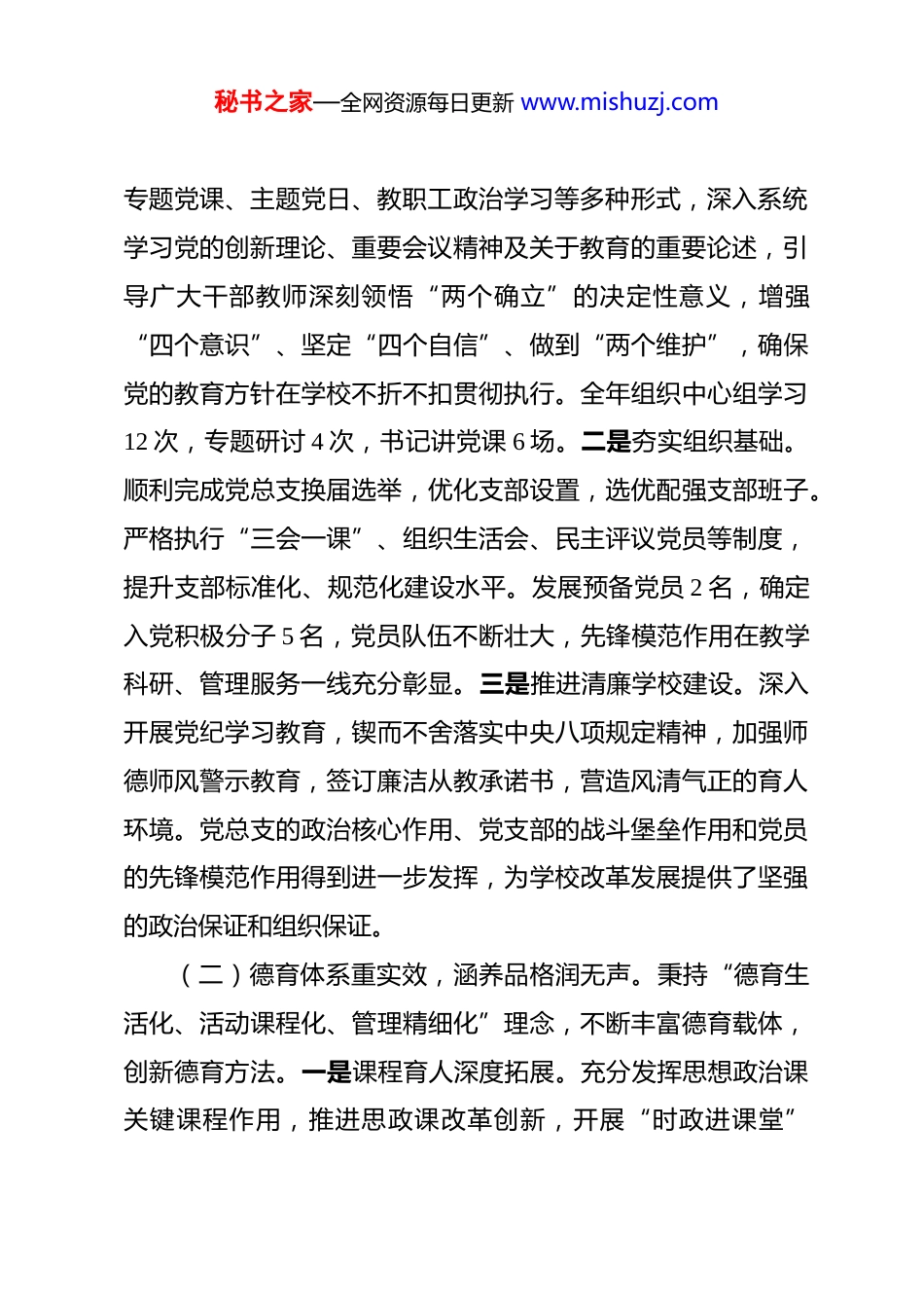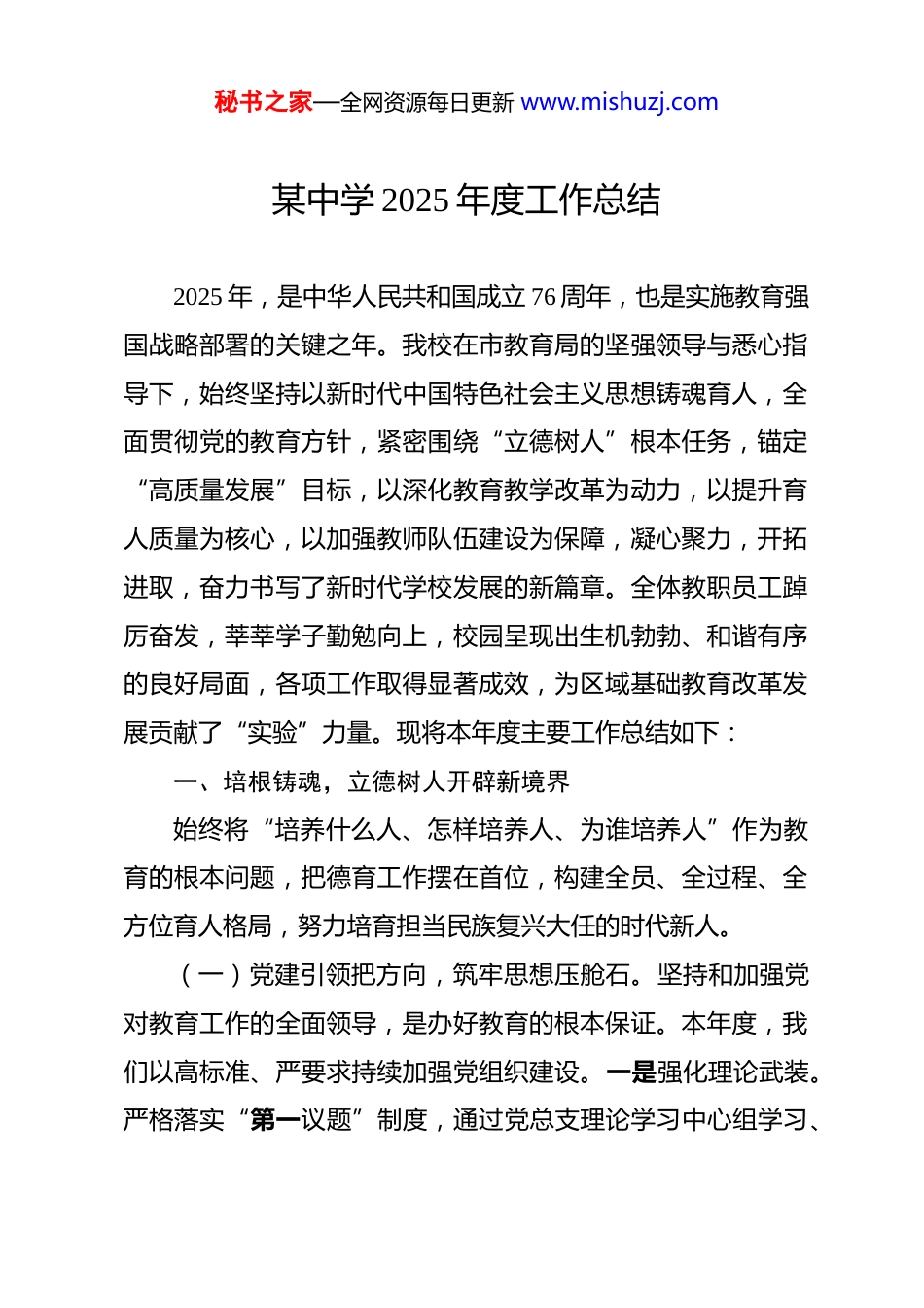 秘书之家—全网资源每日更新 www.mishuzj.com某中学 2025 年度工作总结 2025 年,是中华人民共和国成立 76 周年,也是实施教育强国战略部署的关键之年。我校在市教育局的坚强领导与悉心指导下,始终坚持以新时代中国特色社会主义思想铸魂育人,全面贯彻党的教育方针,紧密围绕“立德树人”根本任务,锚定“高质量发展”目标,以深化教育教学改革为动力,以提升育人质量为核心,以加强教师队伍建设为保障,凝心聚力,开拓进取,奋力书写了新时代学校发展的新篇章。全体教职员工踔厉奋发,莘莘学子勤勉向上,校园呈现出生机勃勃、和谐有序的良好局面,各项工作取得显著成效,为区域基础教育改革发展贡献了“实验”力量。现将本年度主要工作总结如下:一、培根铸魂,立德树人开辟新境界始终将“培养什么人、怎样培养人、为谁培养人”作为教育的根本问题,把德育工作摆在首位,构建全员、全过程、全方位育人格局,努力培育担当民族复兴大任的时代新人。(一)党建引领把方向,筑牢思想压舱石。坚持和加强党对教育工作的全面领导,是办好教育的根本保证。本年度,我们以高标准、严要求持续加强党组织建设。一是强化理论武装。严格落实“第一议题”制度,通过党总支理论学习中心组学习、秘书之家—全网资源每日更新 www.mishuzj.com专题党课、主题党日、教职工政治学习等多种形式,深入系统学习党的创新理论、重要会议精神及关于教育的重要论述,引导广大干部教师深刻领悟“两个确立”的决定性意义,增强“四个意识”、坚定“四个自信”、做到“两个维护”,确保党的教育方针在学校不折不扣贯彻执行。全年组织中心组学习12 次,专题研讨 4 次,书记讲党课 6 场。二是夯实组织基础。顺利完成党总支换届选举,优化支部设置,选优配强支部班子。严格执行“三会一课”、组织生活会、民主评议党员等制度,提升支部标准化、规范化建设水平。发展预备党员 2 名,确定入党积极分子 5 名,党员队伍不断壮大,先锋模范作用在教学科研、管理服务一线充分彰显。三是推进清廉学校建设。深入开展党纪学习教育,锲而不舍落实中央八项规定精神,加强师德师风警示教育,签订廉洁从教承诺书,营造风清气正的育人环境。党总支的政治核心作用、党支部的战斗堡垒作用和党员的先锋模范作用得到进一步发挥,为学校改革发展提供了坚强的政治保证和组织保证。(二)德育体系重实效,涵养品格润无声。秉持“德育生活化、活动课程化、管理精细化”理念,不断丰富德育载体,创新德育方法。一是课程育人深度拓展。充分发挥思想政治课关键课程作用,推进思政课改革创新,开展“时政进课堂”秘书之家—全网资源每日更新 www.mishuzj.com“党史故事我来讲”等活动,提升思政课的吸引力和感染力。强化学科德育渗透,挖掘各学科蕴含的德育资源,使知识传授与价值引领同频共振。开发了《实验学子礼仪规范》《走近中华优秀传统文化》等校本德育读本。二是活动育人精彩纷呈。以重大节日、纪念日为契机,组织开展“传承红色基因,争做时代新人”主题系列教育活动、清明祭英烈、国家公祭日主题教育、“五四”青春仪式、“十一”向国旗敬礼等活动,厚植家国情怀。利用网络平台,及时推送家校共育资讯,引导家长树立科学育儿观念,凝聚育人合力。(三)心育护航促成长,阳光心态伴前行。高度重视学生心理健康,将其作为落实立德树人任务的重要一环。一是完善心育工作网络。健全“学校—年级—班级—宿舍”四级预警防控体系,配齐配强专兼职心理健康教师队伍,目前拥有国家二级心理咨询师 3 名,兼职心理教师 8 名。高标准维护使用个体咨询室、沙盘室、宣泄室、团体辅导室等专业场所。二是提升心育课程质量。在高一、高二年级全面开设心理健康教育课程,纳入课表,保证每两周 1 课时。课程内容聚焦适应性调节、人际关系、情绪管理、生涯规划等主题,促进学生心理素质提升。三是深化个体与团体辅导。心理咨询室全天候开放,本年度接待个体咨询 260 余人次,实施心理危机干预,均得到妥善处理。秘书之家—全网资源每日更新 www.mishuzj.com针对不同群体需求,开展“新生适应性”“考前减压”“人际沟通”等...