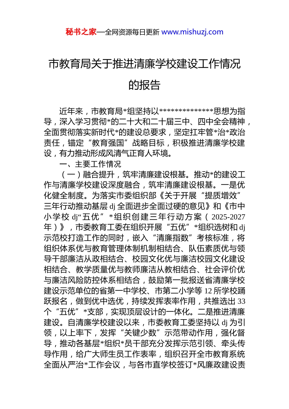 秘书之家—全网资源每日更新 www.mishuzj.com市教育局关于推进清廉学校建设工作情况的报告近年来,市教育局*组坚持以**************思想为指导,深入学习贯彻*的二十大和二十届三中、四中全会精神,全面贯彻落实新时代*的建设总要求,坚定扛牢管*治*政治责任,锚定“教育强国”战略目标,积极推进清廉学校建设,有力推动形成风清气正育人环境。一、主要工作情况(一)融合提升,筑牢清廉建设根基。推动*的建设工作与清廉学校建设深度融合,筑牢清廉建设根基。一是优化健全制度。为落实市委组织部《关于开展“提质增效”三年行动推动基层 dj 全面进步全面过硬的意见》和《市中小学校 dj“五优”*组织创建三年行动方案( 2025-2027年)》,市委教育工委在组织开展“五优”*组织选树和 dj示范校打造工作的同时,嵌入“清廉指数”考核标准,将组织体系优与教育管理体制机制相结合、队伍素质优与领导干部廉洁从政相结合、校园文化优与廉洁校园文化建设相结合、教学质量优与教师廉洁从教相结合、社会评价优与廉洁风险防控体系相结合,鼓励第一批报送省清廉学校建设示范单位的省第一中学校、市第二小学等 12 所学校踊跃报名,做到优中选优,持续发挥表率作用,共推选出 33个“五优”*支部,实现顶层设计的一体化。二是推进清廉建设。自清廉学校建设以来,市委教育工委坚持以 dj 为引领,以上率下,发挥“关键少数”示范带动作用,强化督导,推动各基层*组织*员干部充分发挥示范引领、牵头传导作用,给广大师生员工作表率,组织召开全市教育系统全面从严治*工作会议,与各市直学校签订*风廉政建设责秘书之家—全网资源每日更新 www.mishuzj.com任书,把清廉学校建设作为纵深推进全面从严治*的重要抓手,利用主题*日活动等,定期组织*员干部观看警示教育片等,引导*员干部崇廉尚廉。截至目前,全市教育系统*组织书记、思政课教师累计上*课 3024 节,制定 dj 工作清单 1810 条,组织 dj 学习教育研讨 155 次,57 名基层*组织书记讲纪律专题*课,观看警示教育片 78 次,用身边事警示教育身边人,使纪法教育入脑入心,提升了*员干部的纪法观念和廉洁意识。三是选树清廉榜样。在评选优秀*员、优秀*务工作者、优秀教师时,将廉洁自律作为首要前提和一票否决指标,确保评选出的先进典型同时也是清廉榜样,充分发挥双向示范效应。组织教师开展从教宣誓、签订师德承诺书、拒绝有偿家教倡议等活动,守牢廉洁底线,全面开展师德师风专项整治,全市各级各类学校均设置了举报电话、举报箱,共设置师生谈心谈话室 1571 个;与教师谈心谈话达 58598 人次,对 44629 名专任教师师德师风表现情况进行了摸底评议,选树“身边的师德榜样”1003 名。通过深度融合,dj 工作为清廉学校建设提供了强大的组织保障,提升了学校的治理效能。(二)浸润熏陶,彰显清廉校风校貌。聚焦打造可感、可知、可学的校园廉洁文化,实现润物无声的教化功能。一是丰富平台载体。各级各类学校围绕市委教育工委相关工作要求,深挖本地廉洁文化元素,全力推进立足“一校一品”“一校多品”清廉学校品牌建设,精心规划校园空间,打造清廉文化长廊、清风书角、廉洁主题园林等。利用橱窗、电子屏、楼道墙壁等载体,张贴清廉格言、警句师生书画作品。截至目前,全市各级各类学校共设立文化墙 1914 块、宣传板 3355 块、黑板报 52268 块、专题馆 138间、校史馆 105 间、dj 馆 229 间、家风馆 67 间、清廉长廊505 个、清廉教室 3432 间、清廉广场 142 个、清廉书柜1438 个、清廉图书角 2537 个,发挥各类宣传平台的作用,着力打造清廉学校品牌,绘就学校教育清廉底色。二是开秘书之家—全网资源每日更新 www.mishuzj.com展文化活动。市第一小学围绕廉洁主题,开展丰富多彩的校园文化活动。如举办“清风拂校园”主题班会比赛、“我身边的廉洁故事”征文演讲活动、廉洁主题板报创作等,让师生成为清廉文化的参与者和传播者。市第二小学利用假期,鼓励学生与家长共同参与社区志愿服务活动,以小手拉大手的方式,讲述家庭中的廉洁故事,引导家属共筑家庭廉洁防线,让清廉之风吹拂校园...