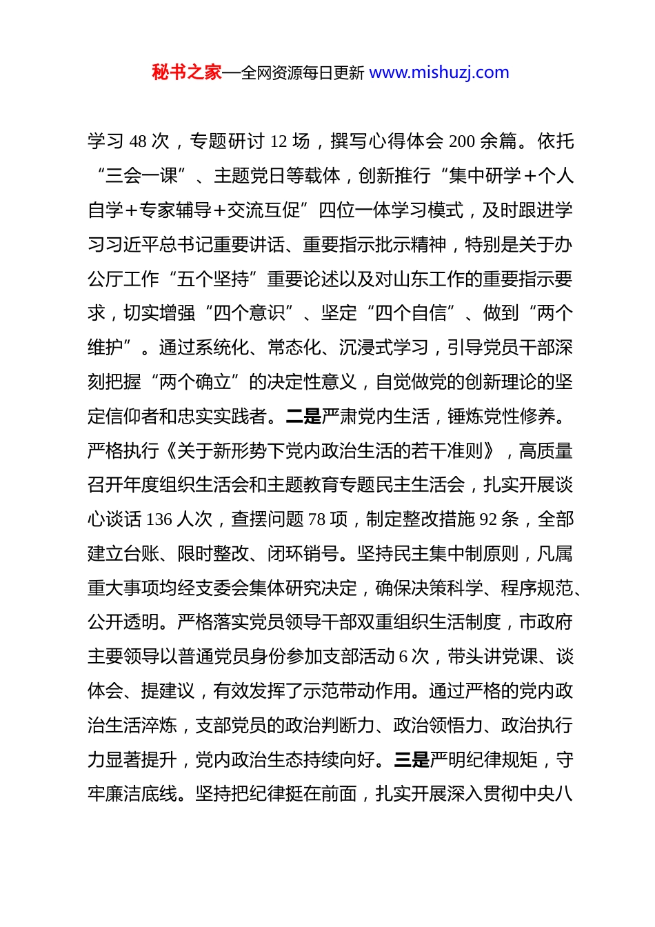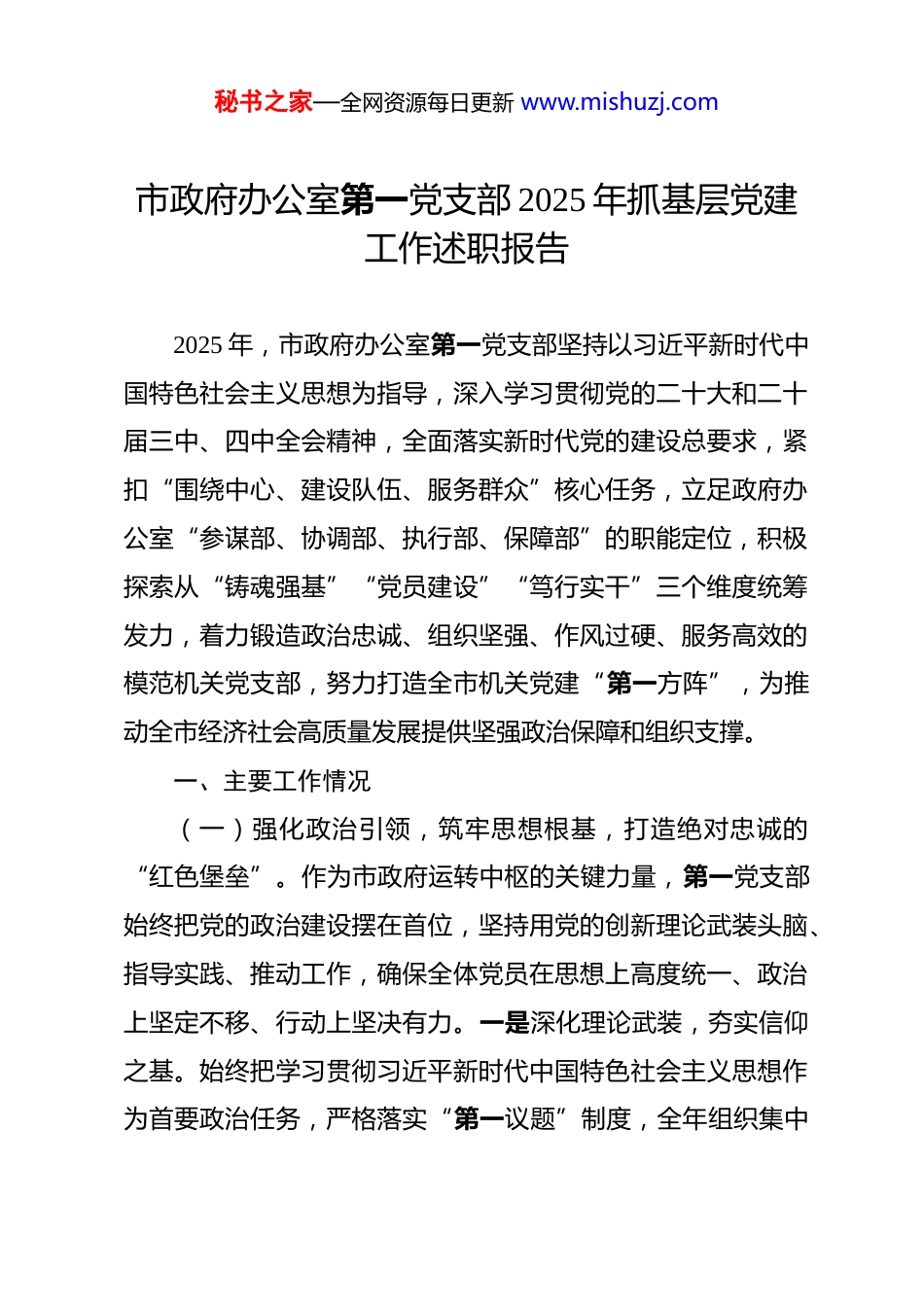 秘书之家—全网资源每日更新 www.mishuzj.com市政府办公室第一党支部 2025 年抓基层党建工作述职报告 2025 年,市政府办公室第一党支部坚持以习近平新时代中国特色社会主义思想为指导,深入学习贯彻党的二十大和二十届三中、四中全会精神,全面落实新时代党的建设总要求,紧扣“围绕中心、建设队伍、服务群众”核心任务,立足政府办公室“参谋部、协调部、执行部、保障部”的职能定位,积极探索从“铸魂强基”“党员建设”“笃行实干”三个维度统筹发力,着力锻造政治忠诚、组织坚强、作风过硬、服务高效的模范机关党支部,努力打造全市机关党建“第一方阵”,为推动全市经济社会高质量发展提供坚强政治保障和组织支撑。一、主要工作情况(一)强化政治引领,筑牢思想根基,打造绝对忠诚的“红色堡垒”。作为市政府运转中枢的关键力量,第一党支部始终把党的政治建设摆在首位,坚持用党的创新理论武装头脑、指导实践、推动工作,确保全体党员在思想上高度统一、政治上坚定不移、行动上坚决有力。一是深化理论武装,夯实信仰之基。始终把学习贯彻习近平新时代中国特色社会主义思想作为首要政治任务,严格落实“第一议题”制度,全年组织集中秘书之家—全网资源每日更新 www.mishuzj.com学习 48 次,专题研讨 12 场,撰写心得体会 200 余篇。依托“三会一课”、主题党日等载体,创新推行“集中研学+个人自学+专家辅导+交流互促”四位一体学习模式,及时跟进学习习近平总书记重要讲话、重要指示批示精神,特别是关于办公厅工作“五个坚持”重要论述以及对山东工作的重要指示要求,切实增强“四个意识”、坚定“四个自信”、做到“两个维护”。通过系统化、常态化、沉浸式学习,引导党员干部深刻把握“两个确立”的决定性意义,自觉做党的创新理论的坚定信仰者和忠实实践者。二是严肃党内生活,锤炼党性修养。严格执行《关于新形势下党内政治生活的若干准则》,高质量召开年度组织生活会和主题教育专题民主生活会,扎实开展谈心谈话 136 人次,查摆问题 78 项,制定整改措施 92 条,全部建立台账、限时整改、闭环销号。坚持民主集中制原则,凡属重大事项均经支委会集体研究决定,确保决策科学、程序规范、公开透明。严格落实党员领导干部双重组织生活制度,市政府主要领导以普通党员身份参加支部活动 6 次,带头讲党课、谈体会、提建议,有效发挥了示范带动作用。通过严格的党内政治生活淬炼,支部党员的政治判断力、政治领悟力、政治执行力显著提升,党内政治生态持续向好。三是严明纪律规矩,守牢廉洁底线。坚持把纪律挺在前面,扎实开展深入贯彻中央八秘书之家—全网资源每日更新 www.mishuzj.com项规定精神学习教育,举办专题讲座 4 场,观看《警钟长鸣》《永远吹冲锋号》等警示教育片 6 部,开展保密安全培训 3 次,覆盖率达 100%。结合办公室岗位特点,重点加强对文电处理、机要通信、会议接待、公务用车等关键环节的风险排查和廉政提醒,签订廉洁自律承诺书 32 份。全年未发生一起违纪违法案件,真正做到了知敬畏、存戒惧、守底线,营造了风清气正的良好氛围。(二)聚焦组织建设,激发内生动力,锻造堪当重任的“先锋队伍”。支部是党的全部工作和战斗力的基础。我们牢牢把握“抓党建就是抓发展”的理念,坚持把党员队伍建设作为基础工程来抓,着力提升组织力、凝聚力和战斗力,打造一支政治坚定、业务精通、作风优良、能打硬仗的高素质专业化干部队伍。一是创新学习机制,提升能力素质。针对办公室干部知识结构多元、工作任务繁重的实际,探索实施“1234”学习提升工程。坚持一张清单明方向,年初制定全年学习计划清单,明确理论学习、政策解读、公文写作、应急处置等重点内容;探索两种方式促融合,“线上+线下”双轨并进,线上依托“学习强国”“灯塔—党建在线”“共产党员网”三大平台开展每日打卡、积分竞赛,线下通过读书分享会、案例分析会等形式深化理解;建设个平台强支撑,整合优质资源,构建理论秘书之家—全网资源每日更新 www.mishuzj.com学习、技能练兵、经验交流三位一体学习矩阵;创新类形式增实效,灵活运用个人自学、集体研...