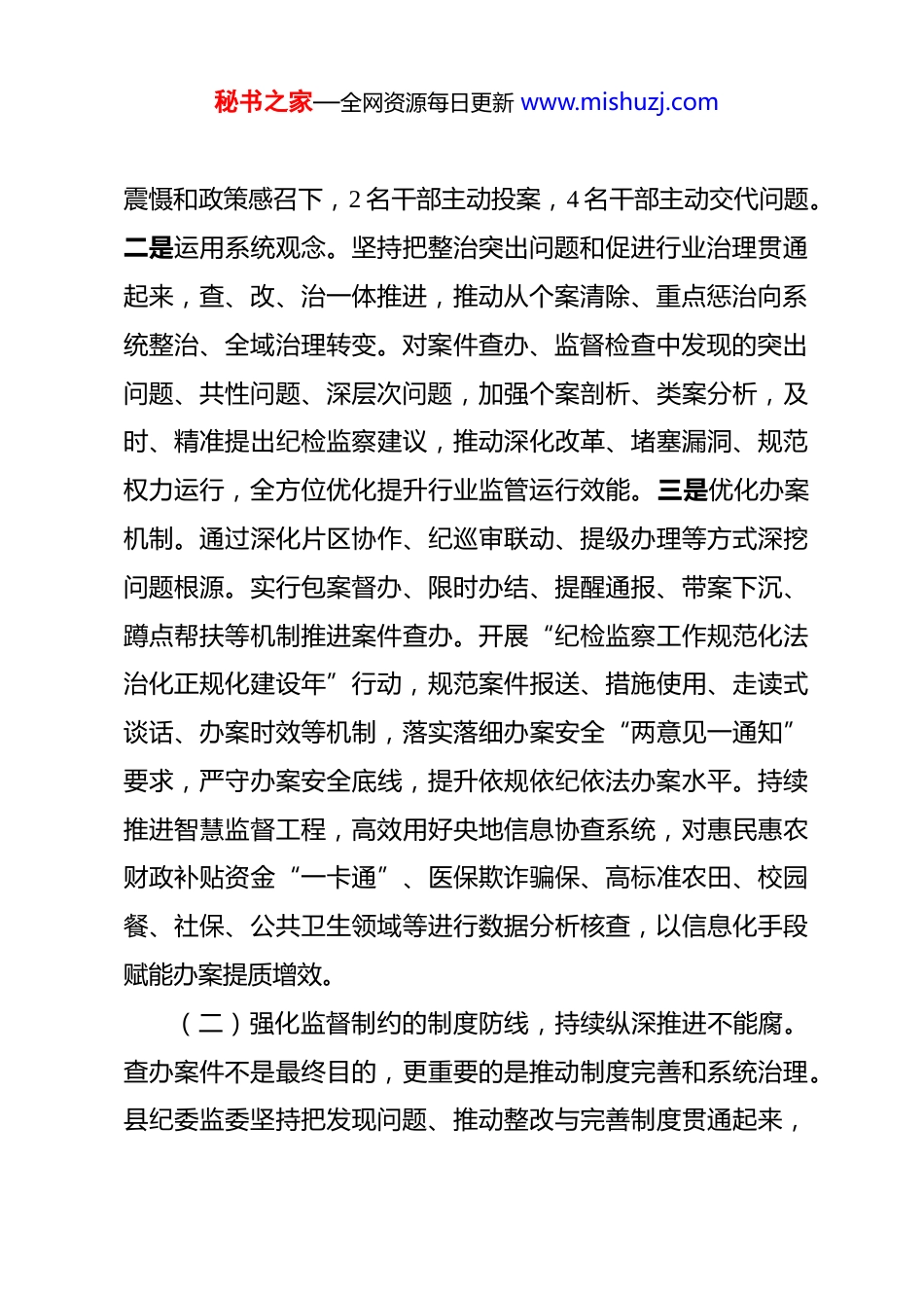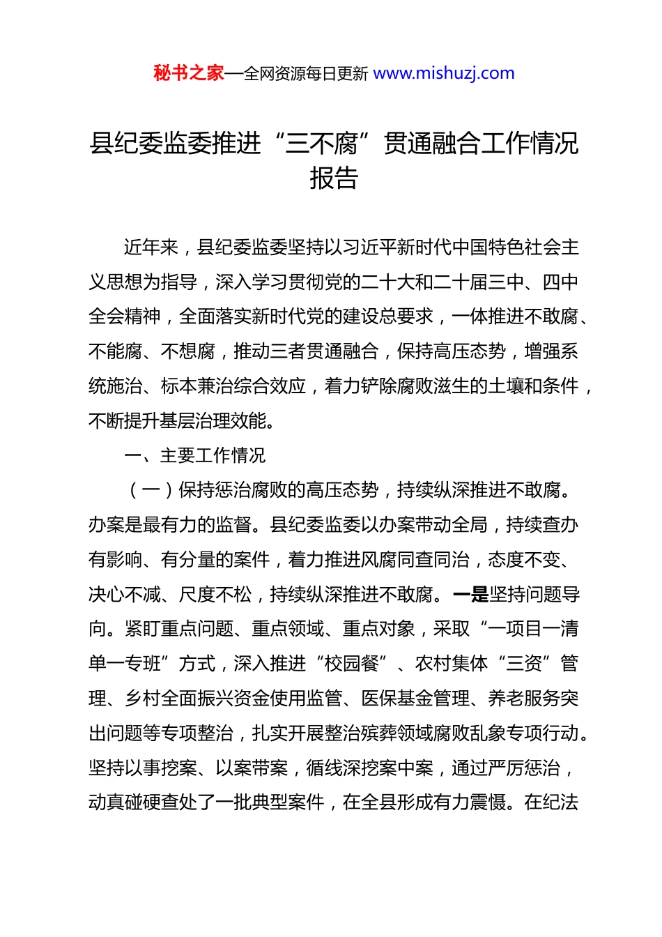 秘书之家—全网资源每日更新 www.mishuzj.com县纪委监委推进“三不腐”贯通融合工作情况报告 近年来,县纪委监委坚持以习近平新时代中国特色社会主义思想为指导,深入学习贯彻党的二十大和二十届三中、四中全会精神,全面落实新时代党的建设总要求,一体推进不敢腐、不能腐、不想腐,推动三者贯通融合,保持高压态势,增强系统施治、标本兼治综合效应,着力铲除腐败滋生的土壤和条件,不断提升基层治理效能。一、主要工作情况(一)保持惩治腐败的高压态势,持续纵深推进不敢腐。办案是最有力的监督。县纪委监委以办案带动全局,持续查办有影响、有分量的案件,着力推进风腐同查同治,态度不变、决心不减、尺度不松,持续纵深推进不敢腐。一是坚持问题导向。紧盯重点问题、重点领域、重点对象,采取“一项目一清单一专班”方式,深入推进“校园餐”、农村集体“三资”管理、乡村全面振兴资金使用监管、医保基金管理、养老服务突出问题等专项整治,扎实开展整治殡葬领域腐败乱象专项行动。坚持以事挖案、以案带案,循线深挖案中案,通过严厉惩治,动真碰硬查处了一批典型案件,在全县形成有力震慑。在纪法秘书之家—全网资源每日更新 www.mishuzj.com震慑和政策感召下,2 名干部主动投案,4 名干部主动交代问题。二是运用系统观念。坚持把整治突出问题和促进行业治理贯通起来,查、改、治一体推进,推动从个案清除、重点惩治向系统整治、全域治理转变。对案件查办、监督检查中发现的突出问题、共性问题、深层次问题,加强个案剖析、类案分析,及时、精准提出纪检监察建议,推动深化改革、堵塞漏洞、规范权力运行,全方位优化提升行业监管运行效能。三是优化办案机制。通过深化片区协作、纪巡审联动、提级办理等方式深挖问题根源。实行包案督办、限时办结、提醒通报、带案下沉、蹲点帮扶等机制推进案件查办。开展“纪检监察工作规范化法治化正规化建设年”行动,规范案件报送、措施使用、走读式谈话、办案时效等机制,落实落细办案安全“两意见一通知”要求,严守办案安全底线,提升依规依纪依法办案水平。持续推进智慧监督工程,高效用好央地信息协查系统,对惠民惠农财政补贴资金“一卡通”、医保欺诈骗保、高标准农田、校园餐、社保、公共卫生领域等进行数据分析核查,以信息化手段赋能办案提质增效。(二)强化监督制约的制度防线,持续纵深推进不能腐。查办案件不是最终目的,更重要的是推动制度完善和系统治理。县纪委监委坚持把发现问题、推动整改与完善制度贯通起来,秘书之家—全网资源每日更新 www.mishuzj.com加强重点领域监督机制改革和制度建设,不断推动形成完备的制度体系和严格有效的监督体系,持续纵深推进不能腐。一是压实管党治党政治责任。健全党委主体责任、“一把手”第一责任人责任、纪委监委监督专责、职能部门监管职责贯通落实的管党治党政治责任体系,推动落实案件查办后治理、监督、教育等责任,深入剖析行业管理制度机制问题,加强统筹部署推进,从源头上铲除群众身边不正之风和腐败问题。二是深化以案促改促治。针对查处典型案例,深入剖析腐败问题产生的根源,查找制度上的漏洞和工作中的薄弱环节,及时整改,并建立健全长效机制。出台《持续深化以案促改促治工作的实施办法》,把以案促改促治工作作为落实监督责任的重要载体,建立一案一整改机制,从制发纪检监察建议、宣读纪检监察建议,到监督评估纪检监察建议落实情况,切实把查办案件、加强教育、完善制度、促进治理贯通起来,持续做好查办案件“后半篇文章”。三是健全完善制度机制。聚焦省纪委监委第三批不能腐制度和监督机制改革任务开展监督检查,针对违规公款吃喝顽疾,推动严格落实国内公务接待统一公函制度。针对领导干部违规接收请托办事专项整治,加强对领导干部配偶、子女及其配偶违规经商办企业等情况的及时预警监督。针对医疗系统慢性病门诊不规范、乡镇卫生院超标准收费,教育系统秘书之家—全网资源每日更新 www.mishuzj.com挤占学生伙食费、农村集体水井承包管理不规范等突出问题下发纪检监察建议书,督促立行立改,建立健全制度和监督机制,促进治理常态长效。(三)筑牢...