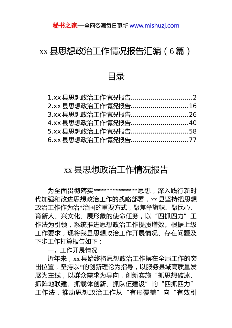 秘书之家—全网资源每日更新 www.mishuzj.comxx 县思想政治工作情况报告汇编(6 篇)目录1.xx 县思想政治工作情况报告...............................22.xx 县思想政治工作情况报告.............................163.xx 县思想政治工作情况报告.............................264.xx 县思想政治工作情况报告.............................405.xx 县思想政治工作情况报告.............................586.xx 县思想政治工作情况报告.............................77xx 县思想政治工作情况报告为全面贯彻落实**************思想,深入践行新时代加强和改进思想政治工作的战略部署,xx 县坚持把思想政治工作作为治*治国的重要方式,聚焦举旗帜、聚民心、育新人、兴文化、展形象的使命任务,以“四抓四力”工作法为引领,系统推进思想政治工作提质增效。根据上级工作要求,现将我县思想政治工作开展情况、存在问题及下步工作打算报告如下:一、工作开展情况近年来,xx 县始终将思想政治工作摆在全局工作的突出位置,坚持以*的创新理论为指导,以服务县域高质量发展为主线,以群众需求为导向,创新实施“抓思想破冰、抓阵地联建、抓载体创新、抓队伍建设”的“四抓四力”工作法,推动思想政治工作从“有形覆盖”向“有效引秘书之家—全网资源每日更新 www.mishuzj.com领”深度转变,有效凝聚了全县上下奋进新征程、建功新时代的强大精神力量。(一)抓思想破冰,全面提升思政工作“引领力”思想是行动的先导。我县坚持把理论武装作为思想政治工作的核心引擎,着力破除思想僵化、路径依赖等桎梏推动*的创新理论“飞入寻常百姓家”。一是构建“菜单式”学习体系,强化理论武装深度。紧扣学习贯彻**************思想主线,创新推出“理论研讨+”模式,精准搭建分众化、互动化学习平台。2024 年县委理论学习中心组开展集体学习 13 次、专题读书班 1 次,围绕“中国式现代化”“新质生产力”等重大主题组织理论研讨 14 次,形成高质量研讨发言材料 357 篇。针对不同群体需求,推行“点单式”学习服务:为领导干部定制“政治能力提升课”,为基层*员开设“乡村振兴实践课”,为青年群体打造“青春建功微课堂”,确保理论学习精准滴灌、入脑入心。通过“关键少数”示范引领,带动全县*员干部筑牢信仰之基、补足精神之钙。二是打造全媒体传播矩阵,拓展理论覆盖广度。深度整合“声、屏、网、微、端”资源,构建“1+n”融媒体传播体系。依托“箐山融媒”县级平台,开设“理论云课堂”“聚焦两会”“箐山讲坛”等专题专栏,全年推送中央及省市县委决策部署、学习资料和动态资讯 212 期,阅读量超 15 万次。创新“互联网+宣讲”模式,以*的二十届三中全会精神、生态文明建设等为主题,开展集中宣讲 73 场、网络直播宣讲 31 场,线上线下覆盖干部群众 7200 余人次。特别在“箐山融媒”app 嵌入“理论随身听”功能,将政策解读转化为 3 分钟音频微课,方便群众利用碎片化时间学习,有效破解了基层理论传播“最后一公里”难题。三是培育特色宣讲品牌,增强理论阐释温度。构建“1+x”宣讲品牌矩阵,县委书记领衔组建县委宣讲团,开展*的二十届三中全会精神专题报告会 3 场,以“小切口”秘书之家—全网资源每日更新 www.mishuzj.com讲透“大道理”。同步激活群众性宣讲力量,打造“五老”银发宣讲团、“红领巾”少年宣讲队、“文明实践”先锋队等特色小分队 12 支,深入机关、企业、社区、农村、学校开展“炕头宣讲”“田间课堂”46 场次。如在带岭镇开展的“抗联故事会”,老*员用亲身经历讲述革命历史,让群众在泪光中感悟信仰力量;在实验小学组织的“红领巾说两会”,孩子们用童言童语解读国家政策,使理论宣传更具亲和力。全年宣讲受众超千人次,真正实现“理论宣讲”化为“思想旋桨”,推动*的声音“沉下去”、群众心声“浮上来”。(二)抓阵地联建,系统重塑思政工作“吸引力”阵地是思想政治工作的基础依托。我县坚持“小阵地大舞台”理念,通过资源整合、功能升级、品牌打造,将分散的文化场所转化为凝聚群众、服务群众的“精神家园”。一是盘活公...