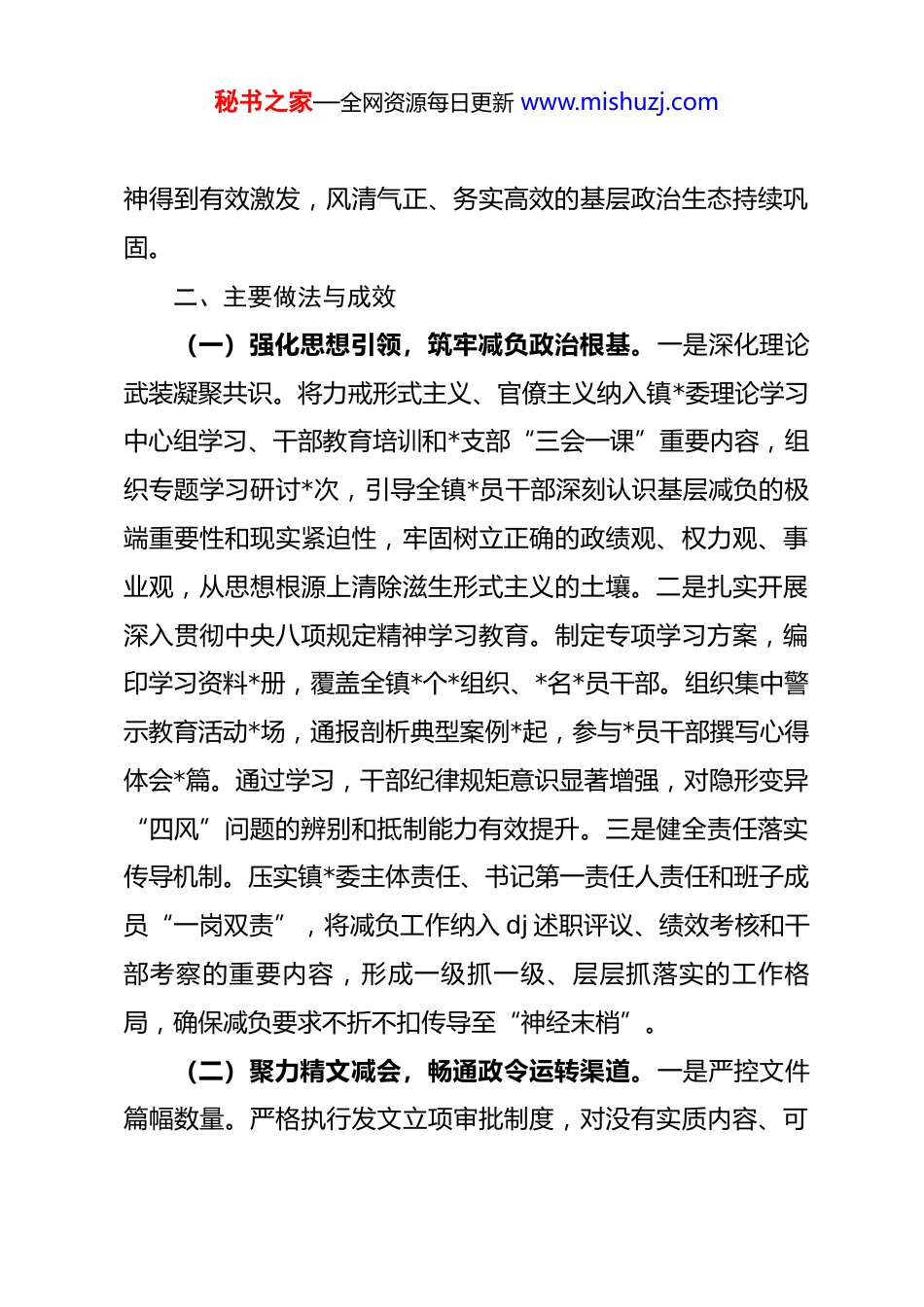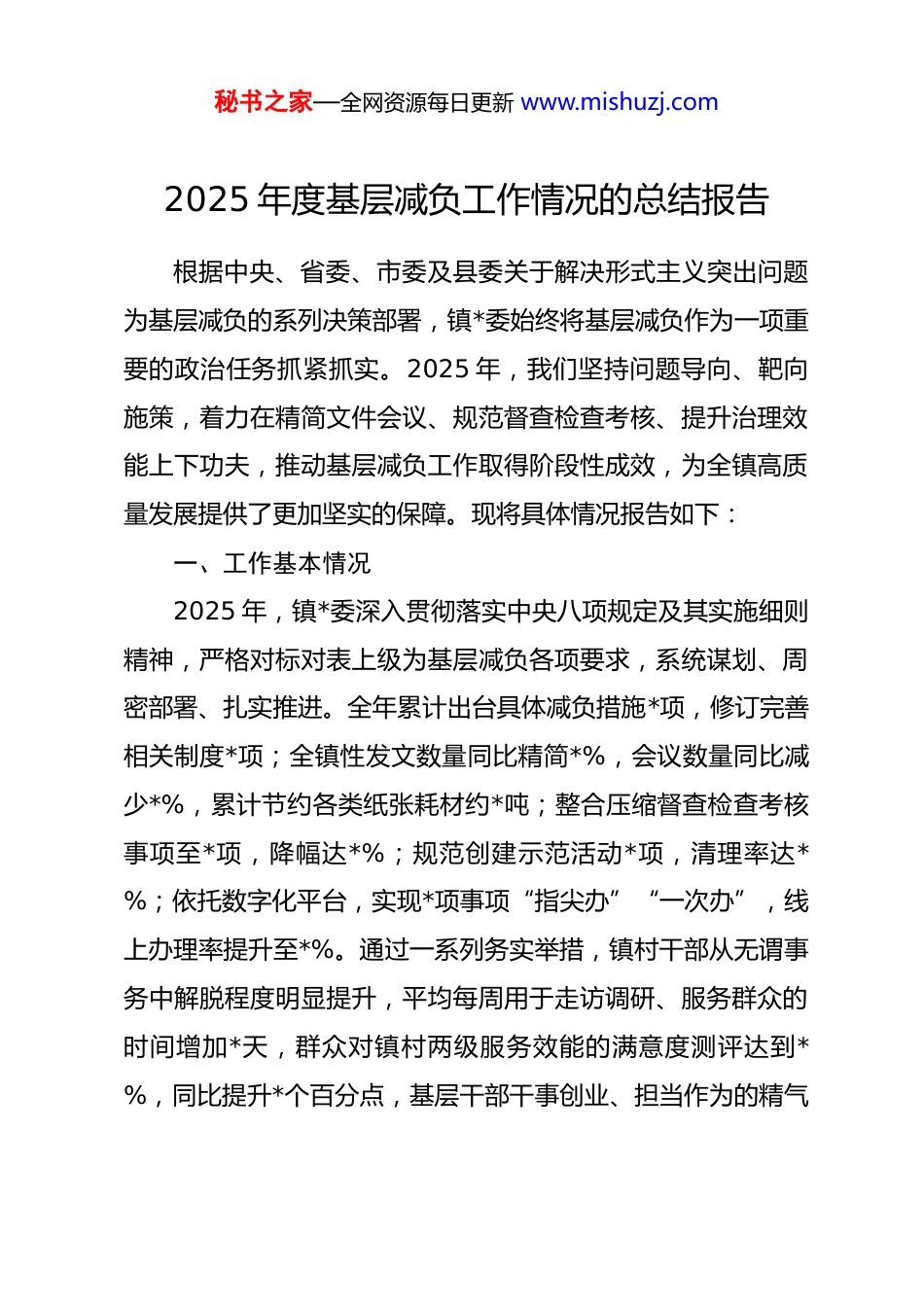 秘书之家—全网资源每日更新 www.mishuzj.com2025 年度基层减负工作情况的总结报告根据中央、省委、市委及县委关于解决形式主义突出问题为基层减负的系列决策部署,镇*委始终将基层减负作为一项重要的政治任务抓紧抓实。2025 年,我们坚持问题导向、靶向施策,着力在精简文件会议、规范督查检查考核、提升治理效能上下功夫,推动基层减负工作取得阶段性成效,为全镇高质量发展提供了更加坚实的保障。现将具体情况报告如下:一、工作基本情况2025 年,镇*委深入贯彻落实中央八项规定及其实施细则精神,严格对标对表上级为基层减负各项要求,系统谋划、周密部署、扎实推进。全年累计出台具体减负措施*项,修订完善相关制度*项;全镇性发文数量同比精简*%,会议数量同比减少*%,累计节约各类纸张耗材约*吨;整合压缩督查检查考核事项至*项,降幅达*%;规范创建示范活动*项,清理率达*%;依托数字化平台,实现*项事项“指尖办”“一次办”,线上办理率提升至*%。通过一系列务实举措,镇村干部从无谓事务中解脱程度明显提升,平均每周用于走访调研、服务群众的时间增加*天,群众对镇村两级服务效能的满意度测评达到*%,同比提升*个百分点,基层干部干事创业、担当作为的精气秘书之家—全网资源每日更新 www.mishuzj.com神得到有效激发,风清气正、务实高效的基层政治生态持续巩固。二、主要做法与成效(一)强化思想引领,筑牢减负政治根基。一是深化理论武装凝聚共识。将力戒形式主义、官僚主义纳入镇*委理论学习中心组学习、干部教育培训和*支部“三会一课”重要内容,组织专题学习研讨*次,引导全镇*员干部深刻认识基层减负的极端重要性和现实紧迫性,牢固树立正确的政绩观、权力观、事业观,从思想根源上清除滋生形式主义的土壤。二是扎实开展深入贯彻中央八项规定精神学习教育。制定专项学习方案,编印学习资料*册,覆盖全镇*个*组织、*名*员干部。组织集中警示教育活动*场,通报剖析典型案例*起,参与*员干部撰写心得体会*篇。通过学习,干部纪律规矩意识显著增强,对隐形变异“四风”问题的辨别和抵制能力有效提升。三是健全责任落实传导机制。压实镇*委主体责任、书记第一责任人责任和班子成员“一岗双责”,将减负工作纳入 dj 述职评议、绩效考核和干部考察的重要内容,形成一级抓一级、层层抓落实的工作格局,确保减负要求不折不扣传导至“神经末梢”。(二)聚力精文减会,畅通政令运转渠道。一是严控文件篇幅数量。严格执行发文立项审批制度,对没有实质内容、可秘书之家—全网资源每日更新 www.mishuzj.com发可不发的文件一律不发,对上级已公开发布的文件一般不再层层转发。倡导“短实新”文风,规定政策性文件、综合性报告原则上分别不超过*字和*字,简报动态类信息严格控制在*字以内。2025 年,镇*委、政府普发性文件同比减少*%。二是提升会议质量效能。实行会议计划管理和审批报备,能合并召开的坚决合并,能以视频形式召开的不集中开会。严格控制会议规模和时间,全镇性工作会议时间一般不超过*小时,专题会议不超过*小时。会前充分准备,确保议而有决、决而有行,会议实效性明显增强。三是优化信息报送流程。整合各类信息报送平台和渠道,明确报送范围、频次和格式要求,杜绝多头报送、重复报送、过度留痕。通过信息化手段实现数据一次采集、多方共享,切实减轻基层填表报数负担。(三)整治指尖形式,规范督查考核评比。一是系统清理规范移动互联网应用程序和工作群组。对全镇*个政务 app、公众号、工作群进行摸底排查,整合功能重复、使用率低的 app*个,解散、合并临时性、非必要工作群*个,保留群组实行实名制、清单制管理,明确信息发布规范和纪律要求。二是科学统筹督查检查考核事项。年初制定年度督查检查考核计划,严格实行总量控制和事项准入制度,未经批准不得擅自开展。大力推行“四不两直”暗访、随机抽查、联合检查等方式,提高督秘书之家—全网资源每日更新 www.mishuzj.com查检查的精准性和实效性。2025 年,镇级对村(社区)督查检查频次同比下降*%。三是改进考核评价方式。突出实绩导向,优化考核指标设置,减少过程性、留痕性指标权...