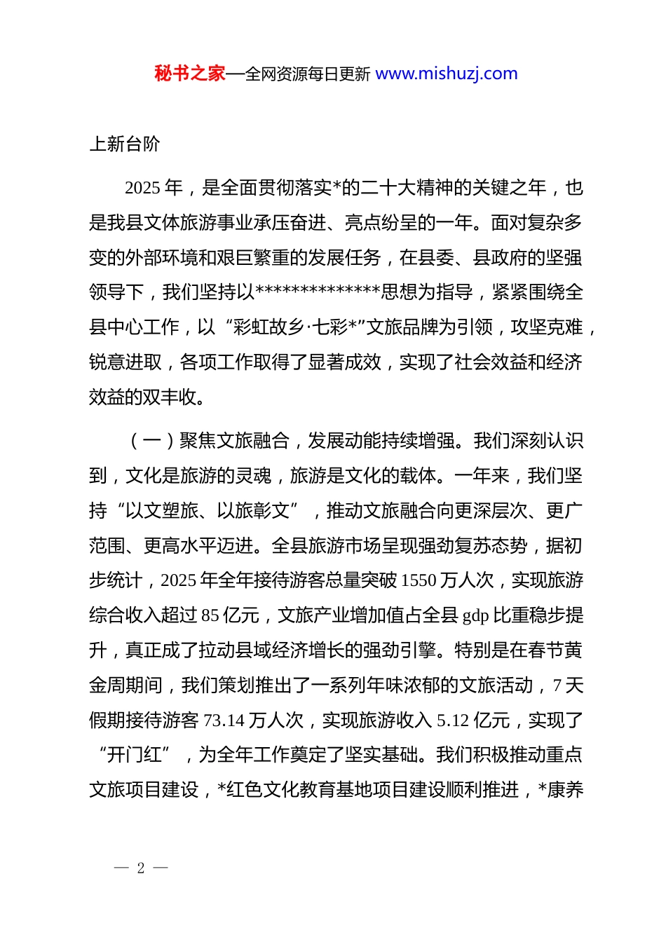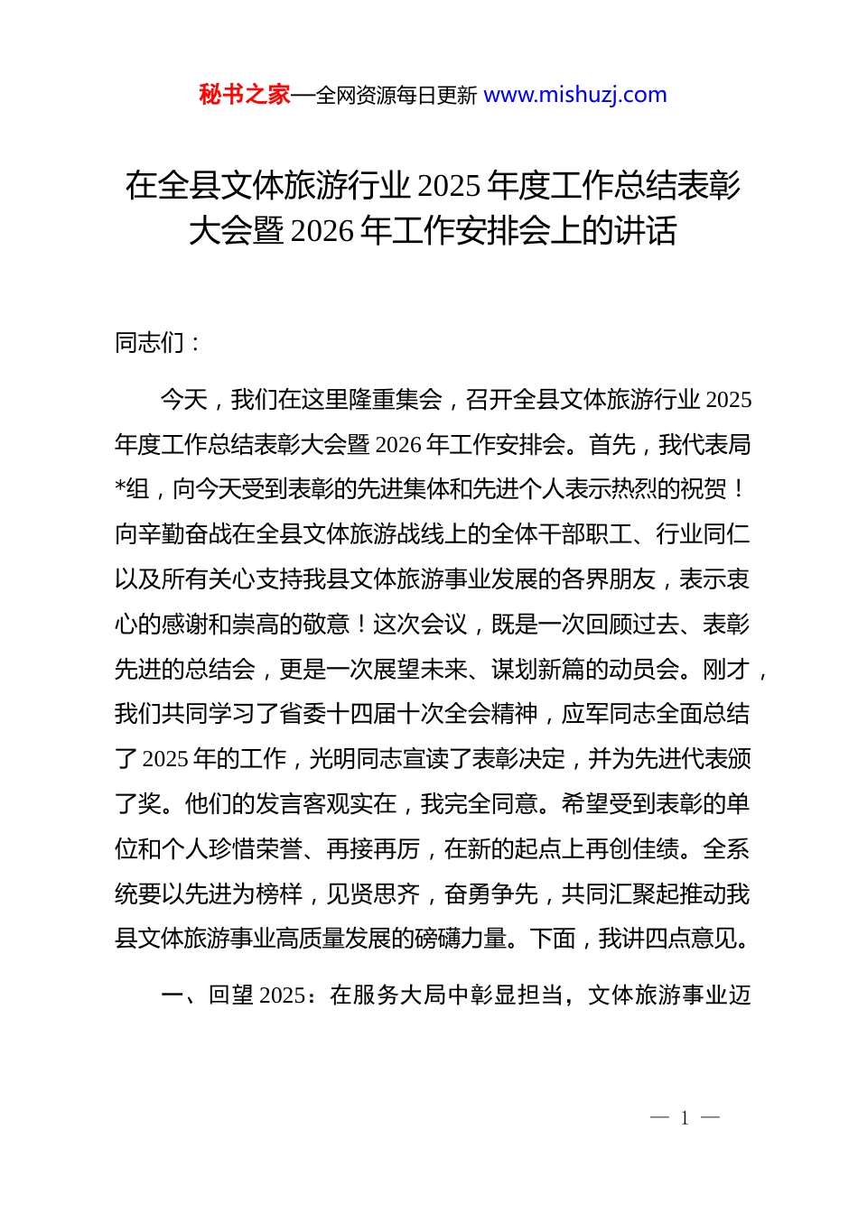 秘书之家—全网资源每日更新 www.mishuzj.com在全县文体旅游行业 2025 年度工作总结表彰大会暨 2026 年工作安排会上的讲话同志们:今天,我们在这里隆重集会,召开全县文体旅游行业 2025年度工作总结表彰大会暨 2026 年工作安排会。首先,我代表局*组,向今天受到表彰的先进集体和先进个人表示热烈的祝贺!向辛勤奋战在全县文体旅游战线上的全体干部职工、行业同仁以及所有关心支持我县文体旅游事业发展的各界朋友,表示衷心的感谢和崇高的敬意!这次会议,既是一次回顾过去、表彰先进的总结会,更是一次展望未来、谋划新篇的动员会。刚才,我们共同学习了省委十四届十次全会精神,应军同志全面总结了 2025 年的工作,光明同志宣读了表彰决定,并为先进代表颁了奖。他们的发言客观实在,我完全同意。希望受到表彰的单位和个人珍惜荣誉、再接再厉,在新的起点上再创佳绩。全系统要以先进为榜样,见贤思齐,奋勇争先,共同汇聚起推动我县文体旅游事业高质量发展的磅礴力量。下面,我讲四点意见。一、回望 2025:在服务大局中彰显担当,文体旅游事业迈— 1 —秘书之家—全网资源每日更新 www.mishuzj.com上新台阶2025 年,是全面贯彻落实*的二十大精神的关键之年,也是我县文体旅游事业承压奋进、亮点纷呈的一年。面对复杂多变的外部环境和艰巨繁重的发展任务,在县委、县政府的坚强领导下,我们坚持以**************思想为指导,紧紧围绕全县中心工作,以“彩虹故乡·七彩*”文旅品牌为引领,攻坚克难,锐意进取,各项工作取得了显著成效,实现了社会效益和经济效益的双丰收。(一)聚焦文旅融合,发展动能持续增强。我们深刻认识到,文化是旅游的灵魂,旅游是文化的载体。一年来,我们坚持“以文塑旅、以旅彰文”,推动文旅融合向更深层次、更广范围、更高水平迈进。全县旅游市场呈现强劲复苏态势,据初步统计,2025 年全年接待游客总量突破 1550 万人次,实现旅游综合收入超过 85 亿元,文旅产业增加值占全县 gdp 比重稳步提升,真正成了拉动县域经济增长的强劲引擎。特别是在春节黄金周期间,我们策划推出了一系列年味浓郁的文旅活动,7 天假期接待游客 73.14 万人次,实现旅游收入 5.12 亿元,实现了“开门红”,为全年工作奠定了坚实基础。我们积极推动重点文旅项目建设,*红色文化教育基地项目建设顺利推进,*康养— 2 —秘书之家—全网资源每日更新 www.mishuzj.com旅游度假区项目初具规模,擂鼓台景区游客服务中心、文笔山省级旅游度假区等一批重点项目得到实质性进展,为我县旅游发展注入了新的活力,有效优化了产品供给结构。(二)聚焦文化惠民,群众精神生活更加充实。我们始终坚持以人民为中心的发展思想,将满足人民群众对美好生活的向往作为工作的出发点和落脚点。公共文化服务体系建设日趋完善,“15 分钟公共文化服务圈”覆盖面进一步扩大。县图书馆、文化馆总分馆制建设深入推进,服务效能显著提升。我们成功举办了第十五届群众文化艺术节、全民健身运动会、“彩虹故乡”系列书画摄影展等百余场群众性文体活动,直接参与群众超过 10 万人次。我们创新开展“送文化下乡”活动,组织文艺演出、电影放映、图书流动服务深入乡村、社区、企业,将高质量的精神食粮送到群众家门口。非物质文化遗产的保护与传承工作取得新进展,成功举办了 2025 年“文化和自然遗产日”主题活动,乡村博物馆创建工作稳步推进,让优秀传统文化在新时代焕发出新的光彩。(三)聚焦品牌塑造,区域影响力显著提升。我们深知,品牌是吸引力,是竞争力。2025 年,我们持续擦亮“彩虹故乡·七彩*”这一金字招牌。通过整合宣传资源,我们构建了线上线— 3 —秘书之家—全网资源每日更新 www.mishuzj.com下、内宣外宣联动的立体化宣传矩阵。我们精心策划并参与了多个高级别的文化旅游推介会,制作的文旅宣传片在多家主流媒体平台播出,获得了广泛好评。*县的文化底蕴和旅游魅力通过新媒体平台得到了病毒式传播,多个话题登上热搜榜,吸引了全国各地的游客前来“打卡”。同时,我们注重提升旅游服务质量,深入开展旅游从业人员技能培训,规范旅游市场秩序,...