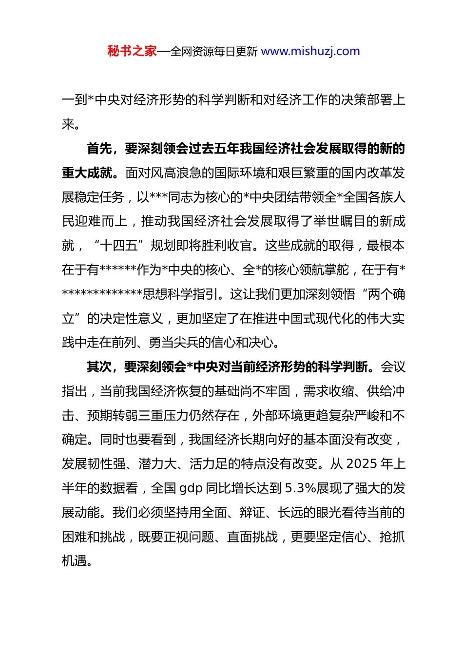 秘书之家—全网资源每日更新 www.mishuzj.com在市委传达学习 2025 年中央经济工作会议精神大会上的总结讲话同志们:今天我们召开这次会议,主要任务是深入学习领会刚刚闭幕的 2025 年中央经济工作会议精神,结合我市实际,研究部署贯彻落实工作,确保*中央的决策部署在*落地生根、开花结果。这次中央经济工作会议,是在全*全国深入学习贯彻*的二十届四中全会精神、即将开启“十五五”规划新征程的关键节点上,召开的一次至关重要的会议。******在会上的重要讲话,全面总结了 2025 年经济工作和“十四五”时期的重大成就,深刻剖析了当前国内外经济形势,系统部署了 2026 年经济工作的总体要求、主要目标和重点任务,为我们做好明年乃至今后一个时期的经济工作,确保“十五五”开好局、起好步,指明了前进方向,提供了根本遵循。下面,我结合自己的学习体会和对*市发展的思考,讲三点意见。一、深刻领会中央经济工作会议精神实质,精准把握新征程经济工作的方向路径***的重要讲话高屋建瓴、思想深邃,通篇贯穿着马克思主义的立场、观点和方法,是指导当前和今后一个时期我国经济发展的纲领性文献。我们必须学深悟透,切实把思想和行动统秘书之家—全网资源每日更新 www.mishuzj.com一到*中央对经济形势的科学判断和对经济工作的决策部署上来。首先,要深刻领会过去五年我国经济社会发展取得的新的重大成就。面对风高浪急的国际环境和艰巨繁重的国内改革发展稳定任务,以***同志为核心的*中央团结带领全*全国各族人民迎难而上,推动我国经济社会发展取得了举世瞩目的新成就,“十四五”规划即将胜利收官。这些成就的取得,最根本在于有******作为*中央的核心、全*的核心领航掌舵,在于有**************思想科学指引。这让我们更加深刻领悟“两个确立”的决定性意义,更加坚定了在推进中国式现代化的伟大实践中走在前列、勇当尖兵的信心和决心。其次,要深刻领会*中央对当前经济形势的科学判断。会议指出,当前我国经济恢复的基础尚不牢固,需求收缩、供给冲击、预期转弱三重压力仍然存在,外部环境更趋复杂严峻和不确定。同时也要看到,我国经济长期向好的基本面没有改变,发展韧性强、潜力大、活力足的特点没有改变。从 2025 年上半年的数据看,全国 gdp 同比增长达到 5.3%展现了强大的发展动能。我们必须坚持用全面、辩证、长远的眼光看待当前的困难和挑战,既要正视问题、直面挑战,更要坚定信心、抢抓机遇。秘书之家—全网资源每日更新 www.mishuzj.com再者,要深刻领会明年经济工作的总体要求和政策取向。会议明确了“稳中求进、提质增效”的工作总基调强调要强化宏观政策跨周期和逆周期调节,继续实施积极的财政政策和稳健的货币政策。财政政策要“更加积极有为”,通过提高赤字率、发行超长期特别国债等方式加大支持力度;货币政策要“适度宽松”,通过适时降准降息,保持流动性合理充裕,引导金融更好地服务实体经济。这些政策信号清晰有力,为我们稳定预期、提振信心、推动高质量发展提供了坚实的政策保障。二、紧密结合*实际贯彻中央部署,奋力开创高质量发展新局面作为国家改革开放的前沿阵地和经济中心城市,*市必须在贯彻落实中央经济工作会议精神上展现更高站位、拿出更实举措、追求更优成效。我们要紧紧围绕会议部署的重点任务,找准结合点和发力点,确保中央精神与*实践同频共振。第一,必须把扩大内需作为首要任务,着力增强经济增长内生动力。中央经济工作会议将扩大内需摆在突出位置,强调这是应对当前经济下行压力的关键一招。*市作为常住人口超千万、市场主体超 416 万的超大城市,内需潜力巨大。我们要把恢复和扩大消费摆在优先位置,全面落实市里制定的“提振消秘书之家—全网资源每日更新 www.mishuzj.com费专项行动”,围绕新能源汽车、智能家居、文旅体育等重点领域,加力扩围“以旧换新”等政策创新多元化消费场景,加快建设具有全球重要影响力的消费中心,确保完成全年社会消费品零售总额增长 6%的目标。同时,要持续扩大有效益的投资。坚持“投资于物”和“投资于人”紧密结合,一方面要围绕“两重”项目,加快重大基础设施和产业...