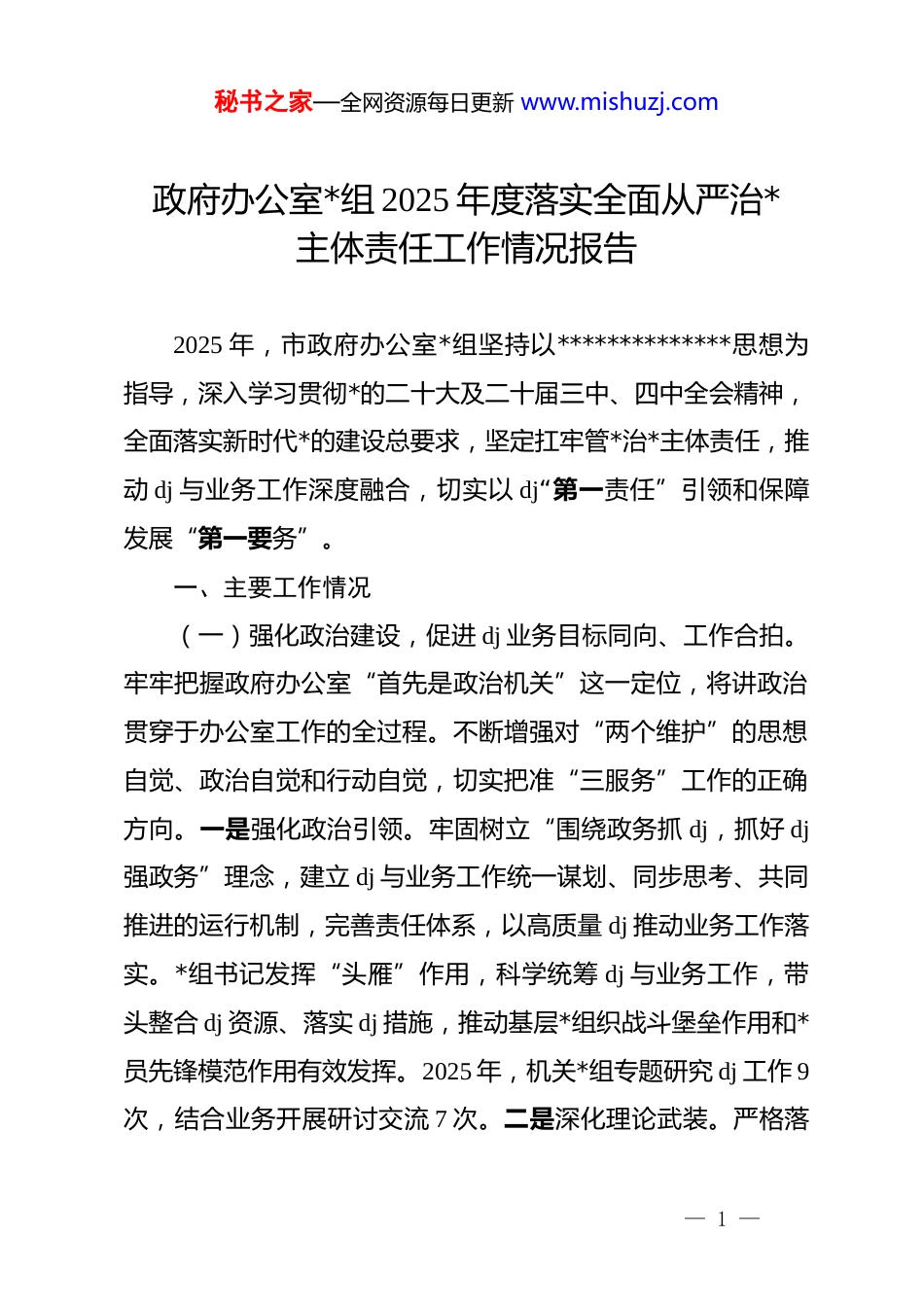 秘书之家—全网资源每日更新 www.mishuzj.com政府办公室*组 2025 年度落实全面从严治*主体责任工作情况报告2025 年,市政府办公室*组坚持以**************思想为指导,深入学习贯彻*的二十大及二十届三中、四中全会精神,全面落实新时代*的建设总要求,坚定扛牢管*治*主体责任,推动 dj 与业务工作深度融合,切实以 dj“第一责任”引领和保障发展“第一要务”。一、主要工作情况(一)强化政治建设,促进 dj 业务目标同向、工作合拍。牢牢把握政府办公室“首先是政治机关”这一定位,将讲政治贯穿于办公室工作的全过程。不断增强对“两个维护”的思想自觉、政治自觉和行动自觉,切实把准“三服务”工作的正确方向。一是强化政治引领。牢固树立“围绕政务抓 dj,抓好 dj强政务”理念,建立 dj 与业务工作统一谋划、同步思考、共同推进的运行机制,完善责任体系,以高质量 dj 推动业务工作落实。*组书记发挥“头雁”作用,科学统筹 dj 与业务工作,带头整合 dj 资源、落实 dj 措施,推动基层*组织战斗堡垒作用和*员先锋模范作用有效发挥。2025 年,机关*组专题研究 dj 工作 9次,结合业务开展研讨交流 7 次。二是深化理论武装。严格落— 1 —秘书之家—全网资源每日更新 www.mishuzj.com实“第一议题”制度,结合学习贯彻*的二十届四中全会精神,把“学思想”作为首要任务,与学习贯彻***关于办公厅(室)工作的重要讲话、****批示精神相结合。切实将工作与职责摆进去,真正学出政治站位、学出使命担当、学出方法路径,把“两个维护”体现到坚决贯彻*中央决策部署的行动上,体现到履职尽责、做好本职工作的实效中。2025 年,以理论学习中心组带动机关开展集中学习 13 次。三是建强基层组织。全面落实“三会一课”等制度,将业务工作融入“四强”*支部创建、清廉机关建设等机关 dj 重点任务。树立*务业务“双优”用人导向,强化 dj 述职评议结果运用,将其作为激励干部担当作为、促进事业发展的重要抓手。2025 年,机关各支部开展“三会一课”、主题*日等活动 400 余次;支部委员中 9 人得到提拔,14人实现职级晋升;机关一支部先后被评为市先进基层*组织、全市机关“四强”*支部。(二)用好活动平台,实现 dj 业务路径融合、互促共进。市政府办公室坚持不懈提升能力,持之以恒转变作风,将深入开展“支部联支部”、结对帮扶等活动作为有效载体,充分发挥基层*组织的战斗堡垒作用和*员的先锋模范作用,助力“三服务”工作提质增效。一是用好“周四大学堂”学习载体。建立“*组中心组领学、机关*委督学、*支部研学、*员自学”机— 2 —秘书之家—全网资源每日更新 www.mishuzj.com制,以支部为单位开展“周四大学堂”活动,充分利用“学习强国”、干部网络学院等平台,切实提升干部的能力与作风。聚焦办公室作风建设等各项工作任务,先后与市委办公室联合举办新时代大讲堂 7 期;开展演讲比赛、写作比赛等活动;组织参加省政府办公厅学习贯彻*的二十届四中全会精神轮训暨*务干部培训班。全力打造政治坚定、能力过硬的*员干部队伍,推动政府办各项工作效能大幅提升。二是用好“争先进位”活动载体。深入开展“三服务”大比武活动,推进各项工作创先争 优 。 2025 年 , 我 市 行 政 诉 讼 一 审 机 关 负 责 人 出 庭 率 达100%,位居省辖市首位;行政诉讼一审行政机关胜诉率同样位居省辖市第一。市政府办公室连续 4 年被省政府办公厅表彰为全省行政复议先进单位,行政复议应诉一科被司法部评为全国行政复议应诉工作表现突出集体。市 12345 政务服务热线运行服务质量位居全国第 12 名,继续保持全省首位,并获评“为民惠企服务引领典范”和“创新管理典范”两项殊荣。政务信息工作位居全省第二名,市政府网站综合得分居全省第 6 名。市政府总值班室先后七次受到省政府总值班室表扬,还作为省优秀代表在全国政府系统值班工作培训会上作交流发言。三是用好“支部联支部”实践载体。组建机关*员志愿服务队,在“支部联支部”等工作中当先锋、做表率,助力基层治理展现新成— 3 —秘书之家—全网资源每...