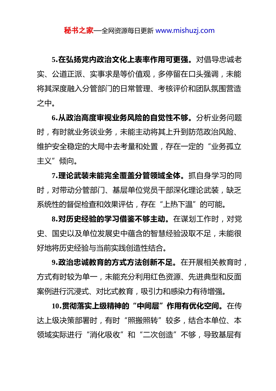 秘书之家—全网资源每日更新 www.mishuzj.com2025 年度民主生活会、组织生活会自我批评意见汇总(三个方面共 33 条 )一、理论学习方面1.理论学习的转化效率有待提升。虽然能坚持参加学习,但将学习成果转化为指导分管领域破解复杂矛盾的政策工具和有效方法上,见效较慢。例如,在运用“全过程人民民主”理念完善内部决策机制方面,尚未形成可操作的具体制度。2.政治敏锐性的场景化应用不足。能识别大是大非问题,但在具体业务工作中,对其中可能蕴含的政治意义、政治影响剖析不深。比如,在推进某项便民服务时,对其在巩固执政根基层面的价值挖掘和宣传不够主动。3.对新形势新领域新挑战研究不深。对网络意识形态、青年群体思想动态等新特点新趋势,缺乏前瞻性研究和针对性部署。分管领域的宣传工作有时未能完全摆脱传统模式,对新媒体传播规律的运用不够娴熟。4.理论学习存在“选择性”现象。对与自身分管业务直接相关的理论政策学习较多,对具有长远性、基础性意义的理论著作和宏观战略,缺乏系统性研读,导致理论视野有时不够开阔。秘书之家—全网资源每日更新 www.mishuzj.com5.在弘扬党内政治文化上表率作用可更强。对倡导忠诚老实、公道正派、实事求是等价值观,多停留在口头强调,未能将其深度融入分管部门的日常管理、考核评价和团队氛围营造之中。6.从政治高度审视业务风险的自觉性不够。分析业务问题时,有时就业务谈业务,未能主动将其上升到防范政治风险、维护安全稳定的大局中去考量和处置,存在一定的“业务孤立主义”倾向。7.理论武装未能完全覆盖分管领域全体。抓自身学习的同时,对带动分管部门、基层单位党员干部深化理论武装,缺乏系统性的督促检查和效果评估,存在“上热下温”的可能。8.对历史经验的学习借鉴不够主动。在谋划工作时,对党史、国史以及单位发展史中蕴含的智慧经验汲取不足,未能很好地将历史经验与当前实践创造性结合。9.政治忠诚教育的方式方法创新不足。在开展相关教育时,方式有时较为单一,未能充分利用红色资源、先进典型和反面案例进行沉浸式、对比式教育,吸引力和感染力有待增强。10.贯彻落实上级精神的“中间层”作用有优化空间。在传达上级决策部署时,有时“照搬照转”较多,结合本单位、本领域实际进行“消化吸收”和“二次创造”不够,导致基层有秘书之家—全网资源每日更新 www.mishuzj.com时感到指导性、针对性不强。11.对思想动态的定期分析研判制度落实不到位。对分管干部职工的思想状况,满足于一般性了解,缺乏定期、专题的深度分析研判,未能及时发现和疏导一些苗头性、倾向性问题。12.在坚定“四个自信”的宣传教育上着力不均衡。对道路、理论、制度自信宣传较多,但对文化自信,特别是如何结合单位实际弘扬优秀传统文化、革命文化和社会主义先进文化,思考和实践不足。13.理想信念有所弱化。在日常工作和生活中,没有时刻以党员的标准严格要求自己,缺乏对党性修养的持续锻炼。参加党内组织生活时,有时没有认真对待,没有充分利用组织生活的机会提升自己的党性修养。同时,在面对复杂多变的社会环境和各种利益诱惑时,没有坚定理想信念,导致理想信念有所弱化,在工作中缺乏应有的政治定力和担当精神。二、履职担当方面1.在推动数字化转型中担当作为不够。对分管工作数字化、智能化转型的必要性认识到位,但在面临数据壁垒、技术选型等实际困难时,亲自协调、强力推动的决心和韧劲稍显不足,进展与预期有差距。2.对新业态、新模式的监管与服务平衡点把握不准。面对秘书之家—全网资源每日更新 www.mishuzj.com分管领域出现的新情况,有时过于强调“规范”和“安全”,主动研究、创新包容审慎监管模式,为其发展提供引导服务的意识和举措相对滞后。3.“啃硬骨头”的后续资源保障跟进不足。在牵头攻坚一项难题初期投入大,但在问题深水区,需要持续投入政策、人力等资源时,有时后续保障力度减弱,导致攻坚效果未能完全巩固。4.在争取外部支持方面主动性有待加强。对于需要上级政策倾斜或外部合作资源的工作,有时习惯于等待上级安排或兄弟单位联系,主动“跑部前进”、搭建合作平台的意识和行动不够积极。5.对...