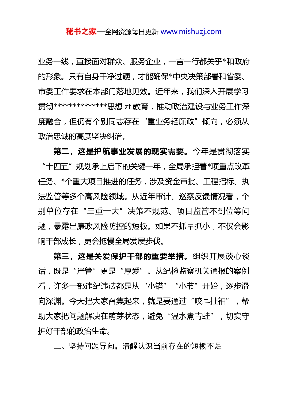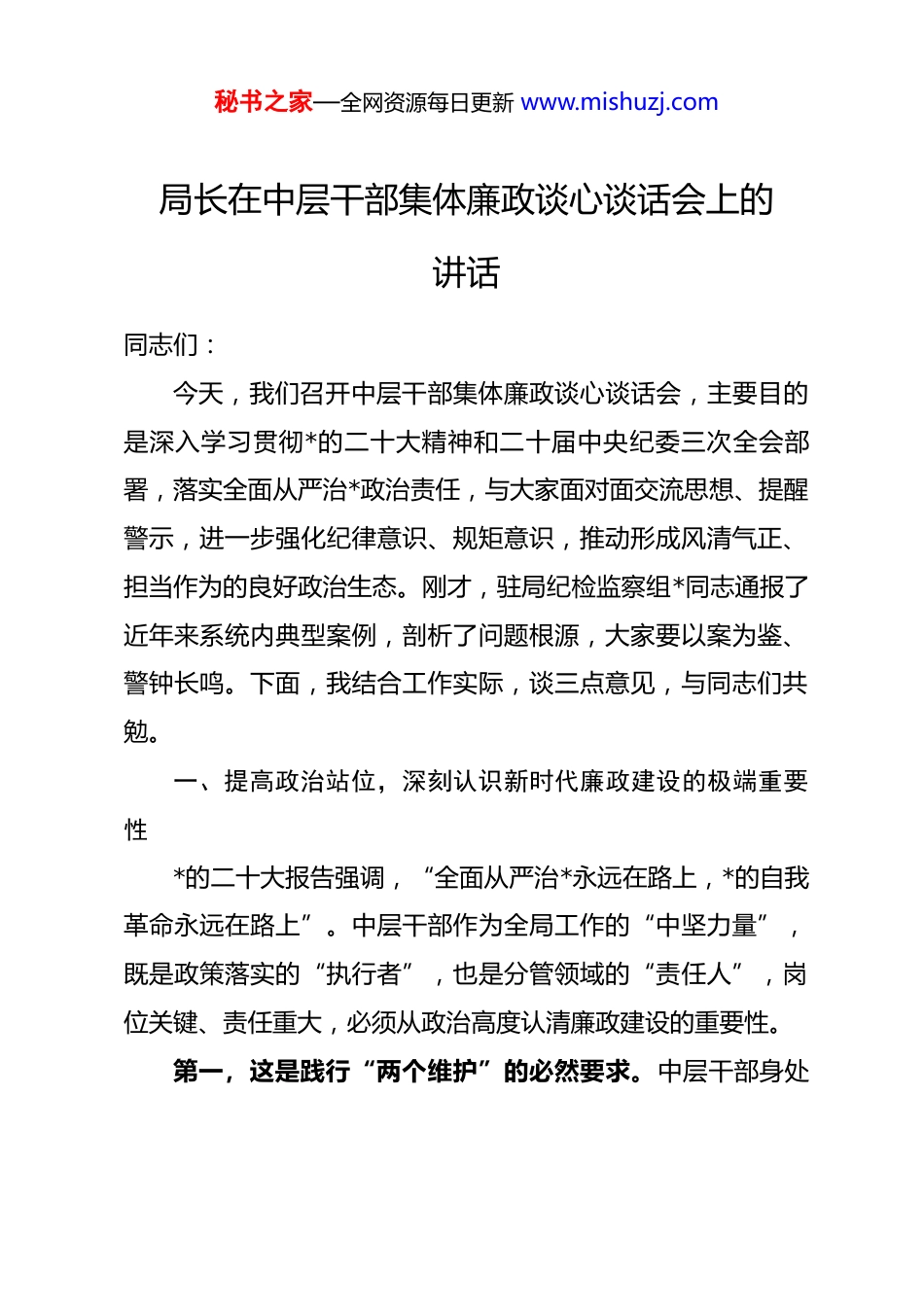 秘书之家—全网资源每日更新 www.mishuzj.com局长在中层干部集体廉政谈心谈话会上的讲话同志们:今天,我们召开中层干部集体廉政谈心谈话会,主要目的是深入学习贯彻*的二十大精神和二十届中央纪委三次全会部署,落实全面从严治*政治责任,与大家面对面交流思想、提醒警示,进一步强化纪律意识、规矩意识,推动形成风清气正、担当作为的良好政治生态。刚才,驻局纪检监察组*同志通报了近年来系统内典型案例,剖析了问题根源,大家要以案为鉴、警钟长鸣。下面,我结合工作实际,谈三点意见,与同志们共勉。一、提高政治站位,深刻认识新时代廉政建设的极端重要性*的二十大报告强调,“全面从严治*永远在路上,*的自我革命永远在路上”。中层干部作为全局工作的“中坚力量”,既是政策落实的“执行者”,也是分管领域的“责任人”,岗位关键、责任重大,必须从政治高度认清廉政建设的重要性。第一,这是践行“两个维护”的必然要求。中层干部身处秘书之家—全网资源每日更新 www.mishuzj.com业务一线,直接面对群众、服务企业,一言一行都关乎*和政府的形象。只有自身干净过硬,才能确保*中央决策部署和省委、市委工作要求在本部门落地见效。近年来,我们深入开展学习贯彻**************思想 zt 教育,推动政治建设与业务工作深度融合,但仍有个别同志存在“重业务轻廉政”倾向,必须从政治忠诚的高度坚决纠治。第二,这是护航事业发展的现实需要。今年是贯彻落实“十四五”规划承上启下的关键一年,全局承担着*项重点改革任务、*个重大项目推进的任务,涉及资金审批、工程招标、执法监管等多个高风险领域。从近年审计、巡察反馈情况看,个别单位存在“三重一大”决策不规范、项目监管不到位等问题,暴露出廉政风险防控的短板。如果不抓早抓小,不仅会影响干部成长,更会拖慢全局发展步伐。第三,这是关爱保护干部的重要举措。组织开展谈心谈话,既是“严管”更是“厚爱”。从纪检监察机关通报的案例看,许多干部违纪违法都是从“小错”“小节”开始,逐步滑向深渊。今天把大家召集起来,就是要通过“咬耳扯袖”,帮助大家把问题解决在萌芽状态,避免“温水煮青蛙”,切实守护好干部的政治生命。二、坚持问题导向,清醒认识当前存在的短板不足秘书之家—全网资源每日更新 www.mishuzj.com总体来看,全局中层干部队伍主流是好的,绝大多数同志能严守纪律规矩、积极履职尽责,为*事业发展作出了重要贡献。但对照上级要求和群众期待,仍存在一些不容忽视的问题,需要我们高度警醒。一是政治担当有差距。个别同志政治站位不高,对“国之大者”把握不准,落实上级决策部署存在“打折扣”“搞变通”现象。比如,在推进*专项整治中,有的单位以“客观困难”为由拖延进度,没有从“为民服务”的政治高度抓落实;有的对分管领域的苗头性问题“睁一只眼闭一只眼”,存在“老好人”思想,管*治*责任落实“上热中温下冷”。二是作风建设不扎实。形式主义、官僚主义问题仍有表现:有的同志“重留痕轻实效”,把“开会发文”当落实,对群众反映的*问题久拖不决;有的“重表态轻行动”,在优化营商环境中承诺的“一次性告知”“限时办结”没有真正落地;还有的“重享乐轻奋斗”,工作拈轻怕重,遇到急难险重任务推三阻四,与“闯创干”的要求差距较大。三是纪律执行不严格。个别同志纪律意识淡薄,存在“底线思维”缺失问题:有的对“八小时外”自我要求不严,与管理服务对象“亲清不分”,接受可能影响公正执行公务的宴请;有的在项目评审、资金分配中搞“人情照顾”,利用职务秘书之家—全网资源每日更新 www.mishuzj.com便利为亲友谋取利益;还有的对个人事项报告敷衍了事,漏报、瞒报房产、投资等情况,触碰了纪律红线。这些问题虽然发生在少数人身上,但影响恶劣、危害极大,必须引起我们的深刻反思。同志们要主动把自己摆进去、把职责摆进去、把工作摆进去,全面自查自纠,坚决整改到位。三、强化责任担当,以严的基调筑牢廉政防线中层干部是“关键少数”中的“关键”,必须以更高标准、更严要求约束自己,切实做到“四个带头”,为全局干部职工立标杆、作表率。(一)带头扛牢责任,种...