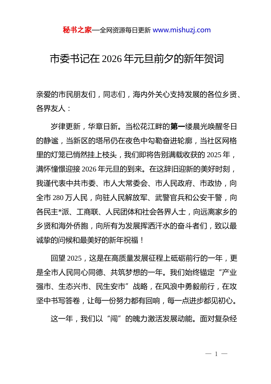 秘书之家—全网资源每日更新 www.mishuzj.com市委书记在 2026 年元旦前夕的新年贺词亲爱的市民朋友们,同志们,海内外关心支持发展的各位乡贤、各界友人:岁律更新,华章日新。当松花江畔的第一缕晨光唤醒冬日的静谧,当新区的塔吊仍在夜色中勾勒奋进轮廓,当社区网格里的灯笼已悄然挂上枝头,我们即将告别满载收获的 2025 年,满怀憧憬迎接 2026 年元旦的到来。在这辞旧迎新的美好时刻,我谨代表中共市委、市人大常委会、市人民政府、市政协,向全市 280 万人民,向驻人民解放军、武警官兵和公安干警,向各民主*派、工商联、人民团体和社会各界人士,向远离家乡的乡贤和海外侨胞,向所有为发展挥洒汗水的奋斗者们,致以最诚挚的问候和最美好的新年祝福!回望 2025,这是在高质量发展征程上砥砺前行的一年,更是全市人民同心同德、共筑梦想的一年。我们始终锚定“产业强市、生态兴市、民生安市”战略,在风浪中勇毅前行,在攻坚中书写答卷,让每一份努力都有回响,每一点进步都见初心。这一年,我们以“闯”的魄力激活发展动能。面对复杂经— 1 —秘书之家—全网资源每日更新 www.mishuzj.com济形势,我们坚决扛起稳增长政治责任,全年新增规上工业企业家,完成重点项目投资亿元,新能源汽车产业园、跨境电商综试区等一批标志性项目投产达效,地区生产总值同比增长%,城乡居民人均可支配收入分别增长%和%。在全省高质量发展考核中,我们再获“优秀”等次,用实打实的成绩证明:的发展底色更浓、韧性更强。这一年,我们以“实”的举措厚植民生福祉。我们始终把“群众满意”作为最高标准,新建改扩建学校所、医院所,改造老旧小区个、农村危房户,城乡公交一体化服务水平持续提升。在乡村振兴一线,我们培育“一村一品”特色产业村个,让农民在家门口就能就业增收;在城市社区,我们深化“dj+网格”治理,解决群众急难愁盼问题余件,群众满意度提升至%。当看到敬老院老人用上新的取暖设备,当听到新建学校里孩子们的朗朗书声,我们深知:民生无小事,枝叶总关情。这一年,我们以“美”的追求绘就生态画卷。我们坚决践行“绿水青山就是金山银山”理念,完成河生态修复二期工程,新增城市绿地万平方米,空气质量优良天数比例达%。从春季的万亩桃林花海,到夏季的湿地观鸟盛景,再到冬季的冰雪旅游热潮,的天更蓝、水更清、景更美,成功蝉联“国家生态文— 2 —秘书之家—全网资源每日更新 www.mishuzj.com明建设示范市”,“生态”成为最亮丽的名片。这一年,我们以“聚”的合力共筑平安防线。在防汛抗旱的战场,*员干部冲锋在前,守护了人民群众生命财产安全;在应急保障的一线,医护人员、社区工作者、志愿者并肩作战,筑牢了坚实屏障;在基层治理的前沿,政法干警、网格员默默坚守,让“平安”成为最坚实的保障。特别是在全市上下开展的“我为群众办实事”常态化实践活动中,涌现出一大批先进典型,他们用平凡的坚守书写了不平凡的感动,让团结奋斗的精神更加熠熠生辉。成绩的取得,凝结着全市人民的智慧和汗水,也离不开社会各界的关心和支持。在此,我要向每一位奋斗的人致敬:致敬扎根车间的产业工人,你们用双手锻造了制造的品质;致敬耕耘田野的农民朋友,你们用汗水浇灌了丰收的希望;致敬三尺讲台的人民教师,你们用爱心培育了祖国的未来;致敬救死扶伤的医护人员,你们用坚守守护了生命的尊严;更要致敬每一位默默奉献的普通市民,是你们的理解、支持和参与,让的发展充满底气、充满温情。展望 2026,这是全面贯彻落实*的 xx 大精神的深化之年,也是实现“十四五”规划收官的决胜之年。站在新的历史起点,— 3 —秘书之家—全网资源每日更新 www.mishuzj.com我们将始终以**************思想为指导,牢牢把握高质量发展首要任务,重点抓好三方面工作:一是以产业升级为核心,主攻新能源、新材料、高端装备制造等战略性新兴产业,推动产业链供应链提质增效,让的发展更有后劲;二是以民生改善为根本,持续办好教育、医疗、养老等民生实事,推进城乡融合发展,让的人民更有幸福感;三是以基层治理为保障,深化dj 引领基层治理创新,建设更高水平...