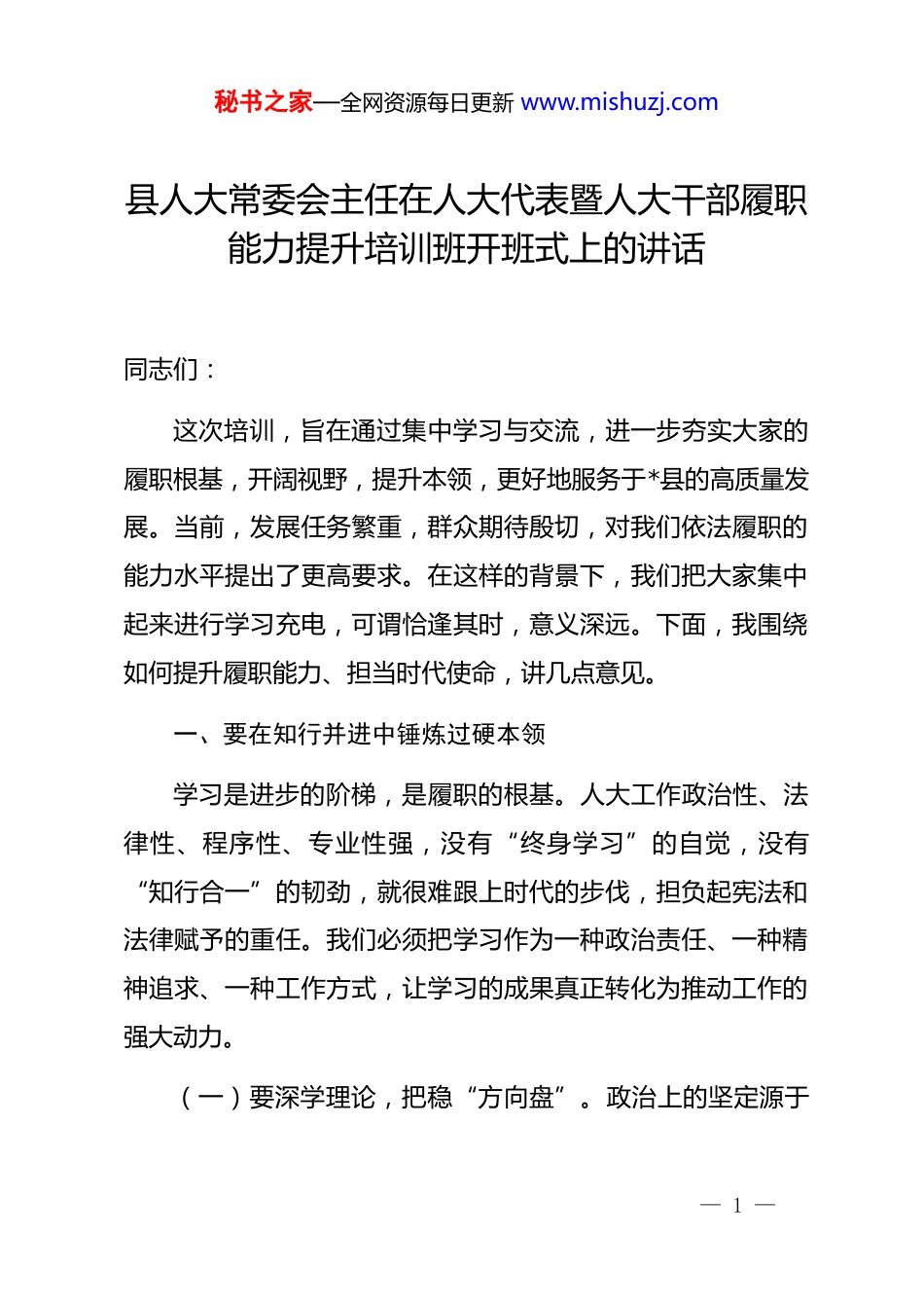 秘书之家—全网资源每日更新 www.mishuzj.com县人大常委会主任在人大代表暨人大干部履职能力提升培训班开班式上的讲话同志们:这次培训,旨在通过集中学习与交流,进一步夯实大家的履职根基,开阔视野,提升本领,更好地服务于*县的高质量发展。当前,发展任务繁重,群众期待殷切,对我们依法履职的能力水平提出了更高要求。在这样的背景下,我们把大家集中起来进行学习充电,可谓恰逢其时,意义深远。下面,我围绕如何提升履职能力、担当时代使命,讲几点意见。一、要在知行并进中锤炼过硬本领学习是进步的阶梯,是履职的根基。人大工作政治性、法律性、程序性、专业性强,没有“终身学习”的自觉,没有“知行合一”的韧劲,就很难跟上时代的步伐,担负起宪法和法律赋予的重任。我们必须把学习作为一种政治责任、一种精神追求、一种工作方式,让学习的成果真正转化为推动工作的强大动力。(一)要深学理论,把稳“方向盘”。政治上的坚定源于— 1 —秘书之家—全网资源每日更新 www.mishuzj.com理论上的清醒。要持续深入学习*的创新理论,特别是******关于坚持和完善人民代表大会制度的重要思想,深刻领会其核心要义、精神实质、丰富内涵和实践要求,从中汲取智慧和力量。要紧密联系*发展实际和人大工作实践,思考如何将*的路线方针政策,通过法定程序转化为全县人民的共同意志和自觉行动。学习理论不能空对空,要带着问题学、联系实际学,看看中央和省委、市委、县委的决策部署在*落地落实中存在哪些梗阻,群众有哪些急难愁盼,我们人大该如何精准发力、有效监督,确保执行不偏向、不走样。要把学习理论同总结经验、观照现实、推动工作结合起来,不断提高政治判断力、政治领悟力、政治执行力,始终做到与*委同心同向,与人民同频共振。(二)要精研法律,练就“金刚钻”。人大是立法和法律实施监督的重要机关,法治是履职的基本方式。要把学习宪法作为首要任务,深刻理解国家的根本制度、根本任务、公民的基本权利和义务,做宪法的忠实崇尚者、自觉遵守者、坚定捍卫者。要系统学习《地方组织法》、《代表法》、《选举法》、《监督法》等与人大工作密切相关的法律法规,熟悉人大的议事规则和工作程序,清楚代表的权利和义务,知道职权边界在哪里,履职流程是什么,做到心中有数、手中有方。比如,在— 2 —秘书之家—全网资源每日更新 www.mishuzj.com开展执法检查、工作评议时,只有自身对相关法律法规条款了然于胸,才能发现真问题、提出硬建议,避免“说外行话”、“监督浮于表面”。要善于运用法治思维和法治方式分析问题、提出建议、推动工作,确保每一项履职行为都于法有据、程序正当。(三)要博学新知,拓展“知识面”。新时代的人大工作,涉及经济社会发展的方方面面,如果知识储备不足、视野格局不宽,就很难提出具有前瞻性、建设性的意见建议。要主动学习经济、政治、文化、社会、生态文明以及现代科技、金融等方面的知识,不断完善知识结构,克服“本领恐慌”。本次培训安排了国际形势分析,就是帮助我们跳出*看*,立足全局谋一域,深刻理解内部发展与外部环境的关联互动。要关注兄弟县市乃至全国各地人大的创新实践和成功经验,如一些地方在民生实事项目代表票决制、预算联网监督、代表联络站提质增效等方面的好做法,取其精华,为我所用。学习要注重方法,勤于思考,善于总结,把零散的、感性的认识系统化、理性化,形成符合规律、切合实际的工作思路。(四)要实践砺能,注入“动力源”。学习的目的全在于运用。“纸上得来终觉浅,绝知此事要躬行。”培训所学能否— 3 —秘书之家—全网资源每日更新 www.mishuzj.com转化为实际成效,关键要看能否在履职实践中大胆运用、接受检验。要积极参与人大常委会组织的各项活动,无论是视察调研、执法检查,还是议案建议督办,都要全身心投入,在实践中学真知、悟真谛、长本领。要敢于到矛盾集中、群众意见多的地方去,倾听真实声音,掌握一手材料,在解决复杂问题中提升调查研究能力、群众工作能力、协商沟通能力。要珍视每一次审议发言、每一次提出建议的机会,会前做足功课,会中精准建言,会后跟踪问效,通过...