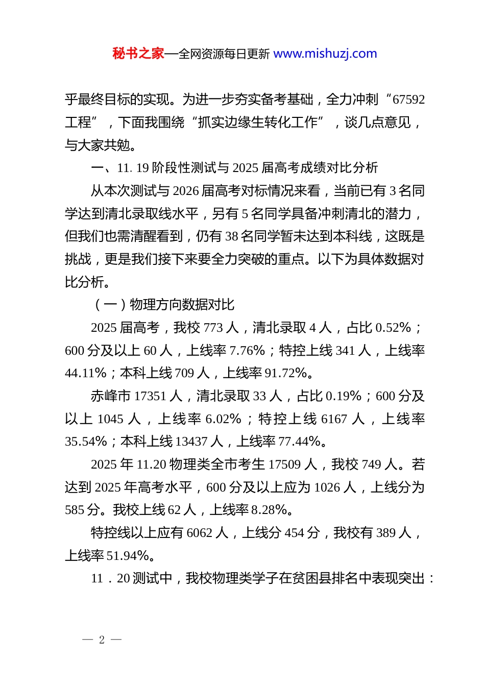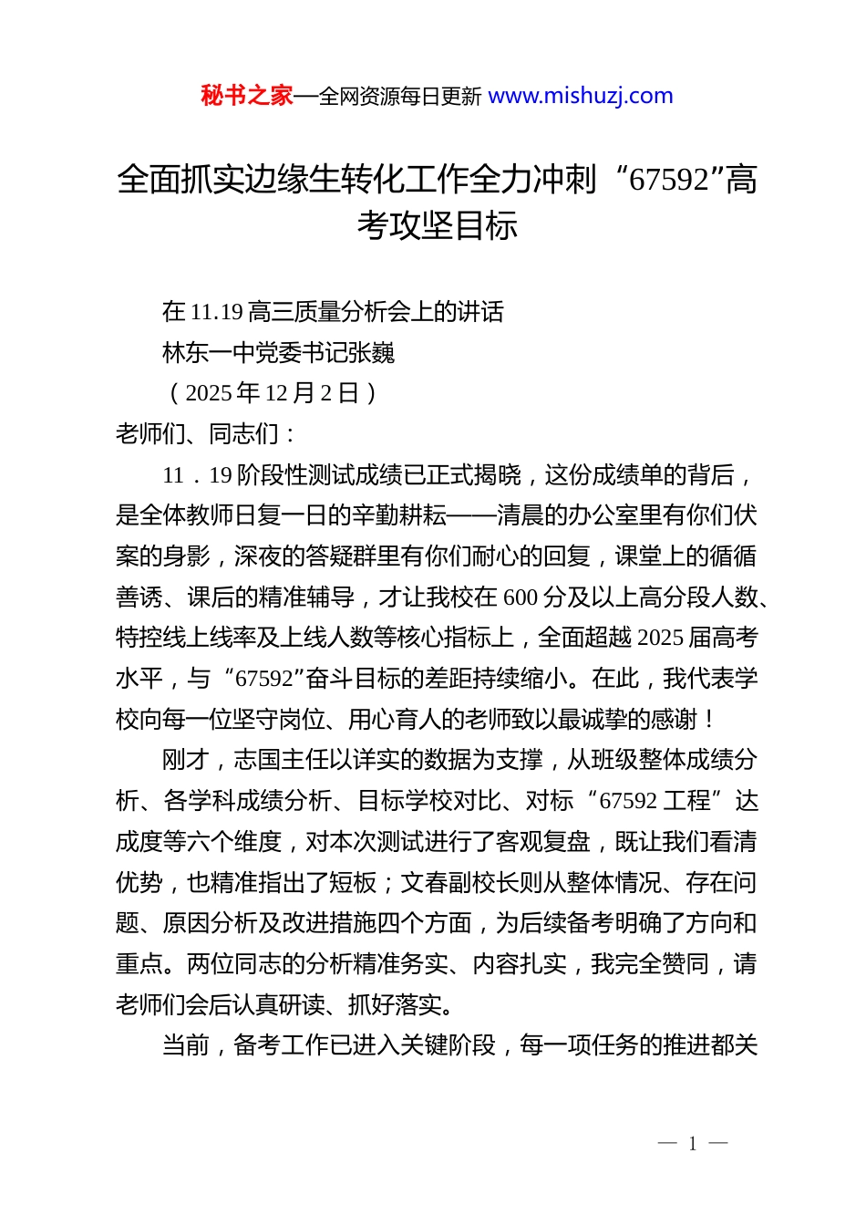 秘书之家—全网资源每日更新 www.mishuzj.com全面抓实边缘生转化工作全力冲刺“67592”高考攻坚目标在 11.19 高三质量分析会上的讲话林东一中党委书记张巍(2025 年 12 月 2 日)老师们、同志们:11.19 阶段性测试成绩已正式揭晓,这份成绩单的背后,是全体教师日复一日的辛勤耕耘——清晨的办公室里有你们伏案的身影,深夜的答疑群里有你们耐心的回复,课堂上的循循善诱、课后的精准辅导,才让我校在 600 分及以上高分段人数、特控线上线率及上线人数等核心指标上,全面超越 2025 届高考水平,与“67592”奋斗目标的差距持续缩小。在此,我代表学校向每一位坚守岗位、用心育人的老师致以最诚挚的感谢!刚才,志国主任以详实的数据为支撑,从班级整体成绩分析、各学科成绩分析、目标学校对比、对标“67592 工程”达成度等六个维度,对本次测试进行了客观复盘,既让我们看清优势,也精准指出了短板;文春副校长则从整体情况、存在问题、原因分析及改进措施四个方面,为后续备考明确了方向和重点。两位同志的分析精准务实、内容扎实,我完全赞同,请老师们会后认真研读、抓好落实。当前,备考工作已进入关键阶段,每一项任务的推进都关— 1 —秘书之家—全网资源每日更新 www.mishuzj.com乎最终目标的实现。为进一步夯实备考基础,全力冲刺“67592工程”,下面我围绕“抓实边缘生转化工作”,谈几点意见,与大家共勉。一、11.19 阶段性测试与 2025 届高考成绩对比分析从本次测试与 2026 届高考对标情况来看,当前已有 3 名同学达到清北录取线水平,另有 5 名同学具备冲刺清北的潜力,但我们也需清醒看到,仍有 38 名同学暂未达到本科线,这既是挑战,更是我们接下来要全力突破的重点。以下为具体数据对比分析。(一)物理方向数据对比2025 届高考,我校 773 人,清北录取 4 人,占比 0.52%;600 分及以上 60 人,上线率 7.76%;特控上线 341 人,上线率44.11%;本科上线 709 人,上线率 91.72%。赤峰市 17351 人,清北录取 33 人,占比 0.19%;600 分及以上 1045 人,上线率 6.02%;特控上线 6167 人,上线率35.54%;本科上线 13437 人,上线率 77.44%。2025 年 11.20 物理类全市考生 17509 人,我校 749 人。若达到 2025 年高考水平,600 分及以上应为 1026 人,上线分为585 分。我校上线 62 人,上线率 8.28%。特控线以上应有 6062 人,上线分 454 分,我校有 389 人,上线率 51.94%。11.20 测试中,我校物理类学子在贫困县排名中表现突出:— 2 —秘书之家—全网资源每日更新 www.mishuzj.com卢俊峰位列贫困县第 8 名(全市第 19 名)、张亚刚第 14 名(全市第 32 名)、郑琅康第 35 名(全市第 44 名),展现出强劲的竞争力。(二)历史方向数据对比2025 年高考我校 228 人,清北录取 2 人,占比 0.88%;600分 及 以 上 2 人 , 上 线 率 0.88% ; 特 控 上 线 62 人 , 上 线 率27.19%;本科上线 200 人,上线率 87.72%。赤峰市 4535 人,清北录取 6 人,占比 0.13%;600 分以上101 人,上线率 2.23%;特控上线 594 人,上线率 13.08%;本科上线 2488 人,上线率 54.86%。2025 年 11.20 历史类全市考生 4763 人,我校 172 人。若达到 2025 年高考水平,600 分及以上应为 104 人,上线分为 584.5分。我校上线 2 人,上线率 1.17%。特控线以上应有 611 人,上线分 504 分,我校有 64 人,上线率 37.21%。11.20 测试中,我校历史类学子在贫困县排名中成绩优异:许子一位列贫困县第 3 名(全市第 4 名)、隋佳第 24 名(全市第 67 名),为后续冲刺奠定坚实基础。二、明确边缘生界定标准,靶向冲刺“67592”目标为精准发力提升核心指标,结合本次测试成绩与高考目标差距,明确各层级边缘生界定范围,通过针对性培育助力目标达成。— 3 —秘书之家—全网资源每日更新 www.mishuzj.com(一)清北边缘生当前物理类 2 名、历史类 1 名同学已达清北录取要求。扩大培育范围,将物理类前 3-10...