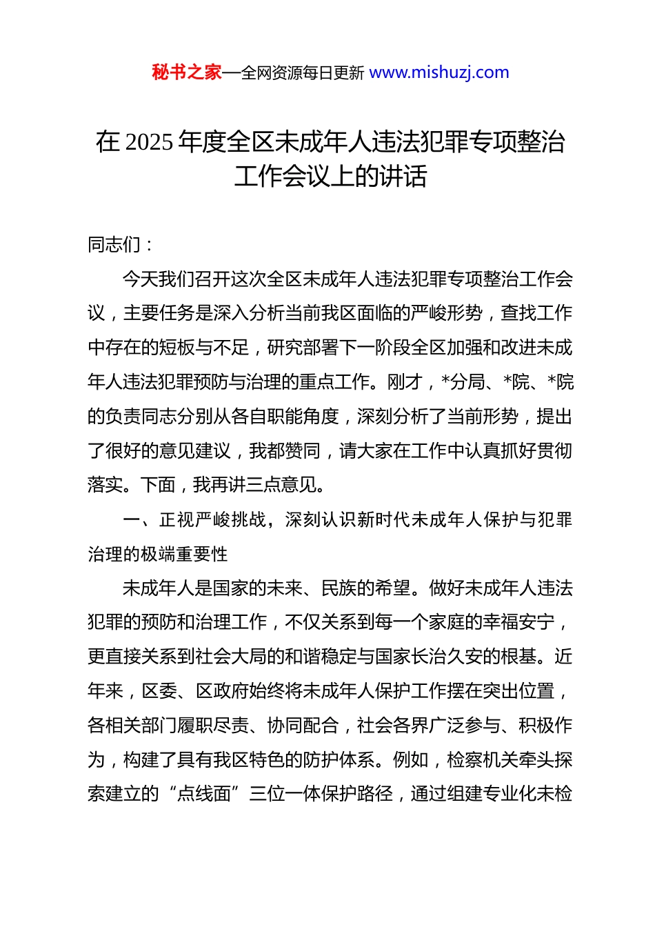 秘书之家—全网资源每日更新 www.mishuzj.com在 2025 年度全区未成年人违法犯罪专项整治工作会议上的讲话 同志们:今天我们召开这次全区未成年人违法犯罪专项整治工作会议,主要任务是深入分析当前我区面临的严峻形势,查找工作中存在的短板与不足,研究部署下一阶段全区加强和改进未成年人违法犯罪预防与治理的重点工作。刚才,*分局、*院、*院的负责同志分别从各自职能角度,深刻分析了当前形势,提出了很好的意见建议,我都赞同,请大家在工作中认真抓好贯彻落实。下面,我再讲三点意见。一、正视严峻挑战,深刻认识新时代未成年人保护与犯罪治理的极端重要性未成年人是国家的未来、民族的希望。做好未成年人违法犯罪的预防和治理工作,不仅关系到每一个家庭的幸福安宁,更直接关系到社会大局的和谐稳定与国家长治久安的根基。近年来,区委、区政府始终将未成年人保护工作摆在突出位置,各相关部门履职尽责、协同配合,社会各界广泛参与、积极作为,构建了具有我区特色的防护体系。例如,检察机关牵头探索建立的“点线面”三位一体保护路径,通过组建专业化未检秘书之家—全网资源每日更新 www.mishuzj.com办案队伍、打造“一站式”办案救助中心、联动多方力量搭建社会化救助平台等方式,在实践中取得了良好成效,为保护未成年人合法权益、预防和减少犯罪发挥了积极作用。在肯定成绩的同时,我们必须清醒地看到,当前我区未成年人违法犯罪工作依然面临着前所未有的严峻挑战和深刻变化。从近年来的情况看,未成年人违法犯罪呈现出一些新的阶段性特征。一是犯罪低龄化趋势日益明显。根据相关调研数据,未成年人犯罪的首次犯罪年龄正在前移,对已满十四周岁不满十六周岁未成年人实施的暴力犯罪案件值得高度警惕。这警示我们,预防工作的关口必须进一步前移。二是犯罪行为的团伙化与组织化特征凸显。部分案件中,未成年人受社会不良风气影响,拉帮结派,交叉结伙,流窜作案,犯罪行为的暴力性、破坏性、对抗性显著增强。三是新型网络犯罪成为新的增长点。随着互联网的深度普及,一些未成年人沉迷网络,受到不良信息侵蚀,甚至被引诱、被利用从事网络赌博、网络诈骗、信息贩卖等违法犯罪活动,其隐蔽性更强,社会危害更广,侦办难度更大。四是重点群体和重点领域的问题依然突出。部分流动儿童、留守儿童、困境家庭儿童因家庭监护缺失或不当,成为违法犯罪的高危群体。校园欺凌现象时有发生,严重影响了校园安全和学生身心健康。这些新情况、新问题相互交织,对我秘书之家—全网资源每日更新 www.mishuzj.com们的治理能力和治理体系提出了更高要求。面对这些复杂严峻的形势,全区各级各部门单位的同志们必须从政治和全局的高度,深刻认识到做好这项工作的极端重要性和现实紧迫性。这绝不仅仅是政法机关一家的事,而是全社会共同的责任。任何麻痹思想、松懈情绪和侥幸心理,都可能导致我们在工作中错失良机,造成无法挽回的损失。我们必须以“时时放心不下”的责任感,将思想和行动统一到中央、省委、市委的决策部署上来,将智慧和力量凝聚到专项整治的各项任务上来,以坚定的决心、超常的力度、务实的举措,坚决遏制住未成年人违法犯罪高发频发的势头,为全区经济社会高质量发展营造安全稳定的社会环境。二、坚持系统观念,构建权责清晰协同高效的综合治理体系预防和治理未成年人违法犯罪是一项复杂的系统工程,必须坚持系统观念、法治思维和强基导向,统筹推进、综合施策。单靠某一个部门的“单打独斗”或是运动式的“一阵风”整治,无法从根本上解决问题。必须构建一个党委领导、政府负责、部门联动、家庭尽责、社会参与的现代化综合治理体系。一要强化法治引领,织密制度保障之网。法治是最好的营商环境,也是最好的成长环境。国家层面有《中华人民共和国秘书之家—全网资源每日更新 www.mishuzj.com未成年人保护法》和《中华人民共和国预防未成年人犯罪法》作为根本遵循,这两部法律经过修订,已经构建了从未成年人权益保护到不良行为干预、再到严重不良行为矫治和犯罪预防的完整法律链条。特别值得关注的是,即将于 2026 年 1 月 1 日正式施行的《山东省预防未成年...