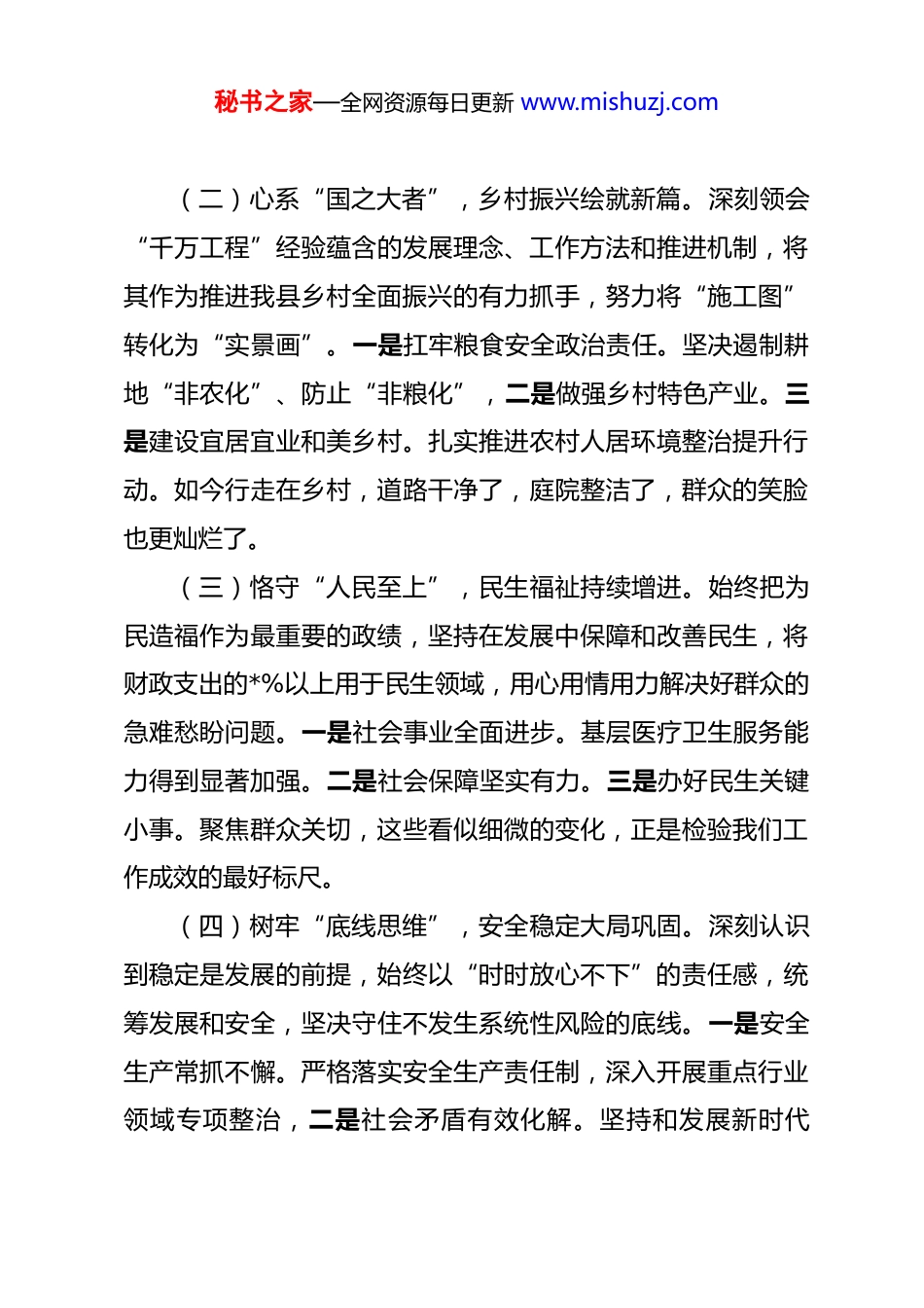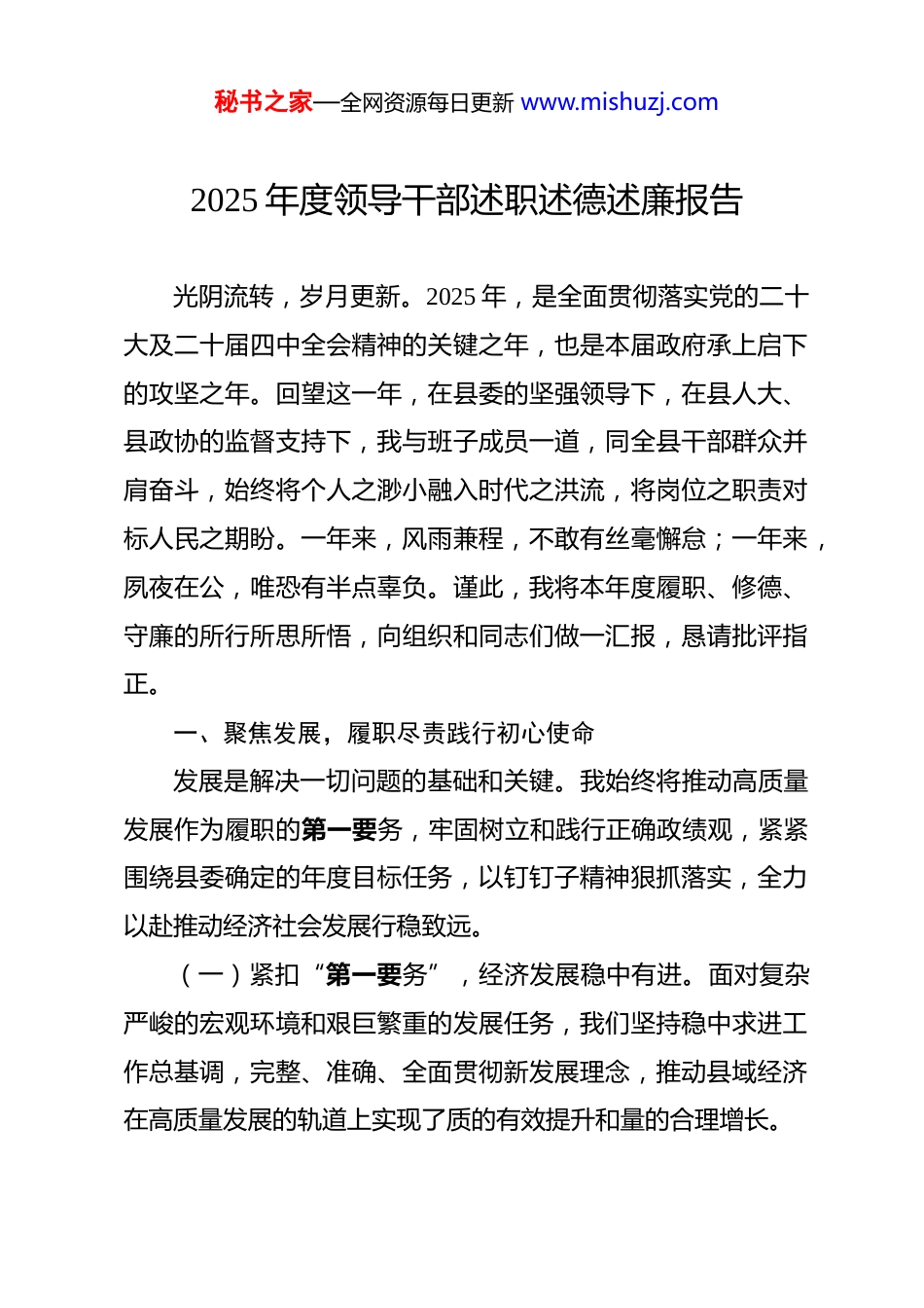 秘书之家—全网资源每日更新 www.mishuzj.com2025 年度领导干部述职述德述廉报告 光阴流转,岁月更新。2025 年,是全面贯彻落实党的二十大及二十届四中全会精神的关键之年,也是本届政府承上启下的攻坚之年。回望这一年,在县委的坚强领导下,在县人大、县政协的监督支持下,我与班子成员一道,同全县干部群众并肩奋斗,始终将个人之渺小融入时代之洪流,将岗位之职责对标人民之期盼。一年来,风雨兼程,不敢有丝毫懈怠;一年来,夙夜在公,唯恐有半点辜负。谨此,我将本年度履职、修德、守廉的所行所思所悟,向组织和同志们做一汇报,恳请批评指正。一、聚焦发展,履职尽责践行初心使命发展是解决一切问题的基础和关键。我始终将推动高质量发展作为履职的第一要务,牢固树立和践行正确政绩观,紧紧围绕县委确定的年度目标任务,以钉钉子精神狠抓落实,全力以赴推动经济社会发展行稳致远。(一)紧扣“第一要务”,经济发展稳中有进。面对复杂严峻的宏观环境和艰巨繁重的发展任务,我们坚持稳中求进工作总基调,完整、准确、全面贯彻新发展理念,推动县域经济在高质量发展的轨道上实现了质的有效提升和量的合理增长。秘书之家—全网资源每日更新 www.mishuzj.com(二)心系“国之大者”,乡村振兴绘就新篇。深刻领会“千万工程”经验蕴含的发展理念、工作方法和推进机制,将其作为推进我县乡村全面振兴的有力抓手,努力将“施工图”转化为“实景画”。一是扛牢粮食安全政治责任。坚决遏制耕地“非农化”、防止“非粮化”,二是做强乡村特色产业。三是建设宜居宜业和美乡村。扎实推进农村人居环境整治提升行动。如今行走在乡村,道路干净了,庭院整洁了,群众的笑脸也更灿烂了。(三)恪守“人民至上”,民生福祉持续增进。始终把为民造福作为最重要的政绩,坚持在发展中保障和改善民生,将财政支出的*%以上用于民生领域,用心用情用力解决好群众的急难愁盼问题。一是社会事业全面进步。基层医疗卫生服务能力得到显著加强。二是社会保障坚实有力。三是办好民生关键小事。聚焦群众关切,这些看似细微的变化,正是检验我们工作成效的最好标尺。(四)树牢“底线思维”,安全稳定大局巩固。深刻认识到稳定是发展的前提,始终以“时时放心不下”的责任感,统筹发展和安全,坚决守住不发生系统性风险的底线。一是安全生产常抓不懈。严格落实安全生产责任制,深入开展重点行业领域专项整治,二是社会矛盾有效化解。坚持和发展新时代秘书之家—全网资源每日更新 www.mishuzj.com“枫桥经验”,带头落实领导干部下访接访制度,亲自包案化解信访积案*件,一批“骨头案”“钉子案”得到妥善解决。三是社会治安持续向好。常态化开展扫黑除恶斗争,严厉打击电信网络诈骗、养老诈骗等群众反映强烈的违法犯罪活动。二、淬炼党性,固本培元筑牢政治忠诚修身立德是为官从政的根本。我始终将加强党性修养、提升道德境界作为终身课题,不断从党的创新理论中汲取精神力量,在严肃的党内政治生活中锤炼党性,努力做到信念坚、政治强、作风硬。(一)强化理论武装,在“学思践悟”中坚定理想信念。坚持把学习贯彻习近平新时代中国特色社会主义思想作为首要政治任务,全面系统学习党的二十大和二十届四中全会精神。一年来,雷打不动参加县委理论学习中心组学习*次,带头撰写心得体会*篇,赴分管领域和联系点宣讲*次。我深知,理论学习绝非装点门面,而是为了更好地武装头脑、指导实践。通过学习,我对“两个确立”的决定性意义有了更深刻地领悟,对“国之大者”有了更清醒地认识,运用党的创新理论分析和解决问题的能力得到了进一步增强。(二)站稳政治立场,在“两个维护”中彰显绝对忠诚。把对党忠诚作为第一位的政治品格,深刻领悟“两个确立”的秘书之家—全网资源每日更新 www.mishuzj.com决定性意义,增强“四个意识”、坚定“四个自信”、做到“两个维护”。在实际工作中,始终同以习近平同志为核心的党中央保持高度一致,不折不扣推动中央、省委、市委和县委各项决策部署落地生根、开花结果。严格遵守党的政治纪律和政治规矩,在重大原则问题上头脑特别清醒、眼睛特别明亮、立场特别坚定,...