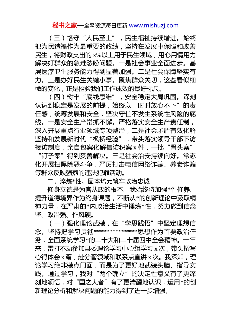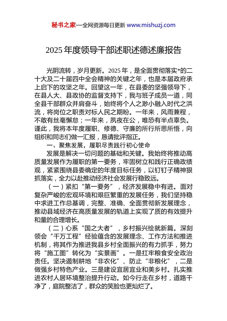 秘书之家—全网资源每日更新 www.mishuzj.com2025 年度领导干部述职述德述廉报告光阴流转,岁月更新。2025 年,是全面贯彻落实*的二十大及二十届四中全会精神的关键之年,也是本届政府承上启下的攻坚之年。回望这一年,在县委的坚强领导下,在县人大、县政协的监督支持下,我与班子成员一道,同全县干部群众并肩奋斗,始终将个人之渺小融入时代之洪流,将岗位之职责对标人民之期盼。一年来,风雨兼程,不敢有丝毫懈怠;一年来,夙夜在公,唯恐有半点辜负。谨此,我将本年度履职、修德、守廉的所行所思所悟,向组织和同志们做一汇报,恳请批评指正。一、聚焦发展,履职尽责践行初心使命发展是解决一切问题的基础和关键。我始终将推动高质量发展作为履职的第一要务,牢固树立和践行正确政绩观,紧紧围绕县委确定的年度目标任务,以钉钉子精神狠抓落实,全力以赴推动经济社会发展行稳致远。(一)紧扣“第一要务”,经济发展稳中有进。面对复杂严峻的宏观环境和艰巨繁重的发展任务,我们坚持稳中求进工作总基调,完整、准确、全面贯彻新发展理念,推动县域经济在高质量发展的轨道上实现了质的有效提升和量的合理增长。(二)心系“国之大者”,乡村振兴绘就新篇。深刻领会“千万工程”经验蕴含的发展理念、工作方法和推进机制,将其作为推进我县乡村全面振兴的有力抓手,努力将“施工图”转化为“实景画”。一是扛牢粮食安全政治责任。坚决遏制耕地“非农化”、防止“非粮化”,二是做强乡村特色产业。三是建设宜居宜业和美乡村。扎实推进农村人居环境整治提升行动。如今行走在乡村,道路干净了,庭院整洁了,群众的笑脸也更灿烂了。秘书之家—全网资源每日更新 www.mishuzj.com(三)恪守“人民至上”,民生福祉持续增进。始终把为民造福作为最重要的政绩,坚持在发展中保障和改善民生,将财政支出的 x%以上用于民生领域,用心用情用力解决好群众的急难愁盼问题。一是社会事业全面进步。基层医疗卫生服务能力得到显著加强。二是社会保障坚实有力。三是办好民生关键小事。聚焦群众关切,这些看似细微的变化,正是检验我们工作成效的最好标尺。(四)树牢“底线思维”,安全稳定大局巩固。深刻认识到稳定是发展的前提,始终以“时时放心不下”的责任感,统筹发展和安全,坚决守住不发生系统性风险的底线。一是安全生产常抓不懈。严格落实安全生产责任制,深入开展重点行业领域专项整治,二是社会矛盾有效化解坚持和发展新时代“枫桥经验”,带头落实领导干部下访接访制度,亲自包案化解信访积案 x 件,一批“骨头案”“钉子案”得到妥善解决。三是社会治安持续向好。常态化开展扫黑除恶斗争,严厉打击电信网络诈骗、养老诈骗等群众反映强烈的违法犯罪活动。二、淬炼*性,固本培元筑牢政治忠诚修身立德是为官从政的根本。我始终将加强*性修养、提升道德境界作为终身课题,不断从*的创新理论中汲取精神力量,在严肃的*内政治生活中锤炼*性,努力做到信念坚、政治强、作风硬。(一)强化理论武装,在“学思践悟”中坚定理想信念。坚持把学习贯彻**************思想作为首要政治任务,全面系统学习*的二十大和二十届四中全会精神。一年来,雷打不动参加县委理论学习中心组学习 x 次,带头撰写心得体会 x 篇,赴分管领域和联系点宣讲 x 次。我深知,理论学习绝非装点门面,而是为了更好地武装头脑、指导实践。通过学习,我对“两个确立”的决定性意义有了更深刻地领悟,对“国之大者”有了更清醒地认识,运用*的创新理论分析和解决问题的能力得到了进一步增强。秘书之家—全网资源每日更新 www.mishuzj.com(二)站稳政治立场,在“两个维护”中彰显绝对忠诚。把对*忠诚作为第一位的政治品格,深刻领悟“两个确立”的决定性意义,增强“四个意识”、坚定“四个自信”、做到“两个维护”。在实际工作中,始终同以***同志为核心的*中央保持高度一致,不折不扣推动中央、省委、市委和县委各项决策部署落地生根、开花结果。严格遵守*的政治纪律和政治规矩,在重大原则问题上头脑特别清醒眼睛特别明亮、立场特别坚定,坚决做到*中央提倡的坚决响应、*中央决定的坚决执行、*中央禁止...