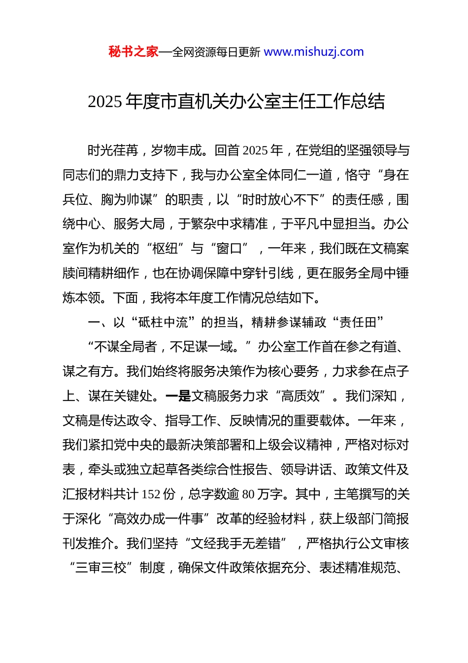 秘书之家—全网资源每日更新 www.mishuzj.com2025 年度市直机关办公室主任工作总结 时光荏苒,岁物丰成。回首 2025 年,在党组的坚强领导与同志们的鼎力支持下,我与办公室全体同仁一道,恪守“身在兵位、胸为帅谋”的职责,以“时时放心不下”的责任感,围绕中心、服务大局,于繁杂中求精准,于平凡中显担当。办公室作为机关的“枢纽”与“窗口”,一年来,我们既在文稿案牍间精耕细作,也在协调保障中穿针引线,更在服务全局中锤炼本领。下面,我将本年度工作情况总结如下。一、以“砥柱中流”的担当,精耕参谋辅政“责任田”“不谋全局者,不足谋一域。”办公室工作首在参之有道、谋之有方。我们始终将服务决策作为核心要务,力求参在点子上、谋在关键处。一是文稿服务力求“高质效”。我们深知,文稿是传达政令、指导工作、反映情况的重要载体。一年来,我们紧扣党中央的最新决策部署和上级会议精神,严格对标对表,牵头或独立起草各类综合性报告、领导讲话、政策文件及汇报材料共计 152 份,总字数逾 80 万字。其中,主笔撰写的关于深化“高效办成一件事”改革的经验材料,获上级部门简报刊发推介。我们坚持“文经我手无差错”,严格执行公文审核“三审三校”制度,确保文件政策依据充分、表述精准规范、秘书之家—全网资源每日更新 www.mishuzj.com格式严谨统一,全年制发公文差错率控制在万分之零点五以下,有力保障了政令畅通。二是信息报送务求“快准实”。我们致力于打造灵敏高效的“信息直通车”。依托建立健全的信息网络,聚焦全市中心工作和本单位重点任务,加强信息挖掘、综合研判。全年通过官方网站、政务新媒体等平台发布各类政务信息 4058 条,转载上级重大决策部署信息 796 条,制作图文政策解读 25 期。向市委、市政府办公厅报送的 48 条专报信息中,有 11 条获市领导批示肯定,为上级和本级党组洞察实情、科学决策提供了有价值的参考。三是调查研究追求“深透用”。“纸上得来终觉浅,绝知此事要躬行。”我们坚持问题导向,围绕优化营商环境、推进“数字机关”建设等年度重点课题,组织开展了 6 次专项调研。通过深入基层一线、走访服务对象、召开座谈会等形式,形成了《关于以数据共享赋能基层减负的调研报告》等 3 份有情况、有分析、有建议的调研成果,其中两项建议已转化为本单位的年度创新工作举措,切实推动了调研成果从“纸上”落到“地上”。二、以“穿针引线”的匠心,织密综合协调“保障网”“上下同欲者胜,同舟共济者赢。”办公室居于承上启下、协调左右的中枢位置,我们始终致力于构建顺畅高效的运行机制,凝聚干事创业的合力。一是会务组织突出“精细化”。我秘书之家—全网资源每日更新 www.mishuzj.com们秉持“会务无小事”的理念,全年服务保障党组会、局务会、专题部署会及全市性工作会议共计 89 场次。我们创新实施“会前清单预演、会中流程管控、会后复盘归档”的全链条管理模式。特别是在服务保障一场全国性现场会期间,我们牵头制定了详尽的“1+5”子方案,协调十余个内设及外部单位,确保了会议“零失误、零差错”,相关工作获得与会部委领导的高度认可。二是督查督办注重“刚性化”。我们坚决当好党组的“督办员”,确保各项决策部署落地生根。围绕年度《工作要点》分解的 127 项任务和上级巡察反馈的整改事项,建立“立项—交办—跟踪—反馈—销号”闭环管理台账。通过月度调度、专项检查、现场核查等方式开展集中督办 9 次,编发《督查通报》6 期,推动重点难点问题有效解决,确保了党组议定事项和领导批示要求件件有着落、事事有回音。三是内外协调强化“主动性”。对上加强请示汇报,及时准确传达精神、反映情况;对下加强指导联络,确保工作部署一贯到底;横向加强与兄弟单位、市直部门的沟通协作。全年牵头或参与协调处理跨部门、跨层级的综合性事务 40 余项。例如,在推动“公民身份信息变更一件事”落地过程中,我们主动协调公安、社保、医保等多个部门,组织召开联席会议 5 次,疏通堵点 3 处,最终促成该服务流程顺利上线,展现了办公室在复杂协调中的桥梁秘书之家—全网资源每日更...