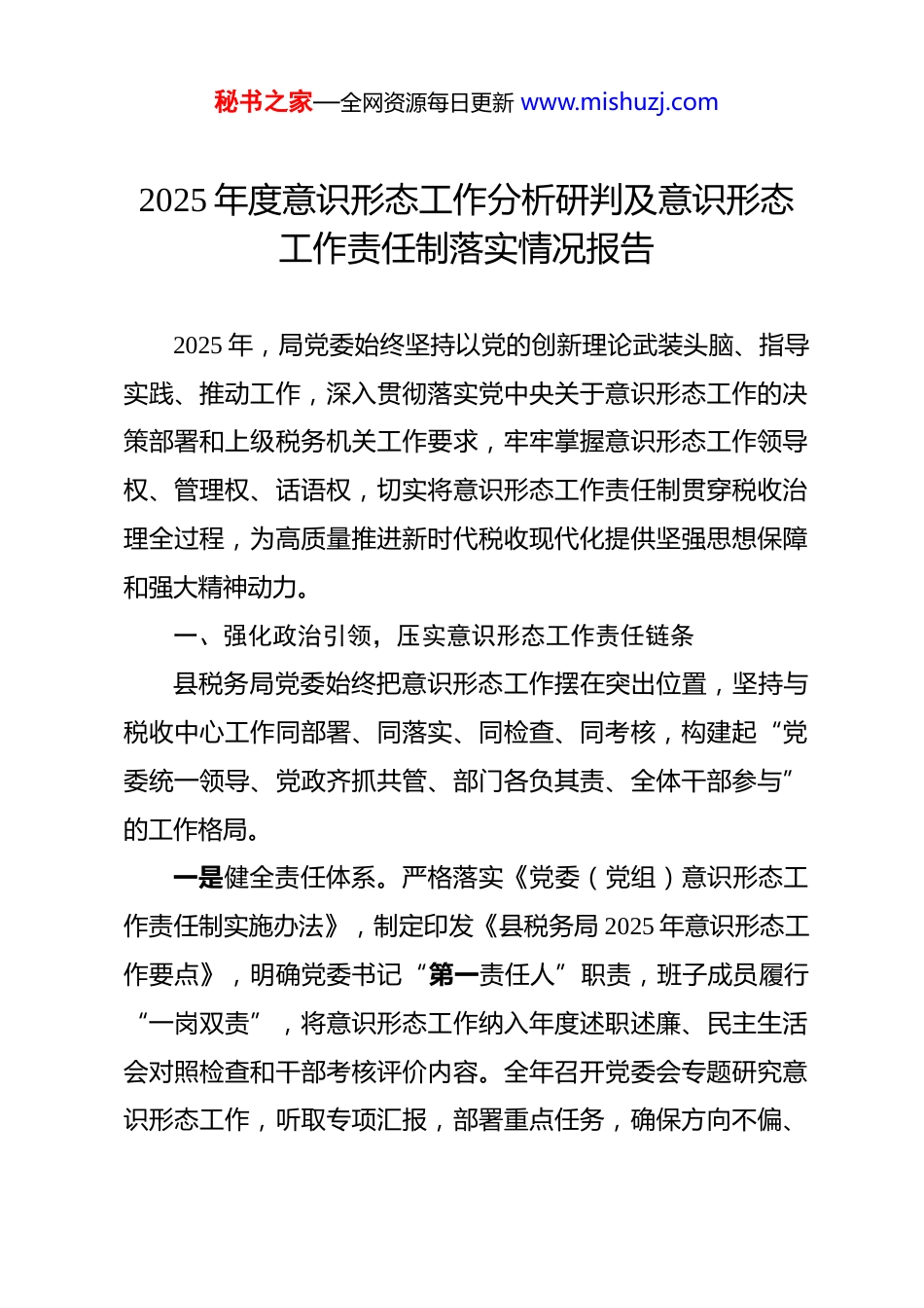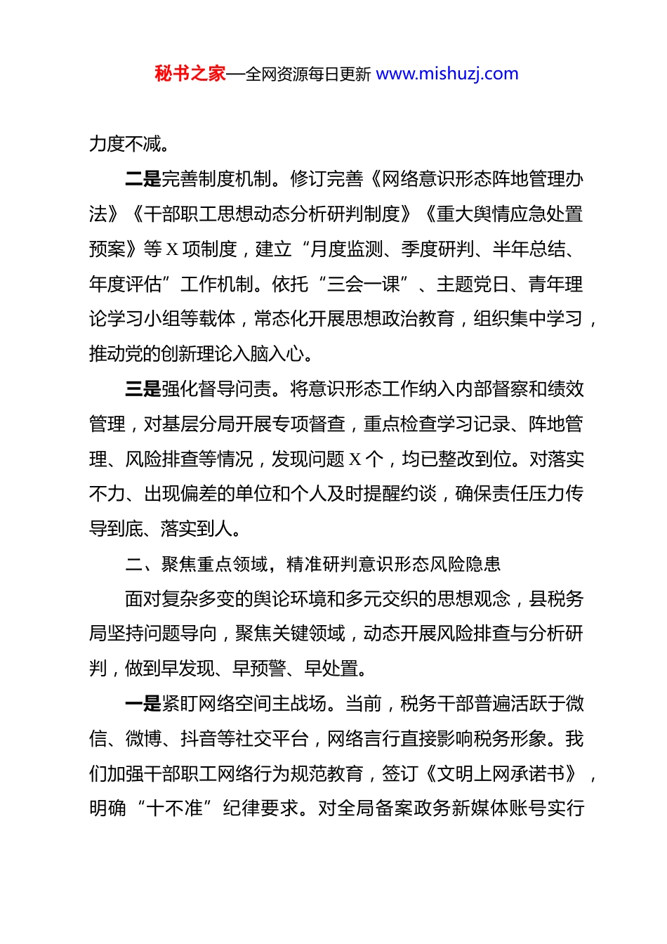 秘书之家—全网资源每日更新 www.mishuzj.com2025 年度意识形态工作分析研判及意识形态工作责任制落实情况报告 2025 年,局党委始终坚持以党的创新理论武装头脑、指导实践、推动工作,深入贯彻落实党中央关于意识形态工作的决策部署和上级税务机关工作要求,牢牢掌握意识形态工作领导权、管理权、话语权,切实将意识形态工作责任制贯穿税收治理全过程,为高质量推进新时代税收现代化提供坚强思想保障和强大精神动力。一、强化政治引领,压实意识形态工作责任链条县税务局党委始终把意识形态工作摆在突出位置,坚持与税收中心工作同部署、同落实、同检查、同考核,构建起“党委统一领导、党政齐抓共管、部门各负其责、全体干部参与”的工作格局。一是健全责任体系。严格落实《党委(党组)意识形态工作责任制实施办法》,制定印发《县税务局 2025 年意识形态工作要点》,明确党委书记“第一责任人”职责,班子成员履行“一岗双责”,将意识形态工作纳入年度述职述廉、民主生活会对照检查和干部考核评价内容。全年召开党委会专题研究意识形态工作,听取专项汇报,部署重点任务,确保方向不偏、秘书之家—全网资源每日更新 www.mishuzj.com力度不减。二是完善制度机制。修订完善《网络意识形态阵地管理办法》《干部职工思想动态分析研判制度》《重大舆情应急处置预案》等 X 项制度,建立“月度监测、季度研判、半年总结、年度评估”工作机制。依托“三会一课”、主题党日、青年理论学习小组等载体,常态化开展思想政治教育,组织集中学习,推动党的创新理论入脑入心。三是强化督导问责。将意识形态工作纳入内部督察和绩效管理,对基层分局开展专项督查,重点检查学习记录、阵地管理、风险排查等情况,发现问题 X 个,均已整改到位。对落实不力、出现偏差的单位和个人及时提醒约谈,确保责任压力传导到底、落实到人。二、聚焦重点领域,精准研判意识形态风险隐患面对复杂多变的舆论环境和多元交织的思想观念,县税务局坚持问题导向,聚焦关键领域,动态开展风险排查与分析研判,做到早发现、早预警、早处置。一是紧盯网络空间主战场。当前,税务干部普遍活跃于微信、微博、抖音等社交平台,网络言行直接影响税务形象。我们加强干部职工网络行为规范教育,签订《文明上网承诺书》,明确“十不准”纪律要求。对全局备案政务新媒体账号实行秘书之家—全网资源每日更新 www.mishuzj.com“三审三校”,全年发布信息,零差错、零舆情。同时,密切关注涉税网络舆情,建立“监测—研判—回应—反馈”闭环机制,成功稳妥处置 X 起苗头性舆情,有效防止炒作发酵。二是关注青年干部思想动态。开展“青税心声”专题调研,通过问卷、座谈、个别访谈等方式收集意见建议。发现部分青年存在职业倦怠、价值困惑等问题。对此,实施“青税领航”工程,选派业务骨干担任导师,组织“我与税收共成长”主题分享会 X 场,设立心理疏导热线,帮助青年扣好职业生涯“第一粒扣子”。三是防范外部渗透风险。结合税收执法、纳税服务、稽查办案等高风险岗位特点,排查廉政与意识形态交织风险点 X 个。在办税服务厅、税务所等窗口单位,强化服务规范和职业操守教育,杜绝因态度生硬、解释不清引发负面舆情。对涉税专业服务机构开展政策宣讲和合规提醒,严防借“税务筹划”之名传播错误思潮。四、建强宣传阵地,唱响新时代税务正能量阵地是意识形态工作的基本依托。县税务局坚持守土有责守土负责、守土尽责,管好用好各类宣传平台,讲好税务故事,传播主流价值。一是巩固传统阵地。高标准建设党建文化长廊、职工书屋、秘书之家—全网资源每日更新 www.mishuzj.com荣誉室等实体阵地,融入社会主义核心价值观、中国税务精神等元素。更新宣传栏 X 期,张贴政策解读、先进典型、廉洁警示等内容,让干部在潜移默化中受教育、受熏陶。办税服务厅设置“政策明白卡”“便民服务角”,成为政策宣传和民意收集的前沿窗口。二是拓展线上矩阵。优化微信公众号功能,开设“税政速递”“便民办税”“榜样力量”等栏目,全年推送原创稿件 X篇,阅读量超 X 万次。制作短视频《减税降费暖企行》《税惠助农丰收忙...