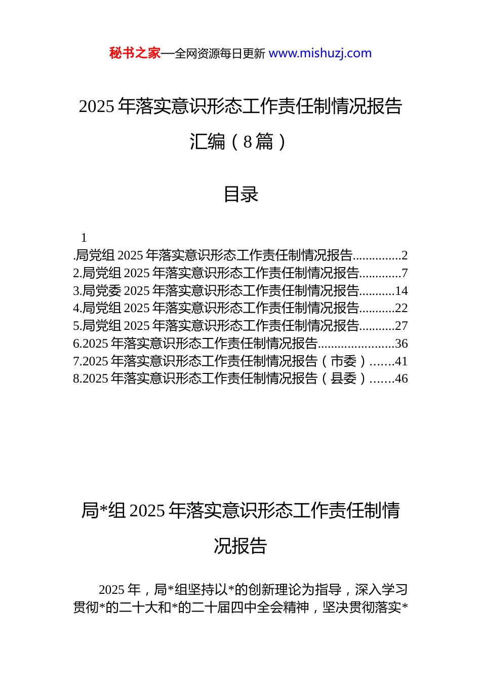 秘书之家—全网资源每日更新 www.mishuzj.com2025 年落实意识形态工作责任制情况报告汇编(8 篇)目录1.局党组 2025 年落实意识形态工作责任制情况报告...............22.局党组 2025 年落实意识形态工作责任制情况报告.............73.局党委 2025 年落实意识形态工作责任制情况报告...........144.局党组 2025 年落实意识形态工作责任制情况报告...........225.局党组 2025 年落实意识形态工作责任制情况报告...........276.2025 年落实意识形态工作责任制情况报告.......................367.2025 年落实意识形态工作责任制情况报告(市委).......418.2025 年落实意识形态工作责任制情况报告(县委).......46局*组 2025 年落实意识形态工作责任制情况报告2025 年,局*组坚持以*的创新理论为指导,深入学习贯彻*的二十大和*的二十届四中全会精神,坚决贯彻落实*秘书之家—全网资源每日更新 www.mishuzj.com中央关于意识形态工作的决策部署和省委、市委工作要求牢牢把握“意识形态工作是为国家立心、为民族立魂的工作”这一根本定位,切实履行*组主体责任,把意识形态工作纳入全局工作同部署、同落实、同检查、同考核,坚持守土有责、守土负责、守土尽责,有效筑牢人社领域意识形态安全防线,为推动全市人社事业高质量发展提供坚强思想保障和强大精神力量。现将有关情况报告如下:一、强化政治统领,压实意识形态工作责任链条局*组始终把意识形态工作摆在极端重要的位置,坚持*管意识形态原则不动摇,切实扛起政治责任。一是健全责任体系。年初专题研究意识形态工作,制定《2025 年市人社局*组意识形态工作要点》和《意识形态工作责任清单》,明确*组书记“第一责任人”职责、班子成员“一岗双责”要求,将意识形态工作纳入年度述职述廉、民主生活会和组织生活会重要内容,形成“*组统一领导、书记负总责、分管领导具体抓、科室(单位)协同落实”的工作格局。全年召开*组会议专题研究意识形态工作 x 次,分析研判风险隐患 x 次,确保方向不偏、阵地不丢。二是强化制度执行。严格落实《*委(*组)意识形态工作责任制实施办法》及省、市实施细则,修订完善舆情应对、信息发布、网络评论员管理等制度 x 项,建立“月调度、季研判、年考核”机制,将意识形态工作纳入绩效考核体系,权重占比 x%,做到可量化、可检查、可追责。三是深化理论武装。坚持把学习*的创新理论作为首要政治任务,严格落实“第一议题”制度,组织*组理论学习中心组学习 x 次,专题学习******关于意识形态工作的重要论述、关于宣传思想文化工作的****精神等内容,引导*员干部深刻把握意识形态领域新形势新任务,不断增强政治判断力、政治领悟力、政治执行力。二、聚焦主责主业,推动意识形态与业务深度融合坚持把意识形态工作融入人社业务全过程各方面,以秘书之家—全网资源每日更新 www.mishuzj.com思想引领保障政策落地、服务民生。一是筑牢政策宣传主阵地。围绕就业创业、社会保障、人才人事、劳动关系等重点工作,构建“线上+线下”立体化宣传矩阵。依托“x市人社”微信公众号、官网等平台发布政策解读、办事指南、典型案例等信息 x 余条,阅读量超 x 万人次;组织开展“政策进园区、进社区、进高校”宣讲活动 x 场,发放宣传资料 x 万余份,确保惠民政策“飞入寻常百姓家”。特别是在高校毕业生就业服务季、城乡居民养老保险集中缴费期等关键节点,提前策划主题宣传,有效引导社会预期,营造积极向上舆论氛围。二是守好服务窗口意识形态前沿。全市 x 个人社服务窗口全部设立“*员先锋岗”“政策宣传角”,将意识形态要求融入窗口服务规范,要求工作人员在解答政策、办理业务时,既要讲清“怎么办”,也要讲透“为什么”,自觉传递*和政府的关怀与温度。加强对窗口人员意识形态培训 x 次,覆盖 x 人次,确保服务过程成为宣传*的主张、凝聚群众共识的生动课堂。三是强化舆情风险防控。建立“监测—研判—处置—反馈”闭环机制,对涉及就业歧视、社保待遇、欠薪维权等敏感话题实行 xx 小时网络舆情监测,全年妥善处置苗头性、倾向性舆情 x 起,做到早发...