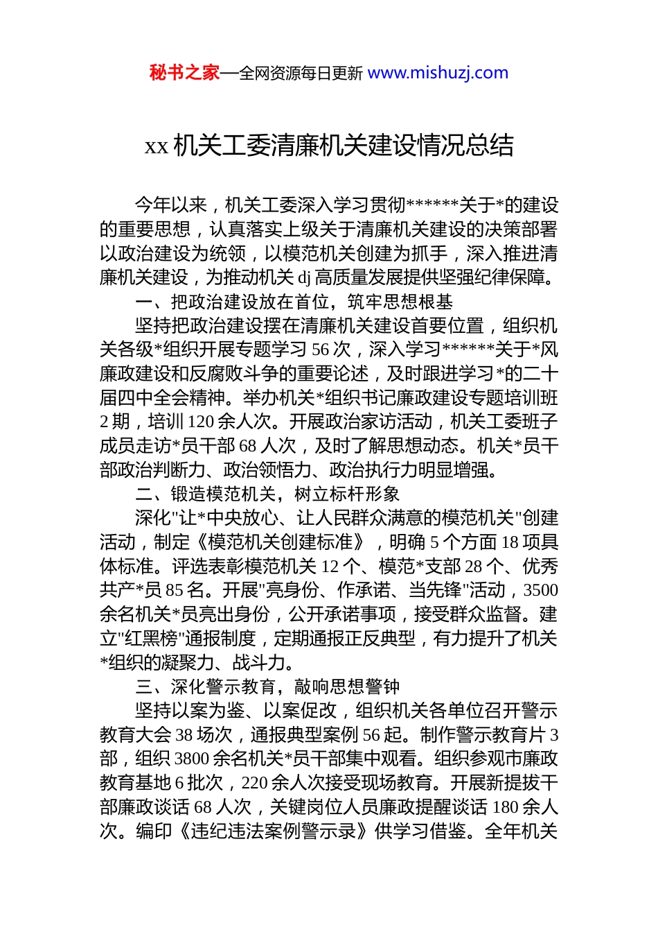 秘书之家—全网资源每日更新 www.mishuzj.comxx 机关工委清廉机关建设情况总结今年以来,机关工委深入学习贯彻******关于*的建设的重要思想,认真落实上级关于清廉机关建设的决策部署以政治建设为统领,以模范机关创建为抓手,深入推进清廉机关建设,为推动机关 dj 高质量发展提供坚强纪律保障。一、把政治建设放在首位,筑牢思想根基坚持把政治建设摆在清廉机关建设首要位置,组织机关各级*组织开展专题学习 56 次,深入学习******关于*风廉政建设和反腐败斗争的重要论述,及时跟进学习*的二十届四中全会精神。举办机关*组织书记廉政建设专题培训班2 期,培训 120 余人次。开展政治家访活动,机关工委班子成员走访*员干部 68 人次,及时了解思想动态。机关*员干部政治判断力、政治领悟力、政治执行力明显增强。二、锻造模范机关,树立标杆形象深化"让*中央放心、让人民群众满意的模范机关"创建活动,制定《模范机关创建标准》,明确 5 个方面 18 项具体标准。评选表彰模范机关 12 个、模范*支部 28 个、优秀共产*员 85 名。开展"亮身份、作承诺、当先锋"活动,3500余名机关*员亮出身份,公开承诺事项,接受群众监督。建立"红黑榜"通报制度,定期通报正反典型,有力提升了机关*组织的凝聚力、战斗力。三、深化警示教育,敲响思想警钟坚持以案为鉴、以案促改,组织机关各单位召开警示教育大会 38 场次,通报典型案例 56 起。制作警示教育片 3部,组织 3800 余名机关*员干部集中观看。组织参观市廉政教育基地 6 批次,220 余人次接受现场教育。开展新提拔干部廉政谈话 68 人次,关键岗位人员廉政提醒谈话 180 余人次。编印《违纪违法案例警示录》供学习借鉴。全年机关秘书之家—全网资源每日更新 www.mishuzj.com系统违纪违法案件同比下降 35%。四、健全内控机制,扎紧制度笼子坚持用制度管权管事管人,开展廉政风险排查,梳理风险点 126 个,制定防控措施 238 条。建立健全"三重一大"决策、财务管理、政府采购等重点领域制度 32 项,修订完善制度 15 项。推行"小微权力清单"制度,将权力事项逐一列出清单,明确运行流程。对 12 个机关单位开展专项审计,发现问题 28 个,督促整改到位。完善"第一种形态"运用机制,开展提醒谈话、批评教育等 280 余人次,做到抓早抓小、防微杜渐。五、夯实作风建设,锤炼过硬队伍扎实开展学习教育,持之以恒落实中央八项规定精神,驰而不息纠治"四风"。组织开展专题学习研讨 15 场次。开展形式主义、官僚主义专项整治,梳理问题清单 35 项,已完成整改 32 项。严格控制会议文件,机关发文、开会同比分别减少 18%和 22%。深化"我为群众办实事"实践活动,机关各单位承诺办实事 156 项,已完成 142 项。开展作风明察暗访 8 次,查处违反中央八项规定精神问题 12 起,通报曝光典型案例 6 起。机关作风明显转变,干事创业精气神持续提振。六、厚植廉洁文化,营造清风正气大力加强廉洁文化建设,举办"清廉机关大家谈"主题征文活动,收到作品 268 篇,评选优秀作品 50 篇结集成册。开展"廉政文化进机关"系列活动,组织廉政书法、绘画、摄影作品展 3 场,廉政文艺演出 5 场。在机关办公楼宇打造廉政文化长廊 8 处,设置展板 180 余块。开设"清风讲堂",邀请专家授课 12 期,听课 1500 余人次。在机关内网开设"清廉机关"专栏,发布廉政资讯 86 期。建立"家庭助廉"机制,向*员干部家属发送廉政提醒信 320 余封。廉洁文化建设润物无声,崇廉尚洁、风清气正的良好氛围日益浓厚。七、压实主体责任,强化责任担当秘书之家—全网资源每日更新 www.mishuzj.com坚持把主体责任扛在肩上、抓在手上,层层传导压力。机关工委与各机关单位*组织签订《*风廉政建设责任书》56 份,明确责任清单,实行项目化管理。建立机关单位*组织书记抓*风廉政建设述职评议制度。完善"一岗双责"责任体系,要求领导班子成员既抓业务工作,又抓分管领域*风廉政建设。建立责任追究机制,全年约谈机关单位主要负责人 15 人次,对 2 个单位主要负责人进行诫勉谈话。开展*风廉政建设责任制检查...