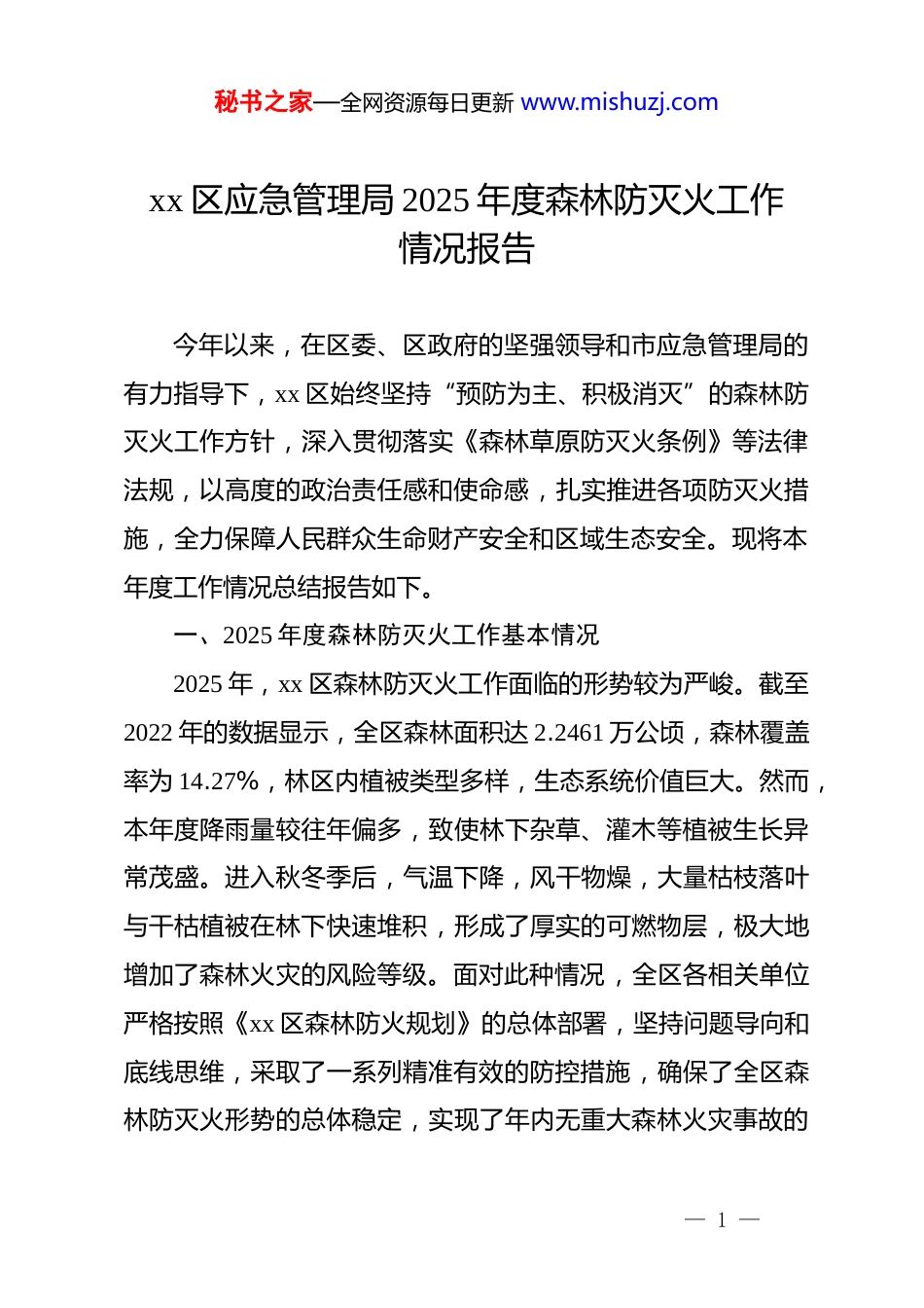 秘书之家—全网资源每日更新 www.mishuzj.comxx 区应急管理局 2025 年度森林防灭火工作情况报告今年以来,在区委、区政府的坚强领导和市应急管理局的有力指导下,xx 区始终坚持“预防为主、积极消灭”的森林防灭火工作方针,深入贯彻落实《森林草原防灭火条例》等法律法规,以高度的政治责任感和使命感,扎实推进各项防灭火措施,全力保障人民群众生命财产安全和区域生态安全。现将本年度工作情况总结报告如下。一、2025 年度森林防灭火工作基本情况2025 年,xx 区森林防灭火工作面临的形势较为严峻。截至2022 年的数据显示,全区森林面积达 2.2461 万公顷,森林覆盖率为 14.27%,林区内植被类型多样,生态系统价值巨大。然而,本年度降雨量较往年偏多,致使林下杂草、灌木等植被生长异常茂盛。进入秋冬季后,气温下降,风干物燥,大量枯枝落叶与干枯植被在林下快速堆积,形成了厚实的可燃物层,极大地增加了森林火灾的风险等级。面对此种情况,全区各相关单位严格按照《xx 区森林防火规划》的总体部署,坚持问题导向和底线思维,采取了一系列精准有效的防控措施,确保了全区森林防灭火形势的总体稳定,实现了年内无重大森林火灾事故的— 1 —秘书之家—全网资源每日更新 www.mishuzj.com目标。(一)精准施策,源头治理火灾隐患坚持把隐患排查和可燃物清理作为森林防火工作的基础性根本性环节来抓,通过科学规划与精细化作业,从源头上降低火灾发生风险。一是聚焦重点区域,开展大规模可燃物清理。针对 xx 森林公园等重点防火区域面积广、林下可燃物载量大的突出问题,相关镇街单位自 11 月下旬起,组织开展了为期十余天的集中清理专项行动。本次行动科学制定了作业方案,综合运用机械化与人工作业相结合的方式。据统计,行动期间累计出动旋耕机械 60 余台次、投入作业人员 160 余人次,对防火通道两侧及核心林区的 2600 余亩重点地块进行了深度旋耕处理。通过此项作业,将地表的枯枝落叶、杂草等易燃物彻底翻埋入土壤中,不仅直接消除了火灾隐患,还起到了变废为宝、改善土质的生态效益。对于旋耕机械无法进入的复杂地形区域,则组织专业队伍进行人工清除,确保可燃物清理工作的全覆盖、无死角,有效切断了火灾发生的物质基础。二是常态化推进,巩固隐患治理成效。在完成集中清理的基础上,建立了常态化巡查与动态清理机制。各级林业管护人员和巡护队伍将可燃物复积情况作为日常巡查的重点内容之一,— 2 —秘书之家—全网资源每日更新 www.mishuzj.com一旦发现新增可燃物堆积,立即组织力量进行清除,防止隐患反弹。同时,结合气象条件和火险等级预警,动态调整清理工作的重点和频次,确保在关键时期、关键区域的火灾隐患始终处于可控状态。(二)立体防控,构建全天候监测预警体系深刻认识到“打早、打小、打了”是扑救森林火灾的关键本年度,xx 区着力构建了“人防+技防”深度融合的立体化监测预警网络,显著提升了对林区火情的早期发现和快速反应能力。在人防层面,建立了覆盖全区的网格化巡护责任体系。全区共配备了 224 名森林防火及巡护兼职人员,他们分片包干,深入林区一线。特别是在 xx 森林公园等高风险区域,每日固定安排 3 辆巡查车、15 名专业巡查人员,进行不间断、拉网式巡逻检查。巡查重点包括排查违规野外用火、祭祀用火等行为,监测林下可燃物的动态变化,以及检查防火设施的完好情况,确保人力巡防的广度与深度。在技防层面,充分利用现代科技手段赋能森林防火。依托部署在林区制高点的视频监控系统、卫星遥感林火监测平台以及无人机空中巡查等先进技术,构建了一个全天候、全覆盖、无盲区的智能化监测网络。高点监控系统能够对林区进行 7×24— 3 —秘书之家—全网资源每日更新 www.mishuzj.com小时不间断视频监控,一旦出现烟点、火点,系统将自动识别并发出警报;卫星遥感监测则能从宏观层面捕捉热点异常,为早期预警提供决策依据;无人机航拍巡查凭借其机动灵活的优势,可对重点区域进行高精度、近距离的侦查,有效弥补了地面巡护和固定监控的不足。这一“空天地”一体化的监测体系,实现了对火灾隐患的实时发...