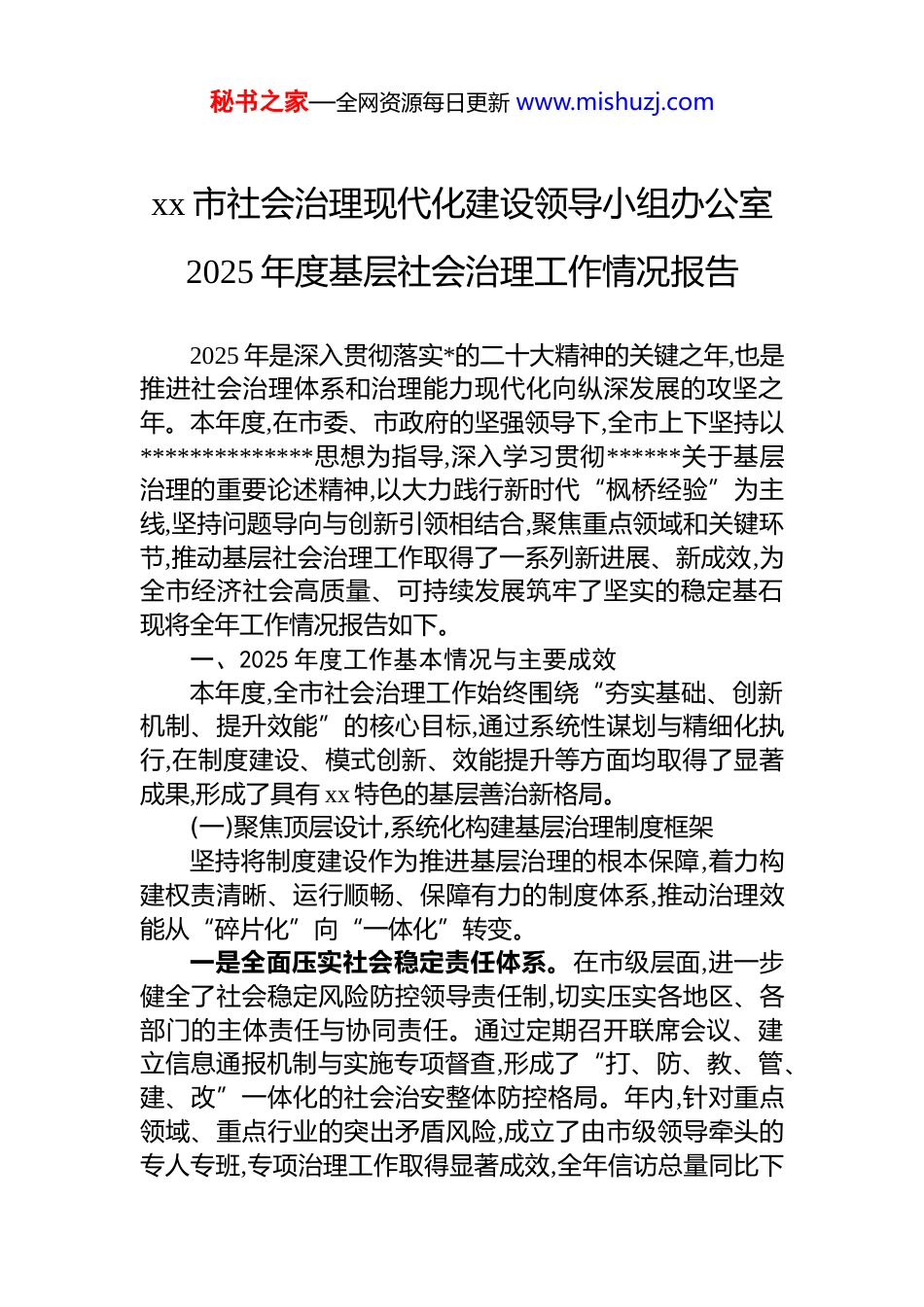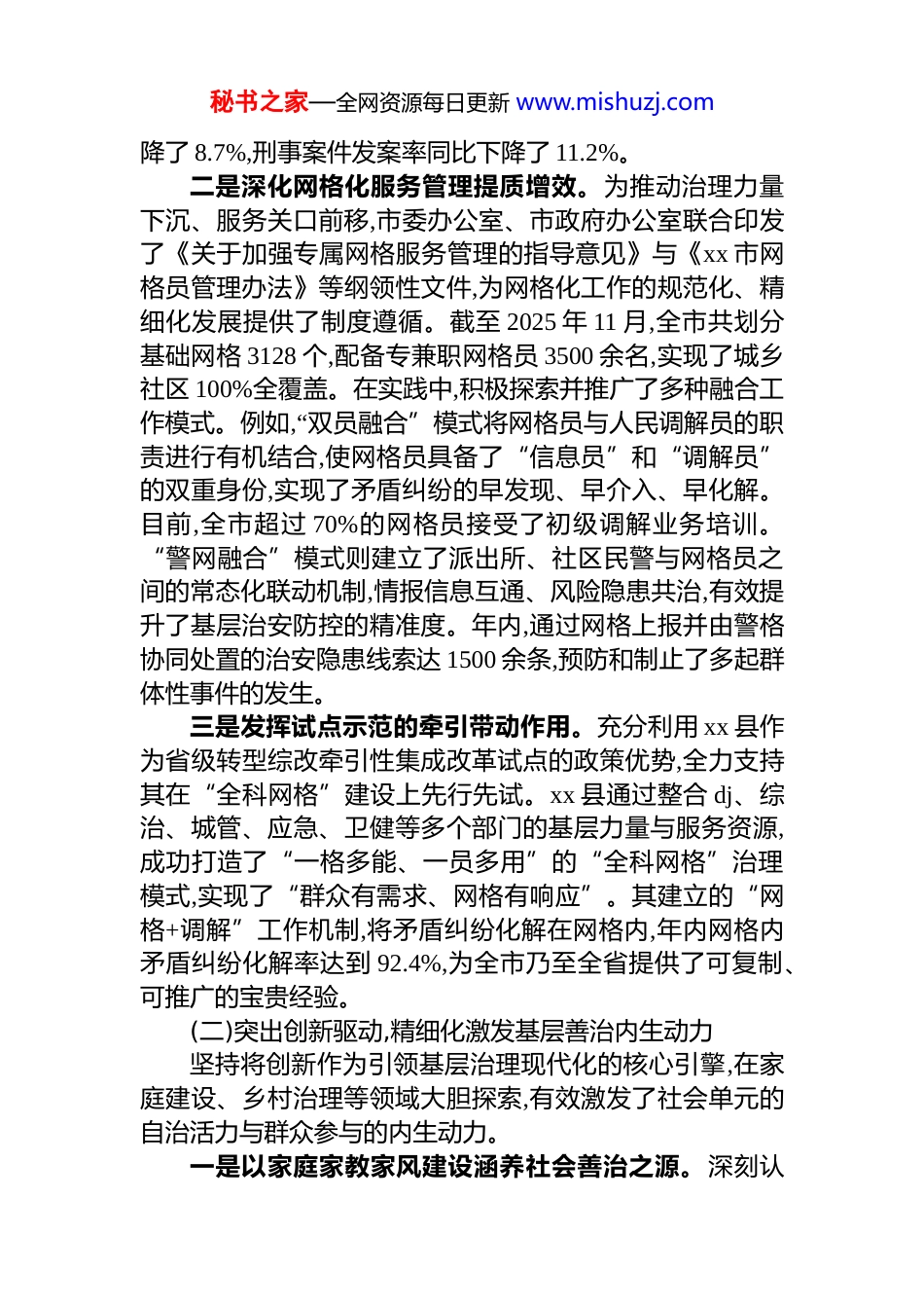 秘书之家—全网资源每日更新 www.mishuzj.comxx 市社会治理现代化建设领导小组办公室2025 年度基层社会治理工作情况报告2025 年是深入贯彻落实*的二十大精神的关键之年,也是推进社会治理体系和治理能力现代化向纵深发展的攻坚之年。本年度,在市委、市政府的坚强领导下,全市上下坚持以**************思想为指导,深入学习贯彻******关于基层治理的重要论述精神,以大力践行新时代“枫桥经验”为主线,坚持问题导向与创新引领相结合,聚焦重点领域和关键环节,推动基层社会治理工作取得了一系列新进展、新成效,为全市经济社会高质量、可持续发展筑牢了坚实的稳定基石现将全年工作情况报告如下。一、2025 年度工作基本情况与主要成效本年度,全市社会治理工作始终围绕“夯实基础、创新机制、提升效能”的核心目标,通过系统性谋划与精细化执行,在制度建设、模式创新、效能提升等方面均取得了显著成果,形成了具有 xx 特色的基层善治新格局。(一)聚焦顶层设计,系统化构建基层治理制度框架坚持将制度建设作为推进基层治理的根本保障,着力构建权责清晰、运行顺畅、保障有力的制度体系,推动治理效能从“碎片化”向“一体化”转变。一是全面压实社会稳定责任体系。在市级层面,进一步健全了社会稳定风险防控领导责任制,切实压实各地区、各部门的主体责任与协同责任。通过定期召开联席会议、建立信息通报机制与实施专项督查,形成了“打、防、教、管、建、改”一体化的社会治安整体防控格局。年内,针对重点领域、重点行业的突出矛盾风险,成立了由市级领导牵头的专人专班,专项治理工作取得显著成效,全年信访总量同比下秘书之家—全网资源每日更新 www.mishuzj.com降了 8.7%,刑事案件发案率同比下降了 11.2%。二是深化网格化服务管理提质增效。为推动治理力量下沉、服务关口前移,市委办公室、市政府办公室联合印发了《关于加强专属网格服务管理的指导意见》与《xx 市网格员管理办法》等纲领性文件,为网格化工作的规范化、精细化发展提供了制度遵循。截至 2025 年 11 月,全市共划分基础网格 3128 个,配备专兼职网格员 3500 余名,实现了城乡社区 100%全覆盖。在实践中,积极探索并推广了多种融合工作模式。例如,“双员融合”模式将网格员与人民调解员的职责进行有机结合,使网格员具备了“信息员”和“调解员”的双重身份,实现了矛盾纠纷的早发现、早介入、早化解。目前,全市超过 70%的网格员接受了初级调解业务培训。“警网融合”模式则建立了派出所、社区民警与网格员之间的常态化联动机制,情报信息互通、风险隐患共治,有效提升了基层治安防控的精准度。年内,通过网格上报并由警格协同处置的治安隐患线索达 1500 余条,预防和制止了多起群体性事件的发生。三是发挥试点示范的牵引带动作用。充分利用 xx 县作为省级转型综改牵引性集成改革试点的政策优势,全力支持其在“全科网格”建设上先行先试。xx 县通过整合 dj、综治、城管、应急、卫健等多个部门的基层力量与服务资源,成功打造了“一格多能、一员多用”的“全科网格”治理模式,实现了“群众有需求、网格有响应”。其建立的“网格+调解”工作机制,将矛盾纠纷化解在网格内,年内网格内矛盾纠纷化解率达到 92.4%,为全市乃至全省提供了可复制、可推广的宝贵经验。(二)突出创新驱动,精细化激发基层善治内生动力坚持将创新作为引领基层治理现代化的核心引擎,在家庭建设、乡村治理等领域大胆探索,有效激发了社会单元的自治活力与群众参与的内生动力。一是以家庭家教家风建设涵养社会善治之源。深刻认秘书之家—全网资源每日更新 www.mishuzj.com识到家庭是社会最基本的细胞,也是基层治理的最小单元。年内,我市在全国范围内率先出台并实施《进一步健全发挥家庭家教家风建设在基层治理中作用的 12 项机制》,该工作经验成功入选 2024 年全国社会治理创新实践案例。该机制的核心在于,通过对婚姻家庭中夫妻、亲子、婆媳(翁婿)、邻里这“四对法律关系”的清晰界定与法理普及,增强家庭结构的内在稳定性。同时,将自治的柔性、法治的刚性与德治的引领性深度融合于家庭家教家风建设的全过程,从根源上夯实平安建设的基石。为推动机制落地...