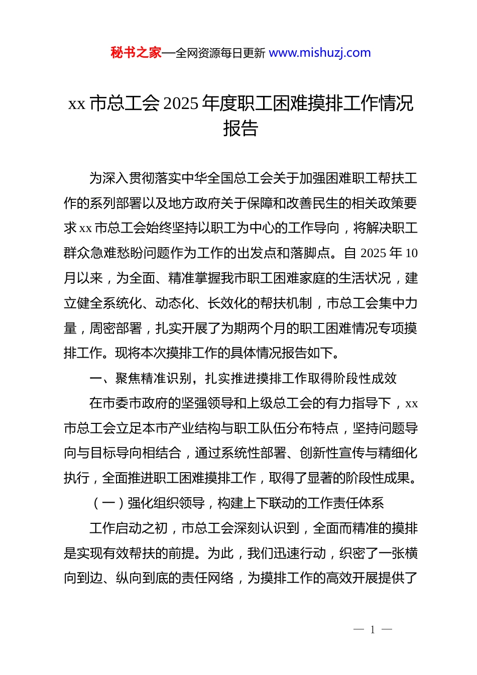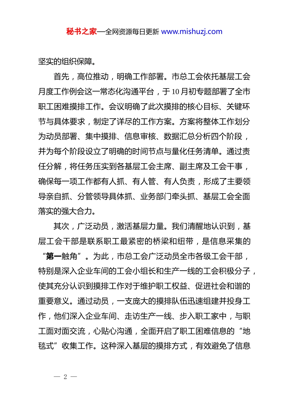 秘书之家—全网资源每日更新 www.mishuzj.comxx 市总工会 2025 年度职工困难摸排工作情况报告为深入贯彻落实中华全国总工会关于加强困难职工帮扶工作的系列部署以及地方政府关于保障和改善民生的相关政策要求 xx 市总工会始终坚持以职工为中心的工作导向,将解决职工群众急难愁盼问题作为工作的出发点和落脚点。自 2025 年 10月以来,为全面、精准掌握我市职工困难家庭的生活状况,建立健全系统化、动态化、长效化的帮扶机制,市总工会集中力量,周密部署,扎实开展了为期两个月的职工困难情况专项摸排工作。现将本次摸排工作的具体情况报告如下。一、聚焦精准识别,扎实推进摸排工作取得阶段性成效在市委市政府的坚强领导和上级总工会的有力指导下,xx市总工会立足本市产业结构与职工队伍分布特点,坚持问题导向与目标导向相结合,通过系统性部署、创新性宣传与精细化执行,全面推进职工困难摸排工作,取得了显著的阶段性成果。(一)强化组织领导,构建上下联动的工作责任体系工作启动之初,市总工会深刻认识到,全面而精准的摸排是实现有效帮扶的前提。为此,我们迅速行动,织密了一张横向到边、纵向到底的责任网络,为摸排工作的高效开展提供了— 1 —秘书之家—全网资源每日更新 www.mishuzj.com坚实的组织保障。首先,高位推动,明确工作部署。市总工会依托基层工会月度工作例会这一常态化沟通平台,于 10 月初专题部署了全市职工困难摸排工作。会议明确了此次摸排的核心目标、关键环节与具体要求,制定了详尽的工作方案。方案将整体工作划分为动员部署、集中摸排、信息审核、数据汇总分析四个阶段,并为每个阶段设立了明确的时间节点与量化任务清单。通过责任分解,将任务压实到各基层工会主席、副主席及工会干事,确保每一项工作都有人抓、有人管、有人负责,形成了主要领导亲自抓、分管领导具体抓、业务部门牵头抓、基层工会全面落实的强大合力。其次,广泛动员,激活基层力量。我们清醒地认识到,基层工会干部是联系职工最紧密的桥梁和纽带,是信息采集的“第一触角”。为此,市总工会广泛动员全市各级工会干部,特别是深入企业车间的工会小组长和生产一线的工会积极分子,使其充分认识到摸排工作对于维护职工权益、促进社会和谐的重要意义。通过动员,一支庞大的摸排队伍迅速组建并投身工作,他们深入企业车间、走访生产一线、步入职工家中,与职工面对面交流,心贴心沟通,全面开启了职工困难信息的“地毯式”收集工作。这种深入基层的摸排方式,有效避免了信息— 2 —秘书之家—全网资源每日更新 www.mishuzj.com传递的衰减和失真,确保了摸排工作底数清、覆盖全、情况明,为后续的精准施策筑牢了坚不可摧的数据基础。(二)创新宣传方式,实现帮扶政策与职工需求的精准对接为确保国家的帮扶政策和工会的关怀能够精准触达每一位潜在的困难职工,市总工会在此次摸排工作中,着力创新宣传载体与话语体系,全力打通政策传递的“最后一公里”,实现了从“单向灌输”到“双向互动”的深刻转变。一方面,拓展线上渠道,实现政策即时解读。我们充分利用数字化时代的传播优势,依托覆盖全市各企事业单位的数百个基层工会微信工作群,开展了形式新颖的“帮扶政策在线问答”活动。市总工会权益保障部的业务骨干在群内定期发布政策图解、短视频等通俗易懂的宣传材料,并以问答形式,实时解答基层工会干部和职工群众关于帮扶条件、申报流程、所需材料等具体问题。这种即时互动的模式,极大地提高了政策解读的效率和精准度,让抽象的政策条文变得具体可感,有效激发了职工了解政策、运用政策的主动性。另一方面,深化线下服务,实现政策上门找人。为覆盖无法熟练使用智能手机的老年职工或特殊岗位职工,我们同步开展了扎实的线下宣传。市总工会统一设计并印制了数万份《xx— 3 —秘书之家—全网资源每日更新 www.mishuzj.com市职工困难帮扶服务指南》。该指南内容详实、语言质朴,系统梳理了生活救助、子女助学、大病救助、法律援助等各项帮扶政策。随后,组织工会干部、志愿者组成多支“政策宣传小分队”,深入我市各大工业园区、重点骨干企业、零工聚集的工...